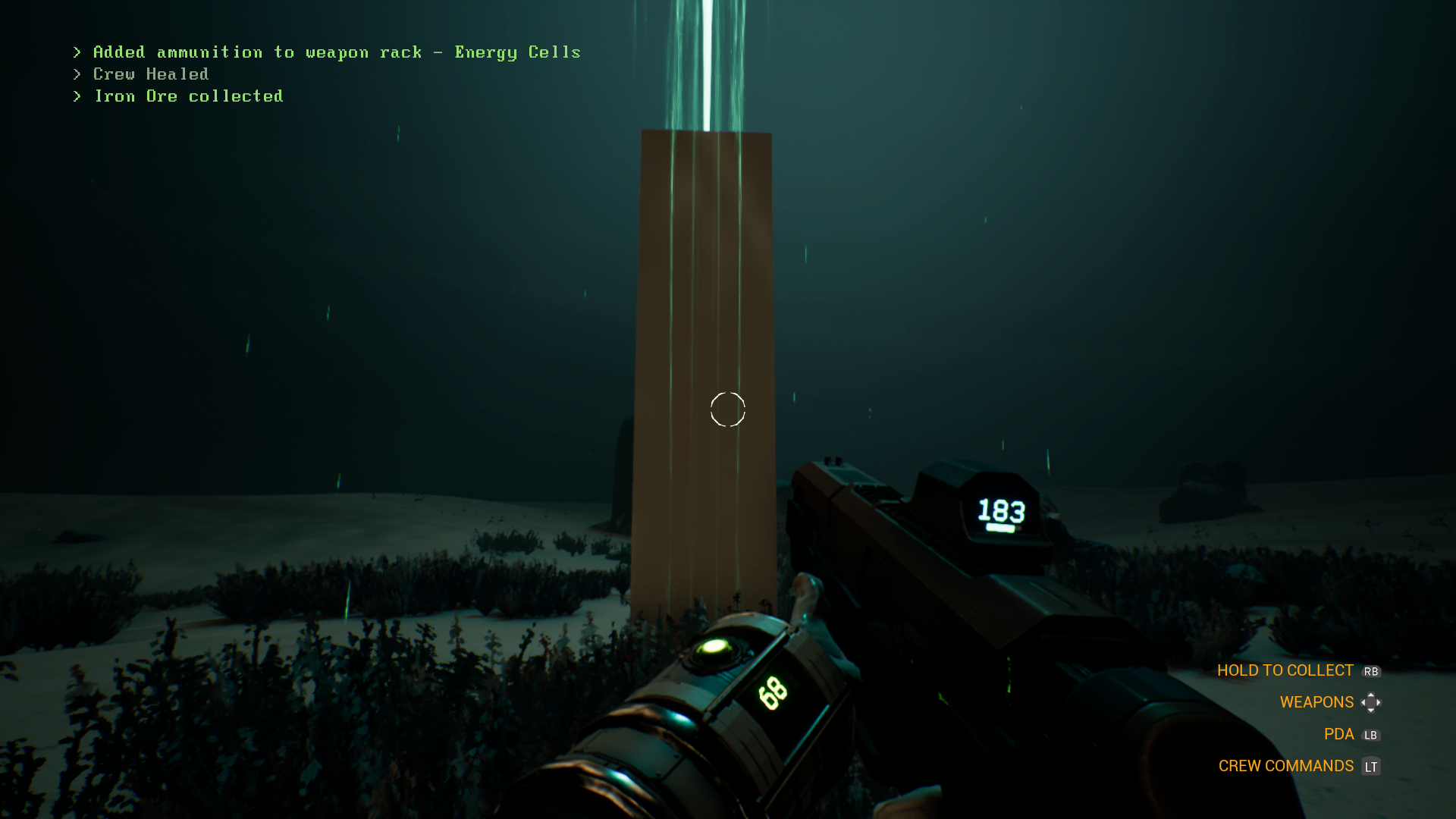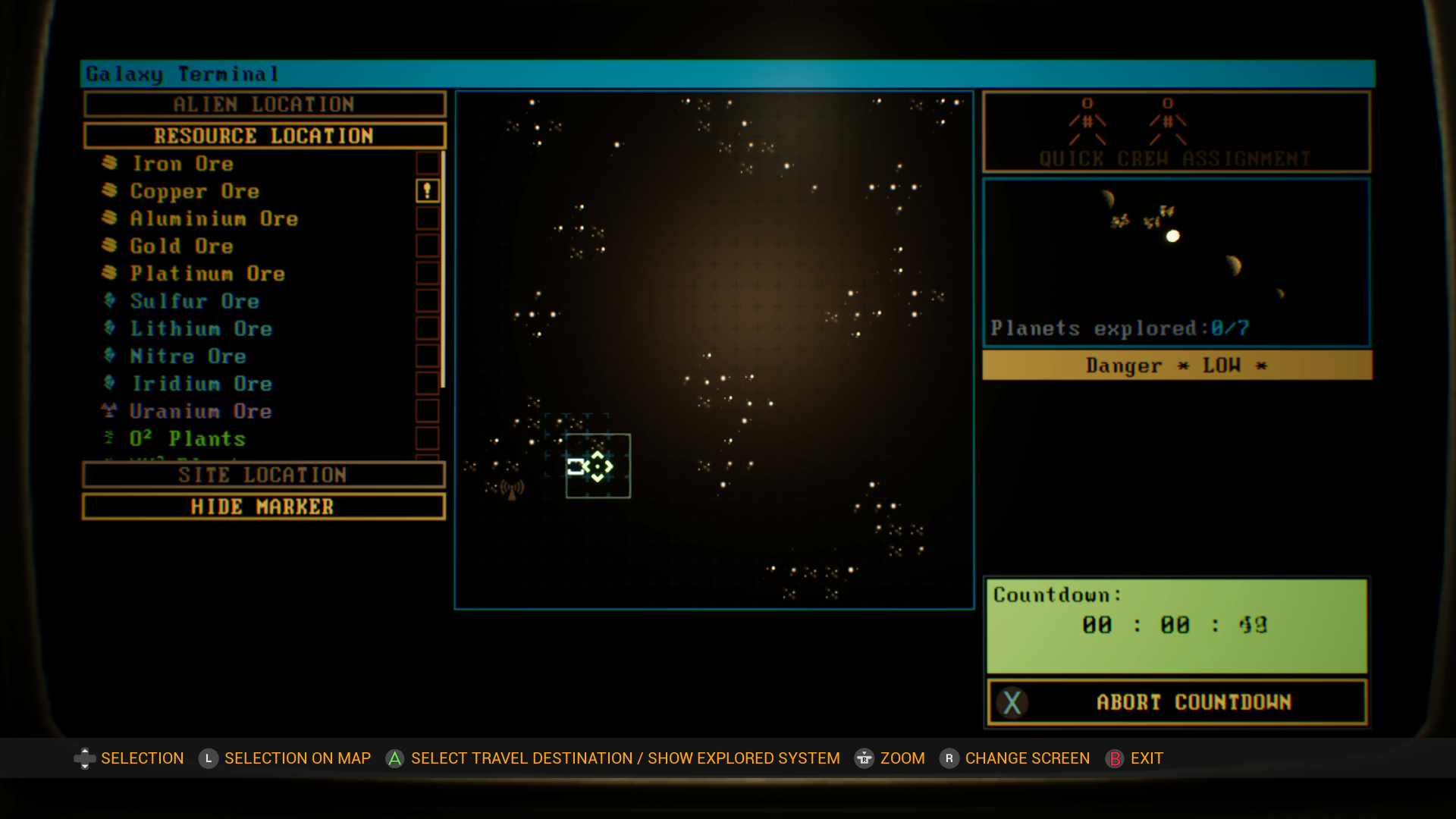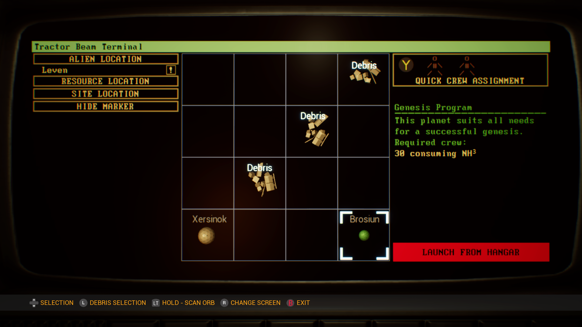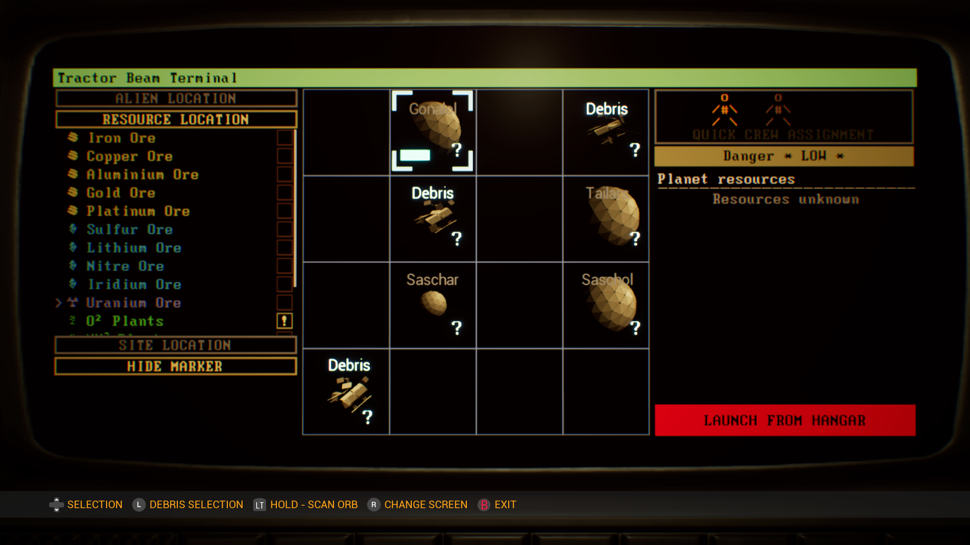 Za każdym razem gdy trafiamy do nowego sektora widzimy tylko rozkład planet i śmieci. By poznać co w sobie kryją musimy je przeskanować lub zaryzykować i polecieć na dane planety. Zbieranie zasobów odbywa się na dwa sposoby. Po pierwsze możemy wybrać się na planetę. Nie musimy się tam osobiście zjawić, możemy tam wysłać część naszej załogi, lecz gdy wybierzemy się z nimi to mamy możliwość ustalania priorytetu, który z dostępnych zasobów ma być zabrany na pokład w pierwszej kolejności – wahadłowiec ma ograniczone zasoby. Oprócz surowców na planetach znajdziemy obcych ich broniących i lokacje. Ich zeskanowanie daje nam dodatkowe perki lub nowe bronie czy moduły statku. Dodatkowo możemy znaleźć różne rośliny, produkujące różne gazy. Ich znaczenie wyjaśnię za chwilę. Całość obszaru, który możemy zbadać jest ograniczona do okręgu wokół wahadłowca. Bariera nie jest fizyczna, lecz wyjście po za nią oznacza szybką śmierć. I tu się pojawiają pierwsze zgrzyty. Planety są po prostu nudne. Po zbadaniu dziesięciu wygląda to jak by były cztery różne schematy do nich i wybierany jeden z nich. Zasoby to skały z wystającymi kryształami w adekwatnym kolorze. Co gorsze zawsze są w zasięgu paru metrów od statku. Lokacje? Tu też nie ma szaleństwa. Po paru całość zmienia się w najzwyklejszy grind. Druga metoda pozyskania zasobów to kosmiczne śmieci. Jeszcze nudniejsze niż odwiedzanie planet. Całość polega na udaniu się do pomieszczenia z tractor beam. Wybraniu sektora i czekaniu na rezultat. Efekt końcowy to albo więcej zasobów na pokładzie statku, albo obcy.