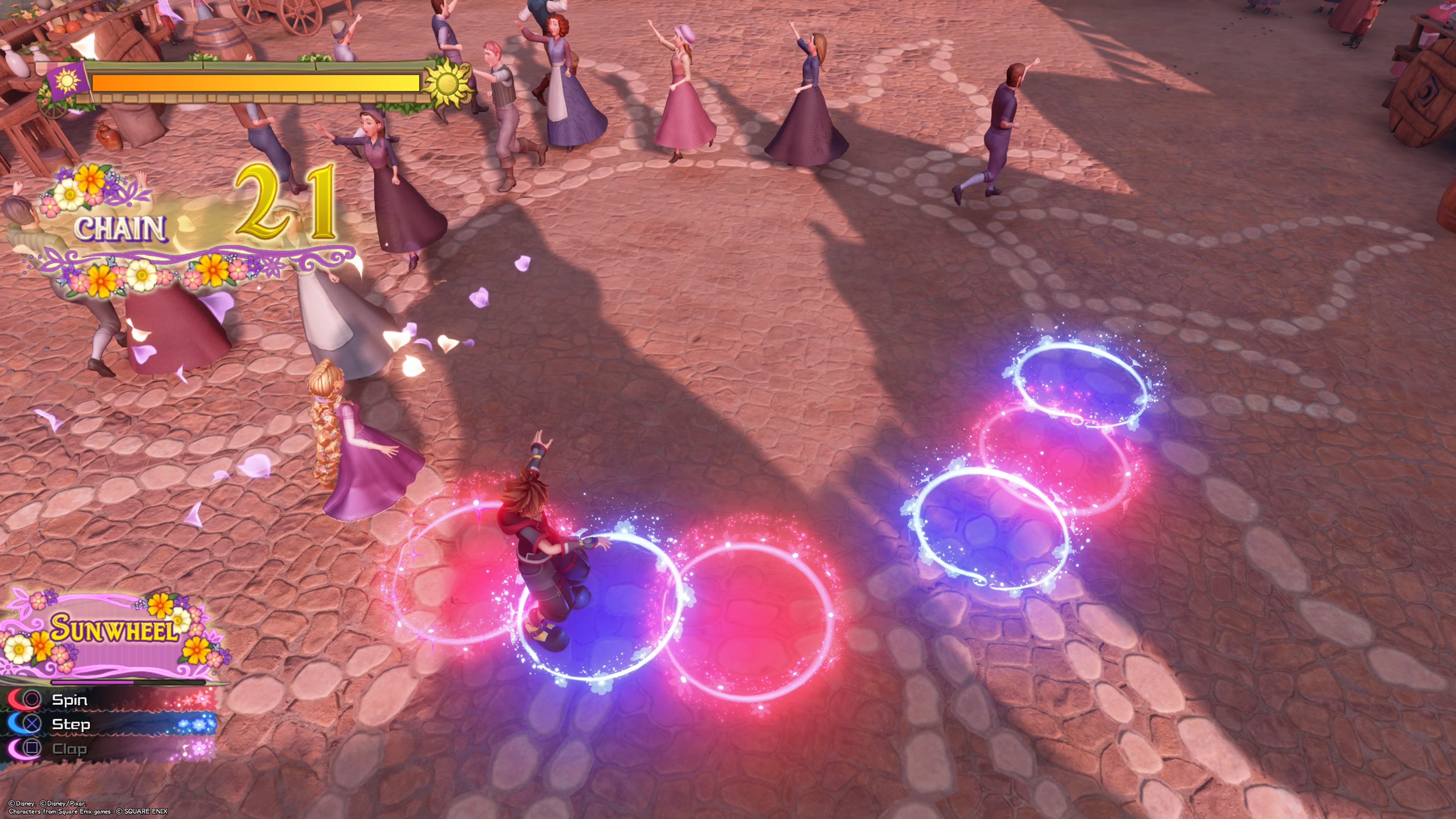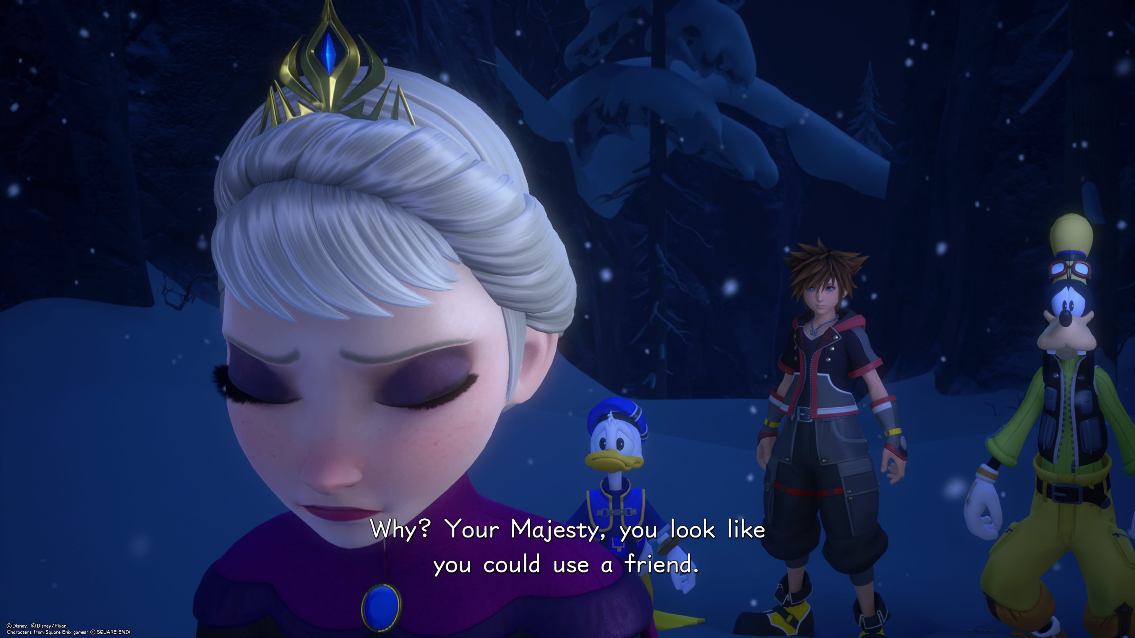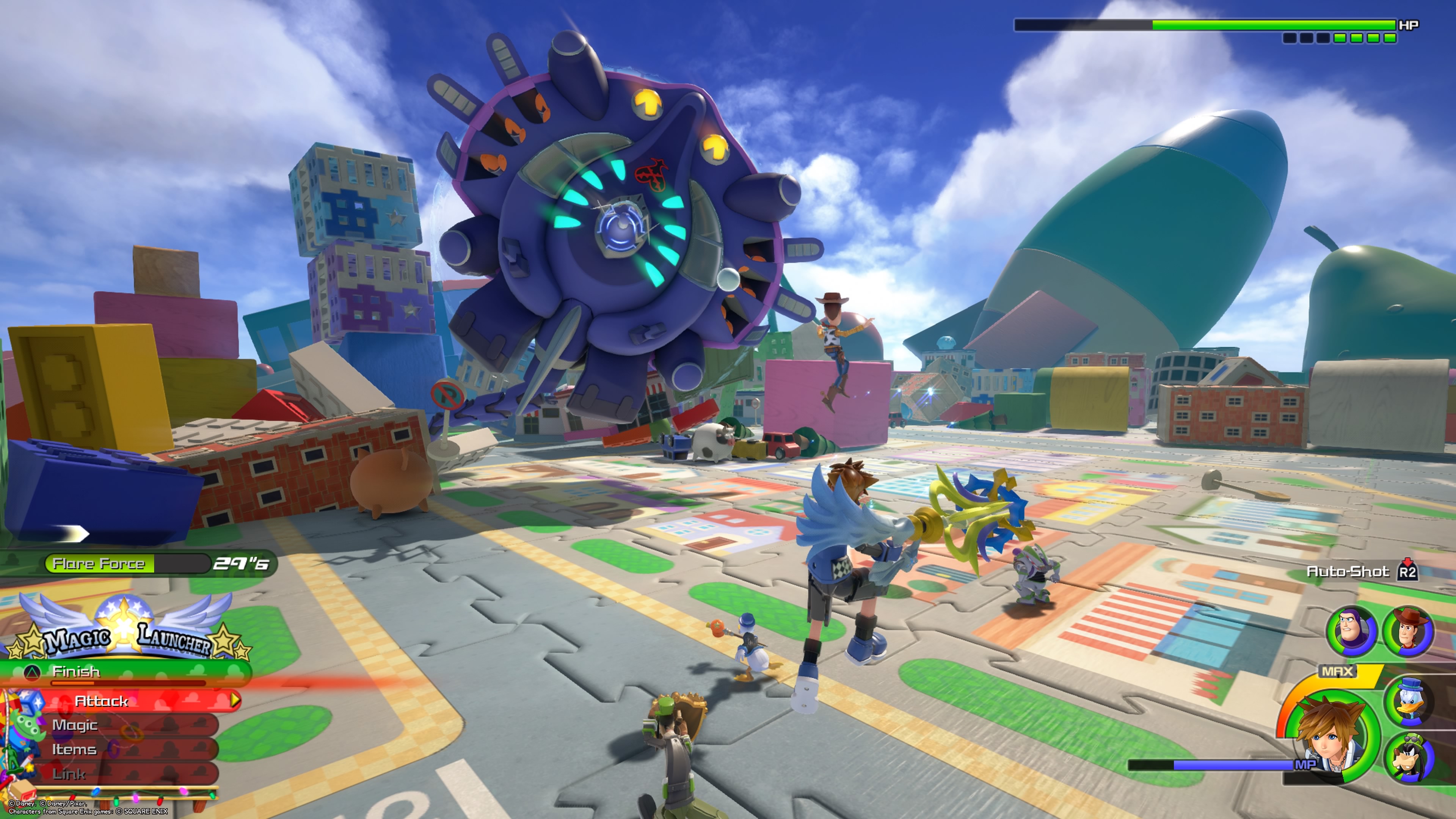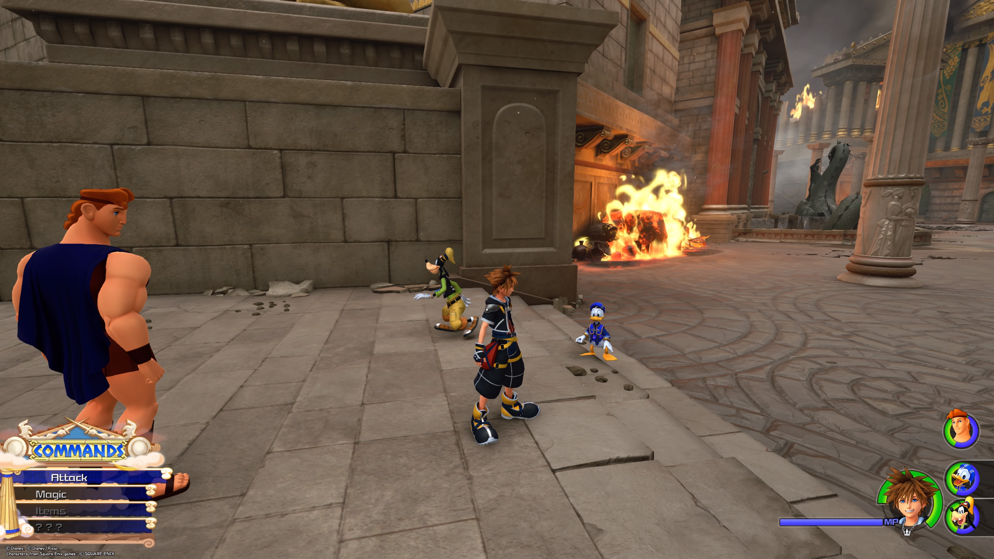 Przez całą grę w walce pomagają nam towarzysze. Tym razem jednak Donald I Goofy są z nami przez cały czas, a postaci z danego świata po prostu dołączają do naszego zespołu, tworząc momentami pięcioosobowe drużyny. To ruch w dobrą stronę, bo nie musimy wybierać między podstawowymi pomocnikami. No i poprawiono zdecydowanie AI naszych kompanów. Wydaje mi się, że tej odsłonie są oni zdecydowanie bardziej pomocni. W menu gry możemy także dostosować sobie ich zachowanie.