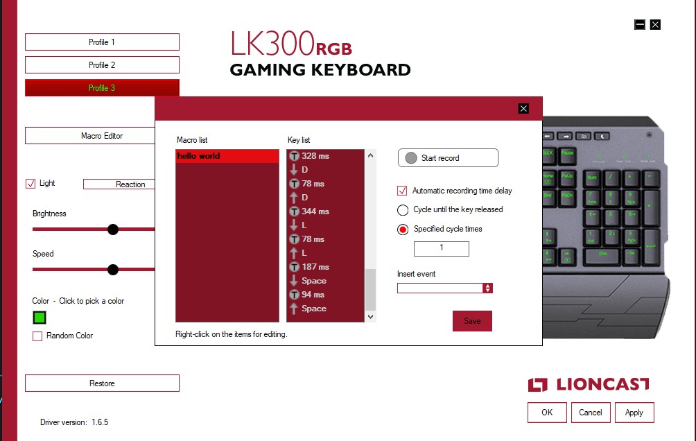 Oprogramowanie to najsłabszy element tej klawiatury. Po pierwsze wygląda jak by było na szybko poskładane. Jest nieintuicyjne i dobór zielonej czcionki na tle czerwonych przycisków sprawia, że wszystko jest nieczytelne. Wszelkie wprowadzone zmiany są widoczne dopiero po kliknięciu Apply. Strasznie upierdliwe przy ustawianiu kolorów podświetlania. Klawiatura ma wbudowaną pamięć, która przechowuje trzy profile.
