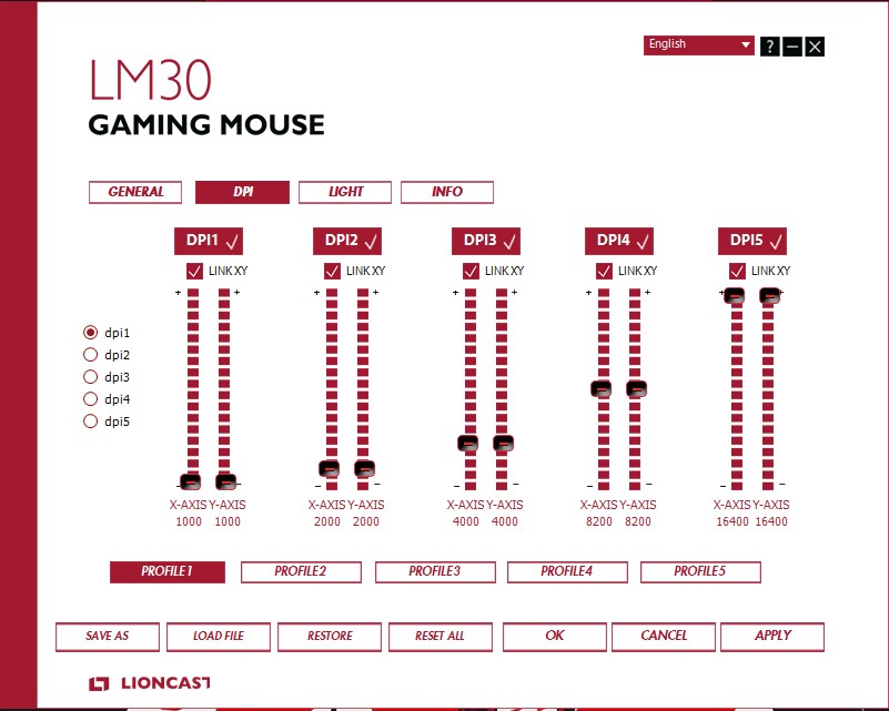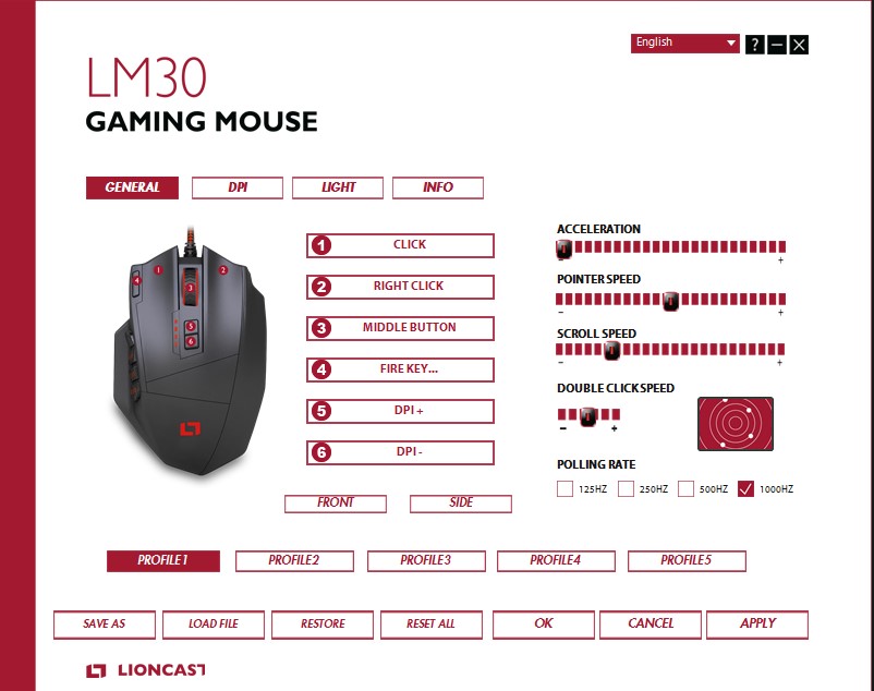 Myszka na szczęście ma trochę lepsze oprogramowanie do konfiguracji. Przez lepsze mam na myśli czytelniejsze. Tu zastosowano białą czcionkę na tle czerwonych klawiszy, a nasze akcje od razu są przesyłane do gryzonia gdzie na szybko możemy przetestować czy to co ustawiliśmy nam pasuje. Jedyną sporą wadą jest ustawianie kolorów. Nie wiedzieć czemu Lioncast zdecydował, że podświetlanie scrolla jest z góry ustalone i przypisane do profilu. Każdy z pięciu dostępnych profili ma zgróry ustalony kolor scrolla, którego nie możemy zmienić. Kolor pozostałych elementów zmieniamy jednym kliknięciem. Nie możemy wybrać innego koloru dla logo, a innego dla klawiszy z lewej. Możemy jeszcze ustalić jasność i prędkość pulsowania, lub całkowicie je wyłączyć.