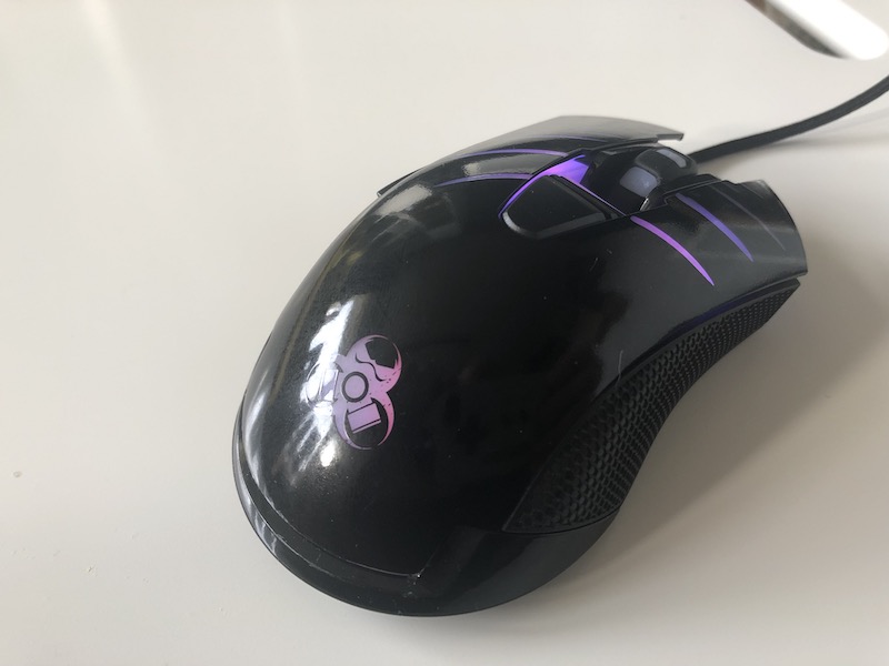 Myszka, w przeciwieństwie do klawiatury, wykonana jest z śliskiego i błyszczącego plastiku. Też się świeci w różnych kolorach, które zmieniają się cyklicznie. Wyposażona jest w standardowy zestaw przycisków. Nad kołem do scrollowania znajdziemy także przycisk do zmiany DPI. Myszka dobrze leży w dłoni, chociaż materiał na bokach jest dość nieprzyjemny w dotyku.