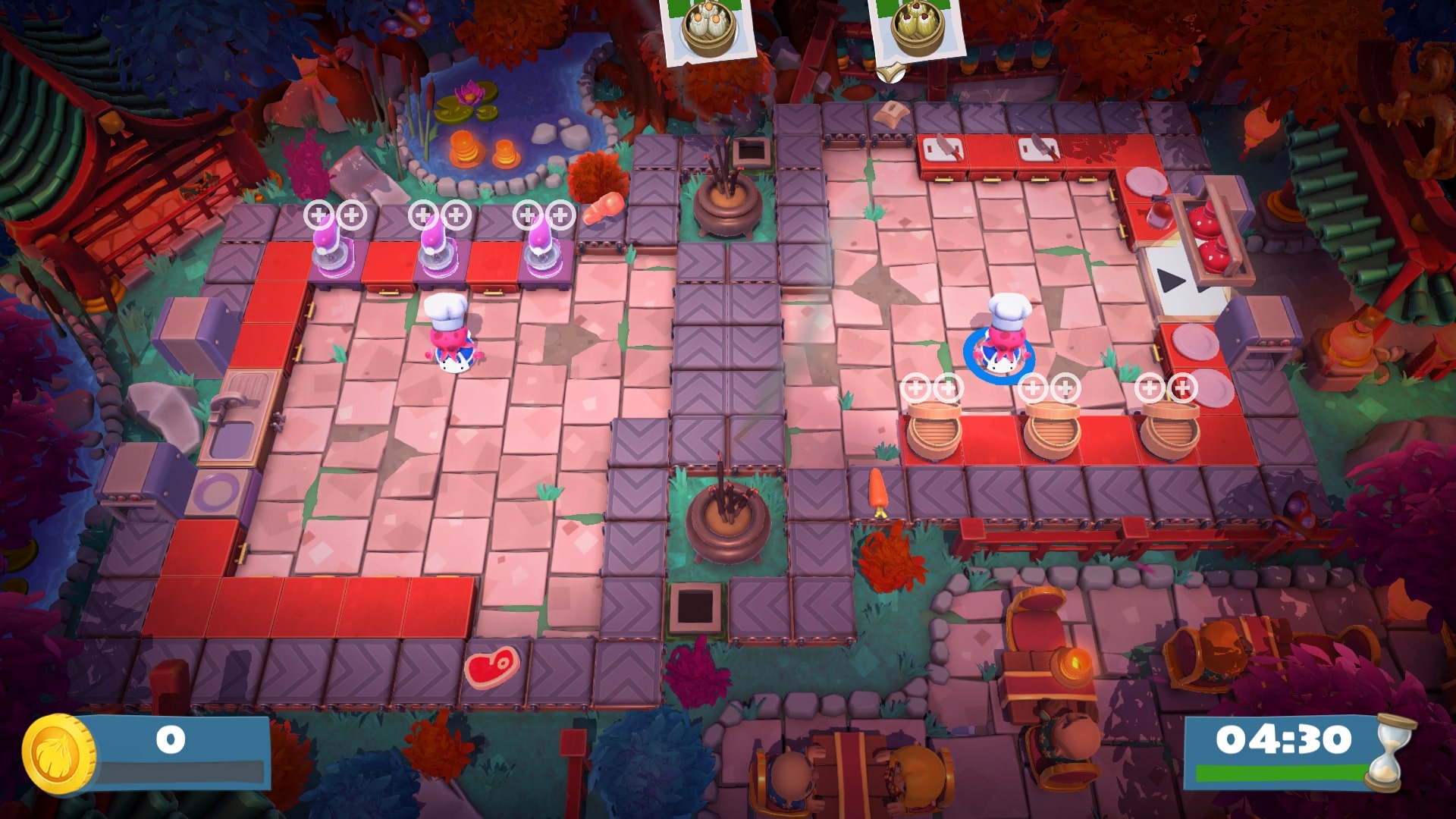 Otwartych portali jest na razie 2, choć miejsca jest na 6. Pierwszy z nich przenosi do świątecznej aktualizacji, drugi do tej najnowszej, z okazji Chińskiego Nowego Roku. Każda z aktualizacji to nowe kuchnie (czyli plansze), nowe przepisy i nowe mechanizmy. W Chińskim Nowym Roku będziemy mieć wok i przygotowywane tam makarony. Pojawią się również owocowe sałatki! Za przechodzenie aktualizacji dostaniemy nowe skórki i mnóstwo frajdy.