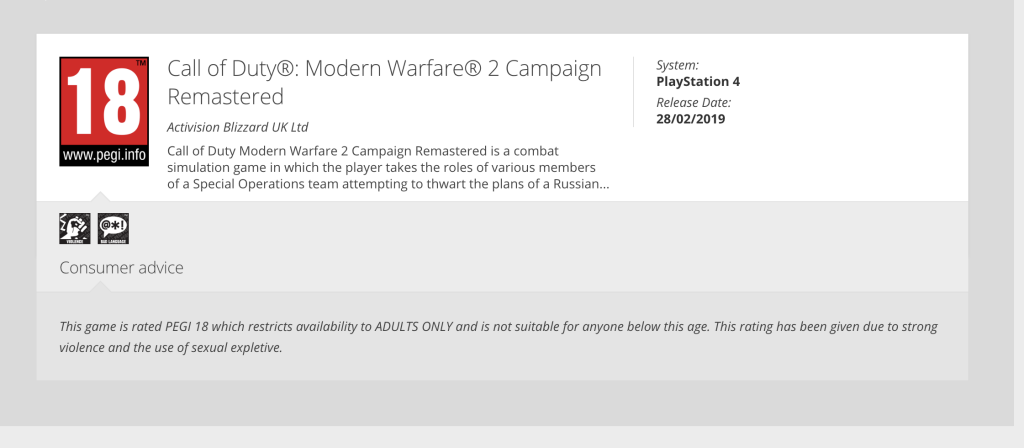 Pan European Game Information, to organizacja zajmująca się przyznawaniem odpowiednich oznaczeń wiekowych dla gier wideo. Dzisiejszej nocy na ich stronie pojawiła się informacja, że Call of Duty: Modern Warfare 2 Campaign Remastered miałby trafić w tym roku na PlayStation 4.
