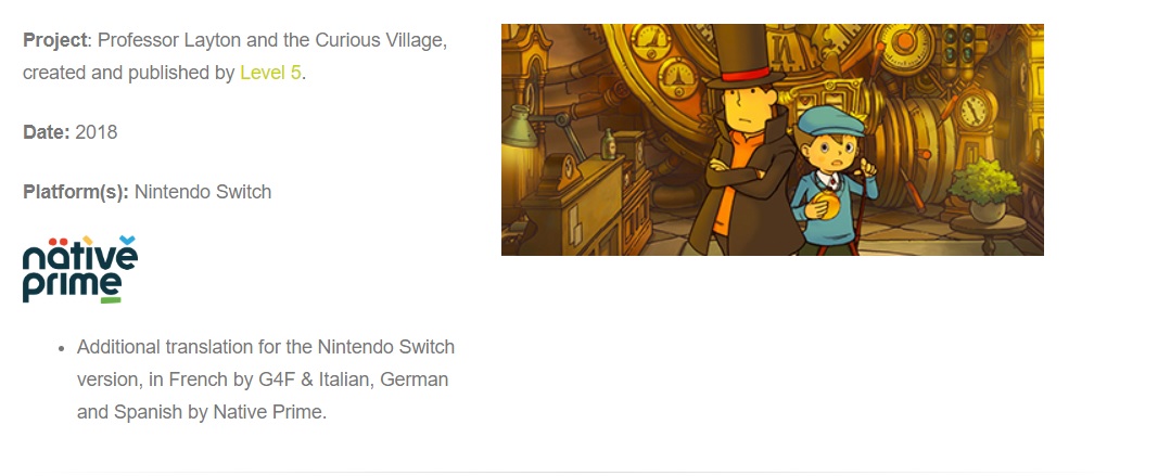 Firma G4F Localisation zajmuje się lokalizacją gier na język francuski. Na jej stronie znalazł się wpis dotyczący gry Professor Layton and the Curious Village dla Nintendo Switch. Według opisu, w zeszłym roku powstały cztery dodatkowe wersje językowe dla produkcji: francuska (od G4F), włoska, niemiecka i hiszpańska (od Native Prime).