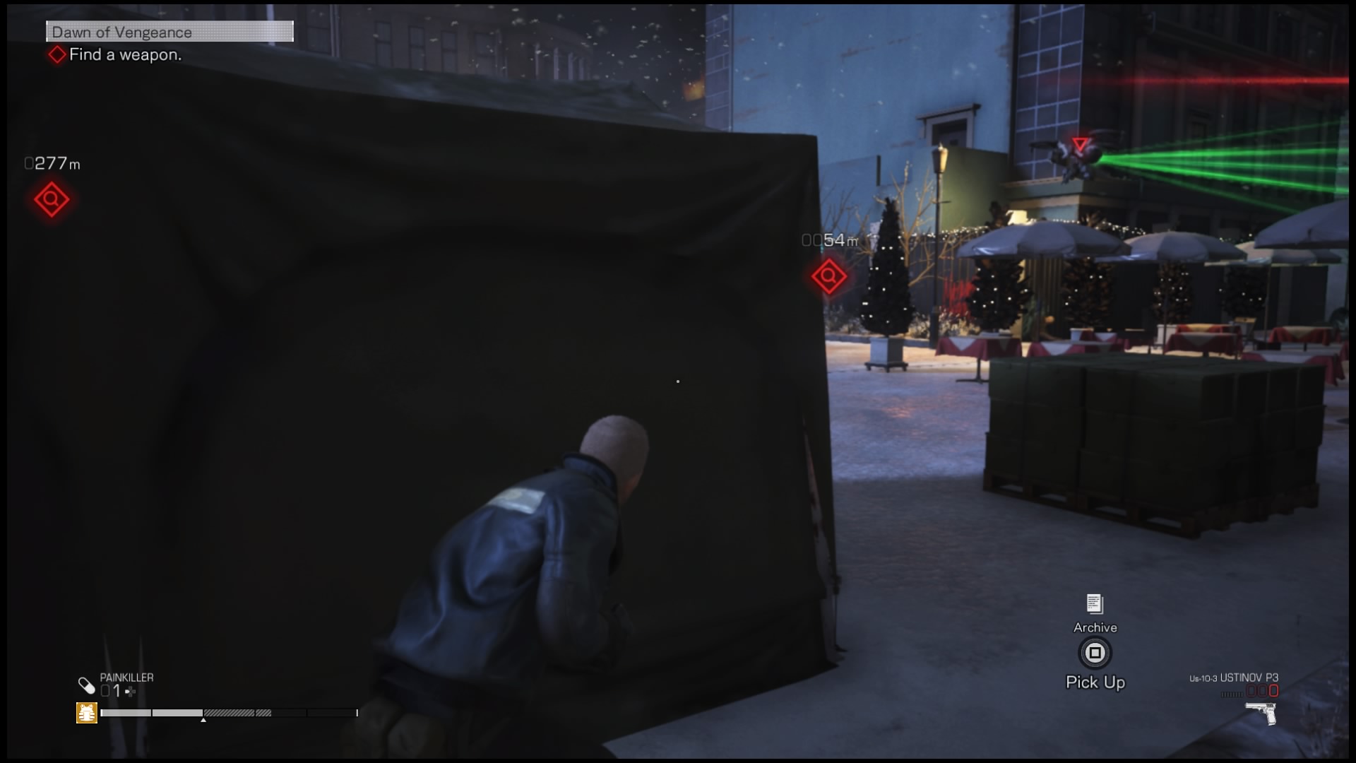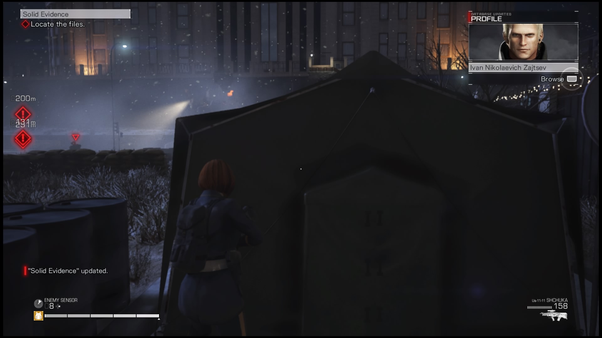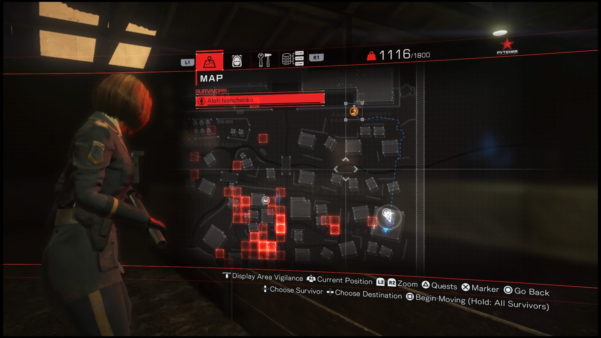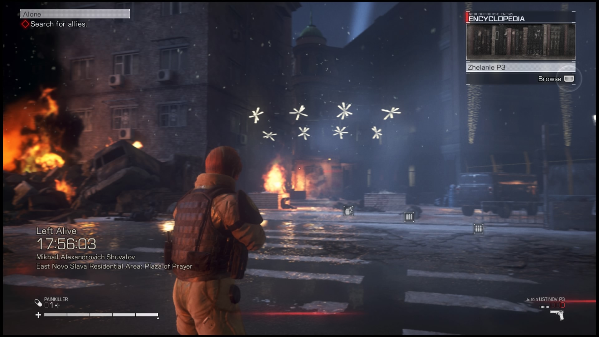 W Left Alive występuje rozwój postaci, jednak jest on okropnie okrojony. Właściwie jedynym parametrem, który możemy zwiększyć jest maksymalne zdrowie postaci. Dzieje się to automatycznie po znalezieniu tak zwanych KIA Bacons, leżących przy niektórych ciałach poległych. Pozostając przy ofiarach wojny, muszę zwrócić uwagę na sposób generowania zwłok, które możemy ograbiać. Według informacji, które wyświetlają się podczas wczytywania poziomów (na szczęście krótkiego) rozmieszczenie ciał jest zależne od tego, gdzie zginęli inni gracze. Dodatkowo starcia, w których brali oni udział zapewniają nam jeszcze jedną informację – tworzą tak zwaną mapę cieplną. Po włączeniu interfejsu Koshka (służącego nam podobnie jak Jarvis Iron-Manowi) możemy otworzyć mapę. Następnie jesteśmy w stanie sprawdzić strefy, w których znajdują się zaalarmowani oponenci, a naciśnięcie przycisku Options sprawi, że zauważymy kwadraty wskazujące na miejsca, w których inni gracze toczyli walki. Dzięki temu możemy próbować zaplanować trasę tak, by spotkać na niej jak najwięcej (lub najmniej, zależnie od naszego podejścia) przeciwników. W świecie gry występują też znajdźki, archiwa. Ich podnoszenie dostarcza nam wiadomości odnośnie tła historycznego miejsc i postaci przed rozpoczęciem się wątku głównego. Są to jednak tak oschłe i nudne informacje, że szybko przestałem na nie w ogóle zwracać uwagę.