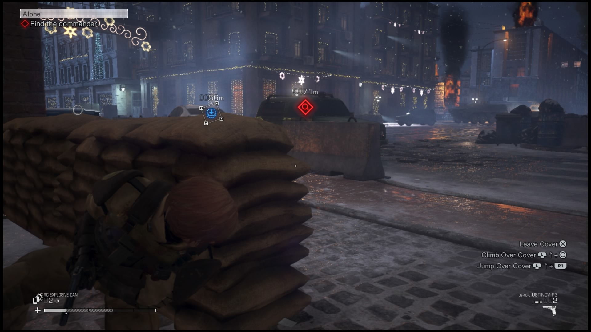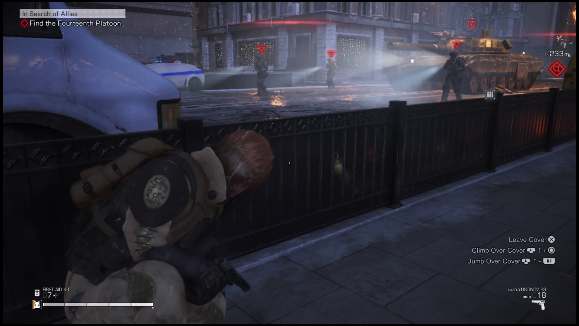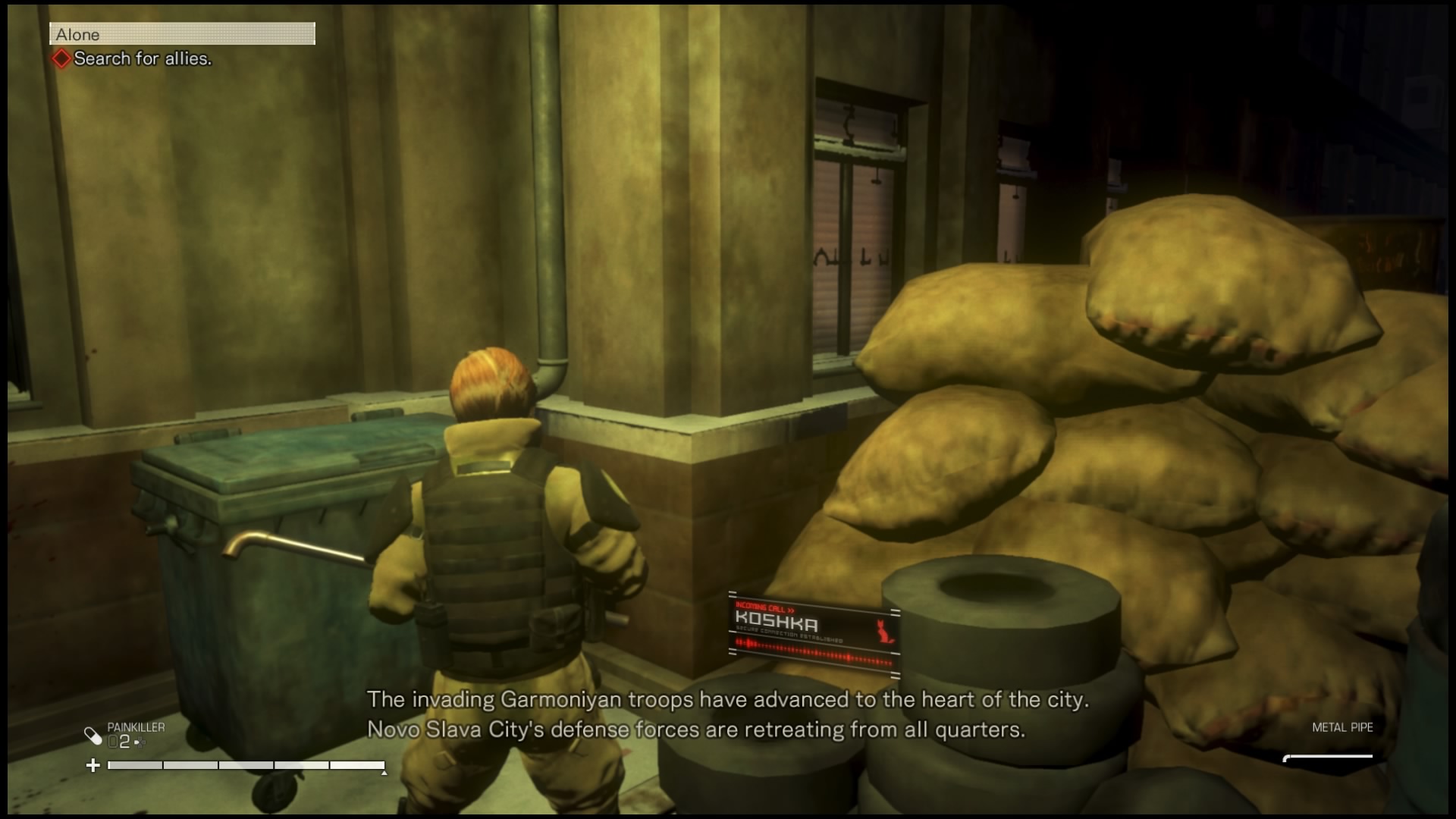 Na rozgrywkę składa się też szukanie ocalałych. W niemal każdej z kilkunastu misji, jakie będziemy przechodzić będziemy mogli uratować kilkoro cywilów pozostałych w strefie wojny. Po znalezieniu takiej osoby (i przekonaniu jej do pójścia z nami, może też się zabić jeśli rozmowa nie pójdzie nam dobrze) zazwyczaj podchodzimy do niej, naciskamy kwadrat i po krótkiej rozmowie będzie próbowała udać się do schronienia. Mamy mały wpływ na działanie tego NPC-a – naciśnięcie przy nim kwadratu przełączy postać niezależną między poruszaniem się i staniem, by umożliwić nam oczyszczenie okolicy. Jeśli tego nie zrobimy, żołnierze zostaną zaalarmowani i zabiją ocalałego. Zapewnia to jednak na tyle małą dawkę emocji, że szybko przestałem się przejmować ratowaniem ocalałych i skupiłem się na głównej linii fabularnej – która i tak, jak już pisałem wcześniej, nie należy do najlepszych