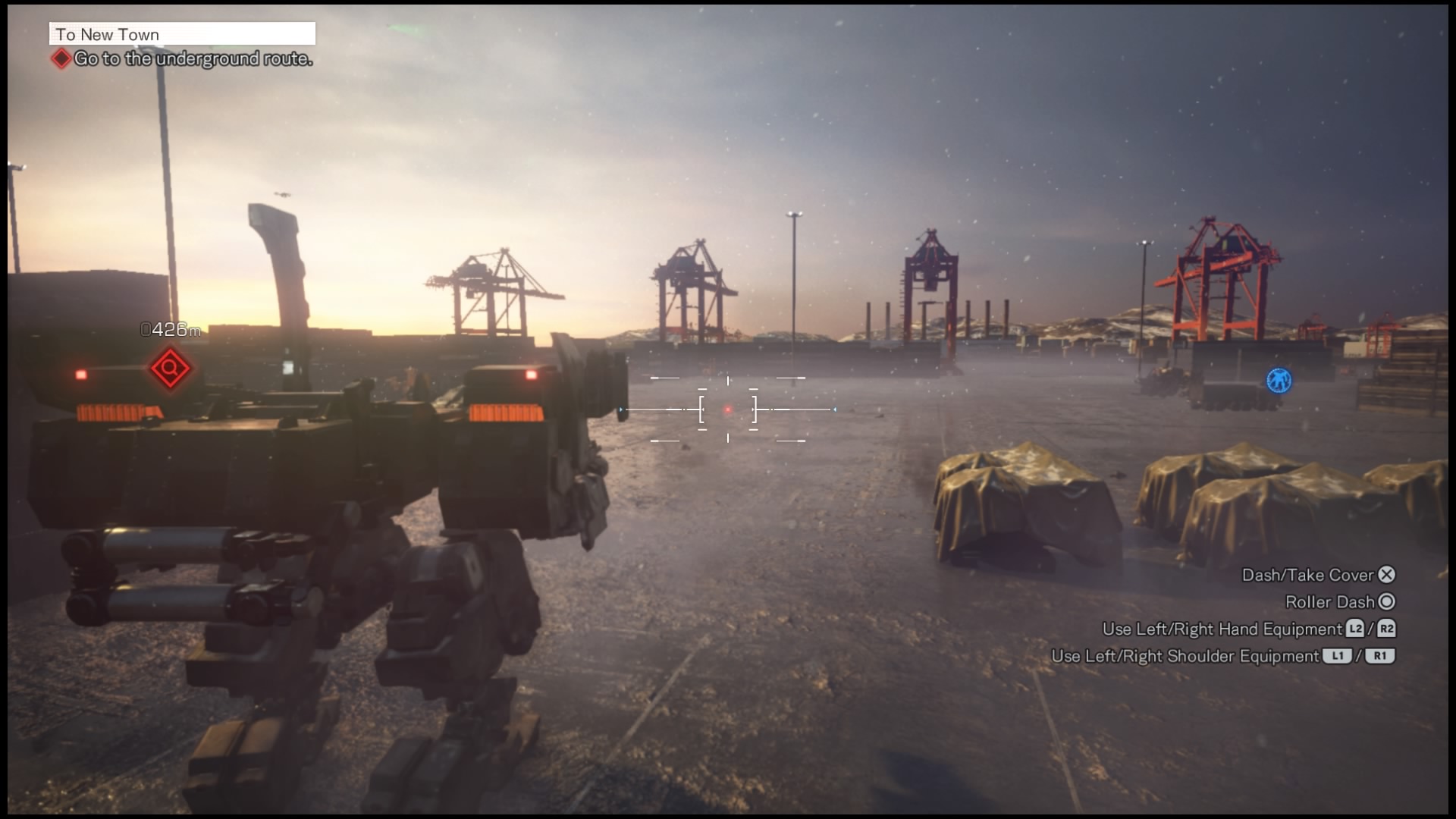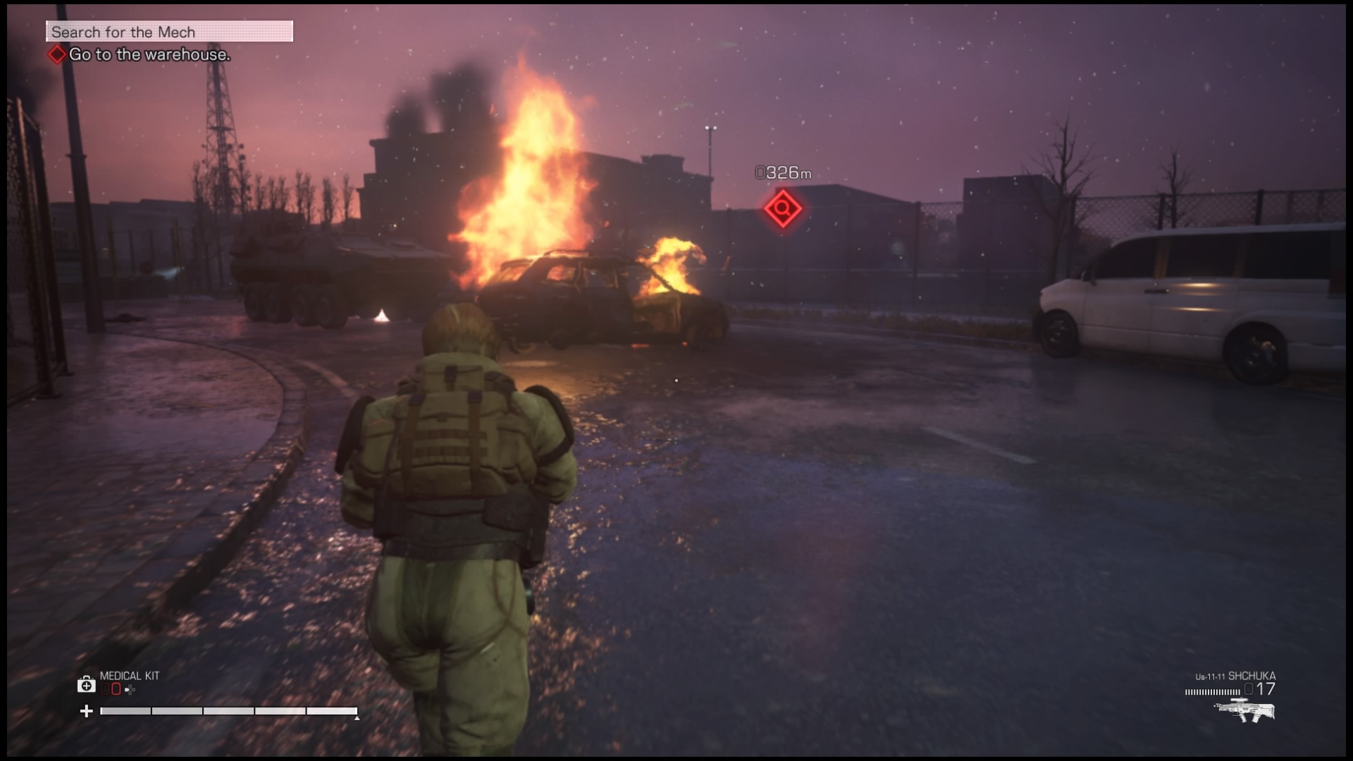 Muszę jeszcze wspomnieć o ostatniej składowej rozgrywki – Wanzerach. W kilku misjach możemy siąść za sterami wielkiej mechanicznej machiny kroczącej i siać zniszczenie w szeregach przeciwników. Możemy korzystać z karabinów, wyrzutni rakiet (również namierzanych) i walczyć wręcz. Starcia mechów, choć proste, potrafią bawić i zapomnieć o reszcie wad Left Alive. Szkoda tylko, że nie sterujemy nimi długo i po chwili wracamy do tej samej nudnej, powtarzalnej rozgrywki. Paradoksalnie, jednym z lepszych elementów recenzowanej produkcji okazała się otwarta walka, gdy pilotujemy Wanzera i po prostu dajemy porwać się rozwałce. To tyle jeśli chodzi o ciche podejście do rozwiązywania problemów. Jak wspominałem wcześniej, nie opłaca się ono. Ani nie daje nam dodatkowych profitów, anie nie jest zrealizowane w satysfakcjonujący sposób. Przeciw skradaniu przemawia też zmuszanie nas co jakiś czas przez grę do brania udziału w strzelaninach. Scenki przerywnikowe potrafią zostawić nas w wirze walki i nierzadko nie mamy innej możliwości jak tylko pozbycie się napływających w naszą stronę oponentów w bezpośrednim starciu.