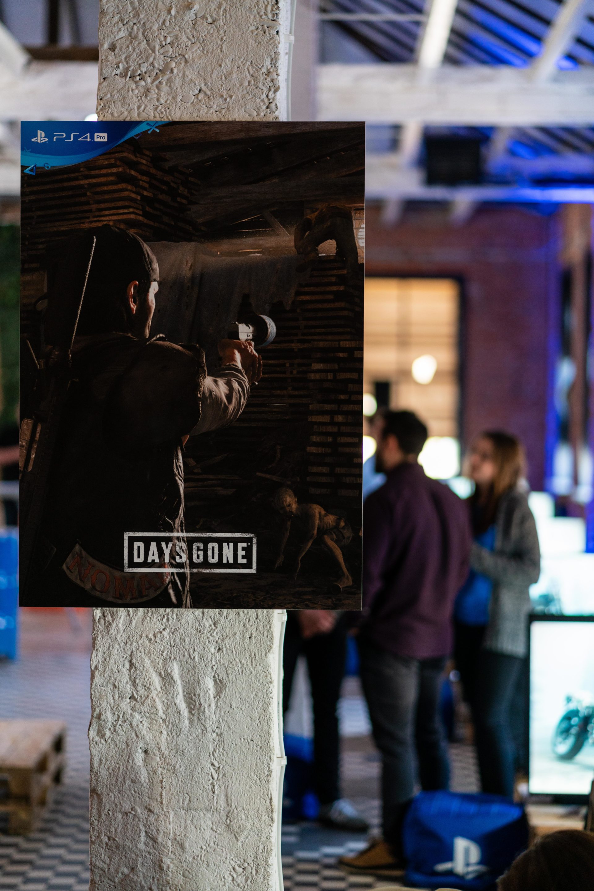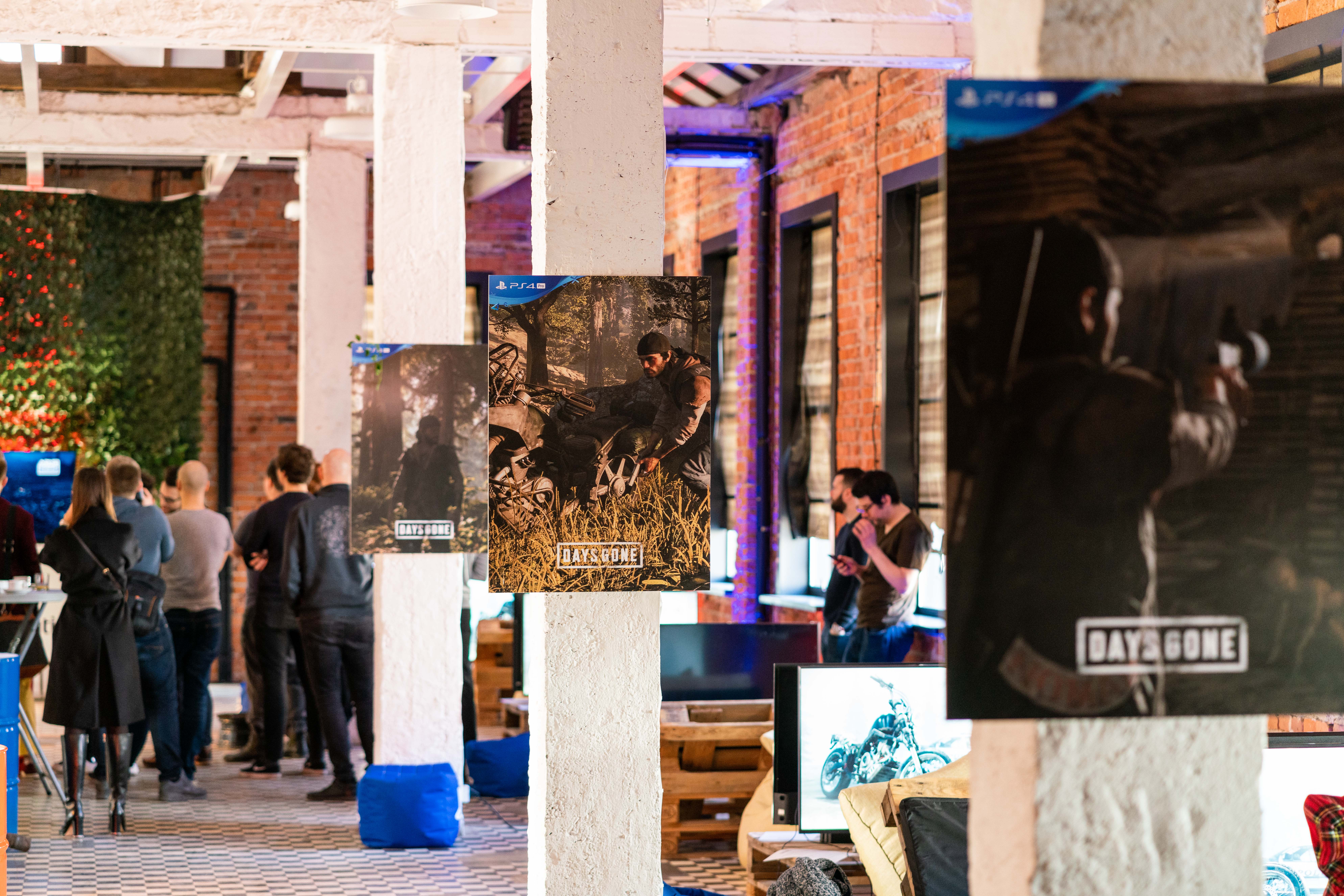 Na początek zostałem przywitany klimatycznym wystrojem, który wyglądał jakby był żywcem wyjęty z produkcji postapo, w której niektóre elementy życia wracają do względnej normalności. Poza szeregiem telewizorów z podłączonymi konsolami, można było zawiesić oko na plakatach zdobiących filary czy rozebranym motocyklu, który wołał do zgromadzonych by ktoś się nim zaopiekował i złożył ponownie w celu podboju okolicznych dróg. Nim mogliśmy zasiąść przed telewizorami w cały klimat wprowadził nas John Garvin.
