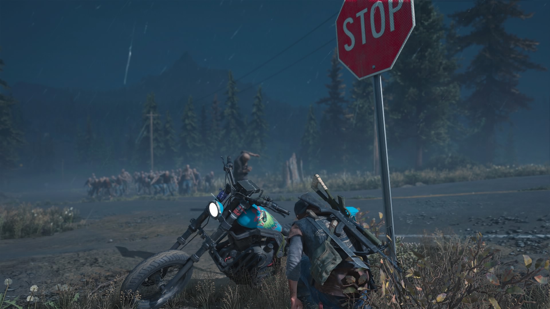 W Days Gone wprowadzono fantastyczne efekty pogodowe, które mają wpływ zarówno na prowadzenie motocykla, jak i na same świrusy. Mogą nas spotkać tak opady deszczu, jak i opady śniegu. Śnieg niestety często pada w absurdalnych miejscach. Może nas zaskoczyć na zielonej polanie pośród kolorowych kwiatów i dopiero co zrywanych grzybów, czy jagód. Owszem, są tutaj typowo śnieżne górskie rejony, gdzie zawsze leży biały puch, ale przesadzono z tym, że może spaść on w każdym innym miejscu, kiedy widać piękną wiosnę. Najbardziej kuriozalna sytuacja miała miejsce, gdy dotarłem do miejsca, gdzie rośnie kukurydza i pracują armatki wodne, które ją podlewają, a po kilku minutach zaczął padać śnieg i cała okolica została pokryta białym puchem. Padający deszcz pomaga zagłuszać trochę nasze kroki, dzięki czemu świrusy gorzej nas wykrywają. Zarażeni stają się bardziej agresywni w obecności śniegu. Dla świrusów ważny jest także cykl dnia i nocy. W ciągu dnia spotkamy ich dużo mniej, większość z nich hibernuje się w gniazdach lub ogromnych hordach. W nocy jest ich dużo więcej, potrafią wędrować nawet całymi grupami w poszukiwaniu pożywienia i wody. Oprócz świrusów musimy uważać także na zarażone zwierzęta takie jak wilki, czy niedźwiedzie. Atakują onw szybko i bez ostrzeżenia. Strasznie upierdliwe są zarażone kruki, które będą nas atakować dopóki nie spalimy ich gniazda na słupie lub drzewie. Warto docenić pięknie zaprojektowane gwiaździste niebo – jest naprawdę ładne i warto się na chwilę zatrzymać, aby je podziwiać.