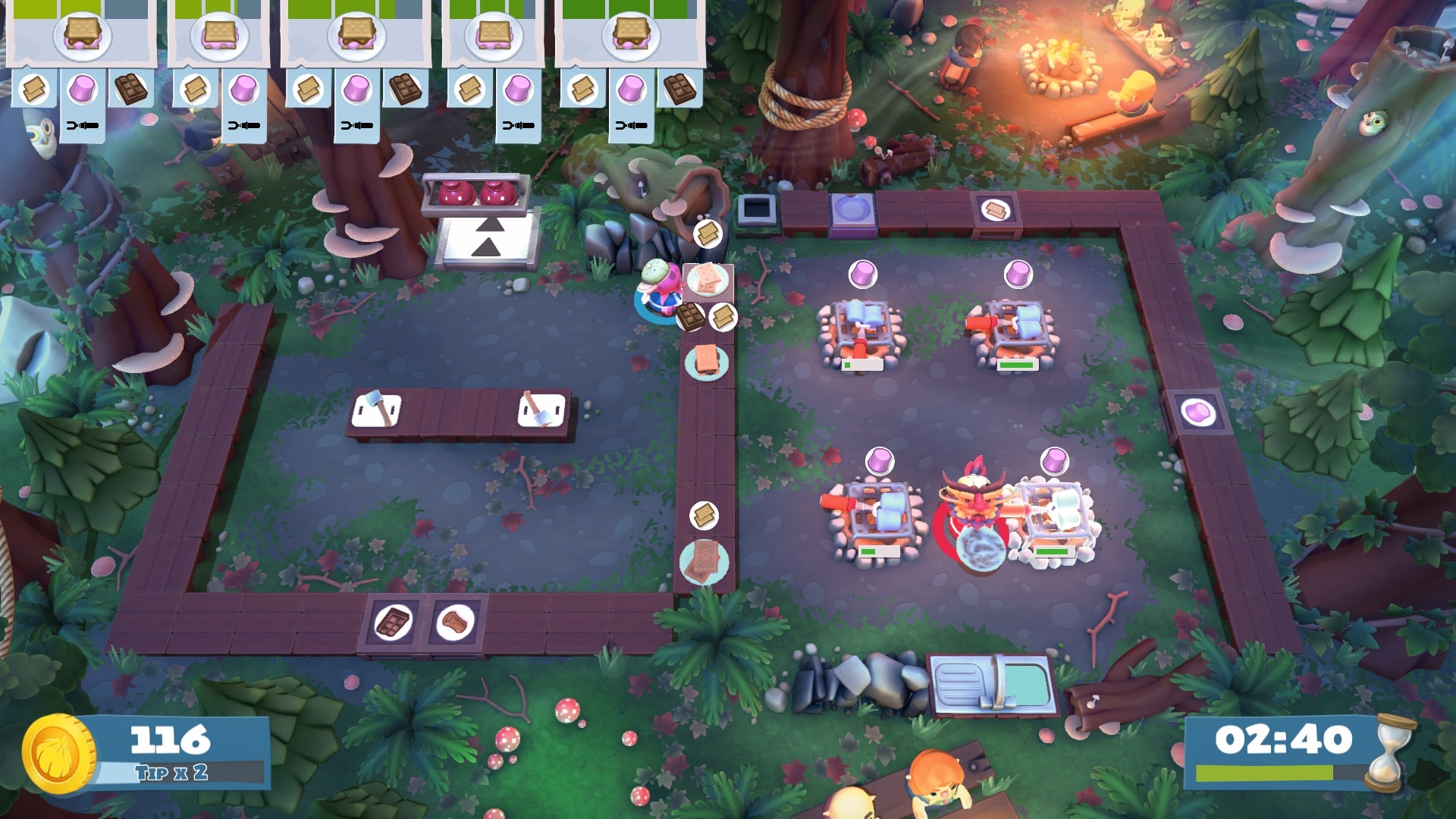 Co może pójść nie tak? Na ogień wrzucamy pianki, na talerz kładziemy herbatniki, a gdy pianki będą gotowe, wrzucamy je między ciasteczka i dodajemy pokrojone owoce. Mniam! Tylko dlaczego to trwa tak długo? No cóż, jeśli jesteście niecierpliwi i olewacie instrukcje na startowej planszy „bo przecież wiecie lepiej”, to potem tak się to kończy. Jednym z nowych mechanizmów w tym dodatku jest drewno. Trzeba je najpierw siekierą podzielić na drobne kawałki, a następnie dorzucić do ogniska. Banalnie proste! Problem zaczyna się tam, gdzie wszystko zaczyna trwać trochę zbyt długo…