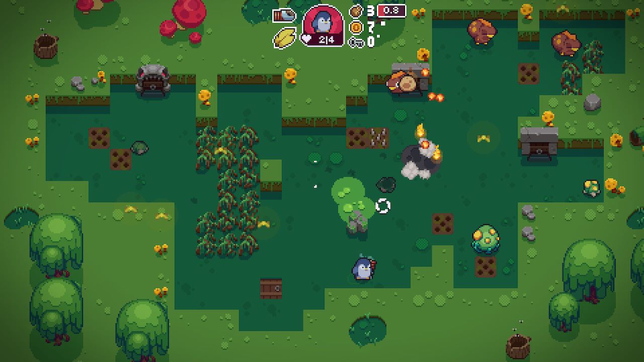 Blazing Beaks posiada jednak ciekawą, całkiem unikatową mechanikę. Po drodze gracze mogą podnosić wypadające z przeciwników artefakty. Zebranie ich nie przyniesie nam natychmiastowo korzyści, a wręcz przeciwnie – początkowo mają one negatywny wpływ na naszą postać, bądź broń. Dla przykładu takowy przedmiot może skrócić zasięg naszej spluwy o połowę, spowolnić kierowanego przez nas bohatera, czy uniemożliwić zbieranie odnawiających zdrowie serduszek. Jaki sens miałoby podnoszenie artefaktów, gdyby nie przynosiły one także zysku? Po dotarciu do sklepiku możemy wymienić owe przedmioty na bonusy ułatwiające nieco dalszą rozgrywkę.