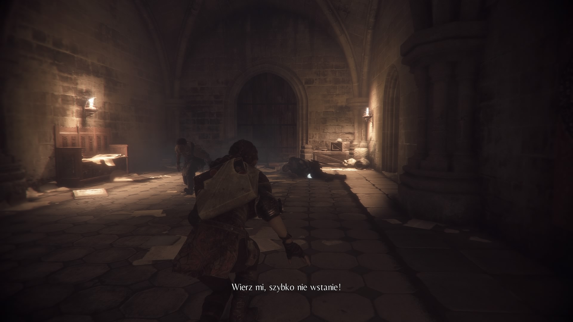 Mam za to zastrzeżenia do warstwy technicznej A Plague Tale: Innocence. Pierwszym problemem jest marna sztuczna inteligencja przeciwników. Same założenia może i są słuszne, ale wykonanie pozostawia wiele do życzenia. Oponenci zauważą nas jeśli przebiegniemy przed ich oczami lub, jak wspominałem wcześniej, wystrzelimy kamień z podstawowej wersji procy. Nie są też głusi na padającego nieopodal nich kompana. Jednak bardzo szybko kończą sprawdzanie rewiru, a jeśli cofniemy się do poprzednio odwiedzonego miejsca, możemy być pewni, że przeciwnicy zrezygnują z szukania nas. Sprawia to wszystko, że przekradanie się i unikanie nieprzyjaciół jest niesamowicie łatwe w recenzowanej produkcji. Z drugiej strony w końcowych etapach potrafi być bardzo frustrujące. Nie będę pisał, kim gramy, ale zmiana grywalnej postaci z Amicii nie okazała się być słusznym posunięciem. Powód jest prosty – jako inny bohater nie mamy najmniejszej szansy na ucieczkę i każdorazowo zauważenie nas przez przeciwnika oznacza niepowodzenie w misji i powrót do ostatniego punktu kontrolnego. Na szczęście te wczytują się bardzo szybko, zwłaszcza w zestawieniu z długim ładowaniem nowych rozdziałów opowieści. Nie mogę też nie opisać problemu dotyczącego ruchu i animacji szczurów. Gryzonie te są strasznie rozmyte, a sposób ich poruszania nie został niestety dobrze przemyślany. Jeśli zauważą one źródło światła, nie przechodzą dalej, ale jednocześnie prą do przodu. Doprowadza to do na tyle kuriozalnych sytuacji, że można odnieść wrażenie zawieszenia się animacji. A propos wieszania – gra kilka razy zmusiła mnie do zresetowania punktu kontrolnego dlatego, że postać, która miała zadziałać z określonym przedmiotem nie miała takiej możliwości. Za przykład niech posłuży fakt, że przy drzwiach do otworzenia nie było symbolu interakcji. Jedynie z recenzenckiego obowiązku wspomnę o możliwości wysyłania kompanów do działania w niedostępnych dla nas miejscach. Nie ma to jednak wielkiego wpływu na rozgrywkę. Rozwiązanie jest zawsze banalnie proste i przez 90% gry nie sposób się pomylić.