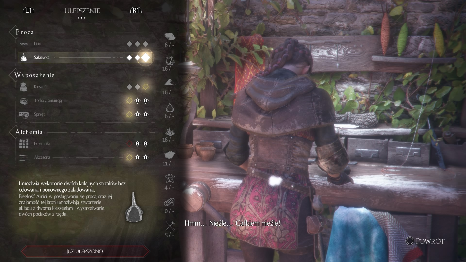 W A Plague Tale: Innocence nie brakuje też rozwijania naszego wyposażenia. Na swojej drodze Amicia pozna kilka postaci, które wspomogą ją na jej drodze. Dzięki nim nauczy się poprawiać możliwości swojego sprzętu. Będzie w stanie zamontować lepszą linkę w procy, dzięki czemu ciszej będzie wypuszczała kamienie. Inne ulepszenie pozwoli jej wykonać drugi szybki strzał bez konieczności celowania i ładowania procy (zaznaczam, że w produkcji występuje system szybkiego celowania automatycznego, którego nie da się wyłączyć). Możemy też ulepszyć sakwy i kieszenie, aby mieściły więcej surowców, a jeśli postawimy na rozwój ubioru (zmiana nie jest wizualna), będziemy poruszać się ciszej. Brzmi to wszystko może i dobrze, ale prawdę mówiąc jedyne, na czego rozwoju mi zależało to proca. Pozostałe ulepszenia wydały mi się, i nadal wydają, zbędne – tym bardziej, że drętwe skradanie sprawiło, że zdecydowanie częściej atakowałem oponentów, chowając się jedynie, aby unikną strzał nieprzyjacielskich łuczników i uciekając przed pieszymi przeciwnikami – jeden ich celny cios oznacza natychmiastową śmierć bohaterki.