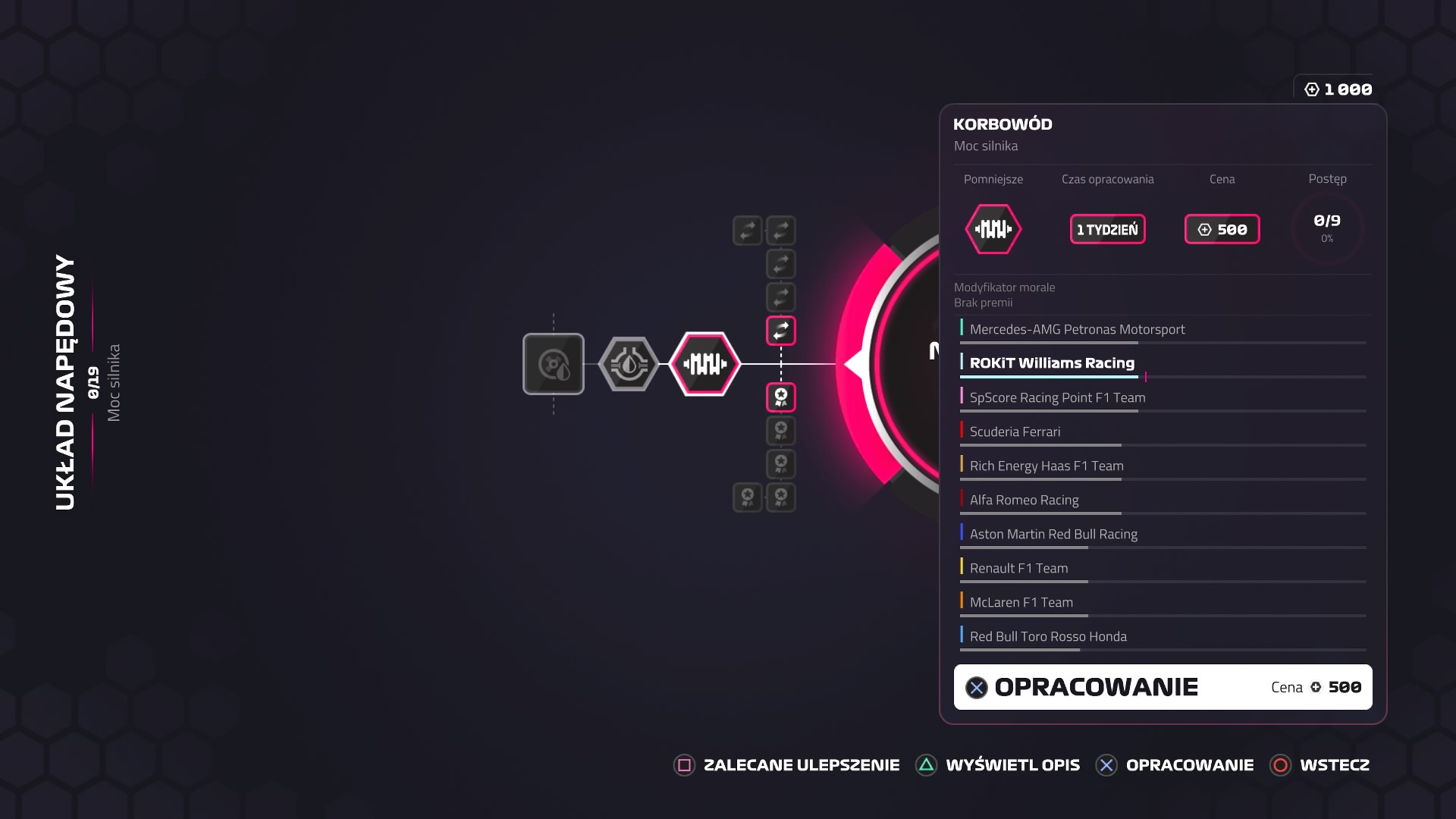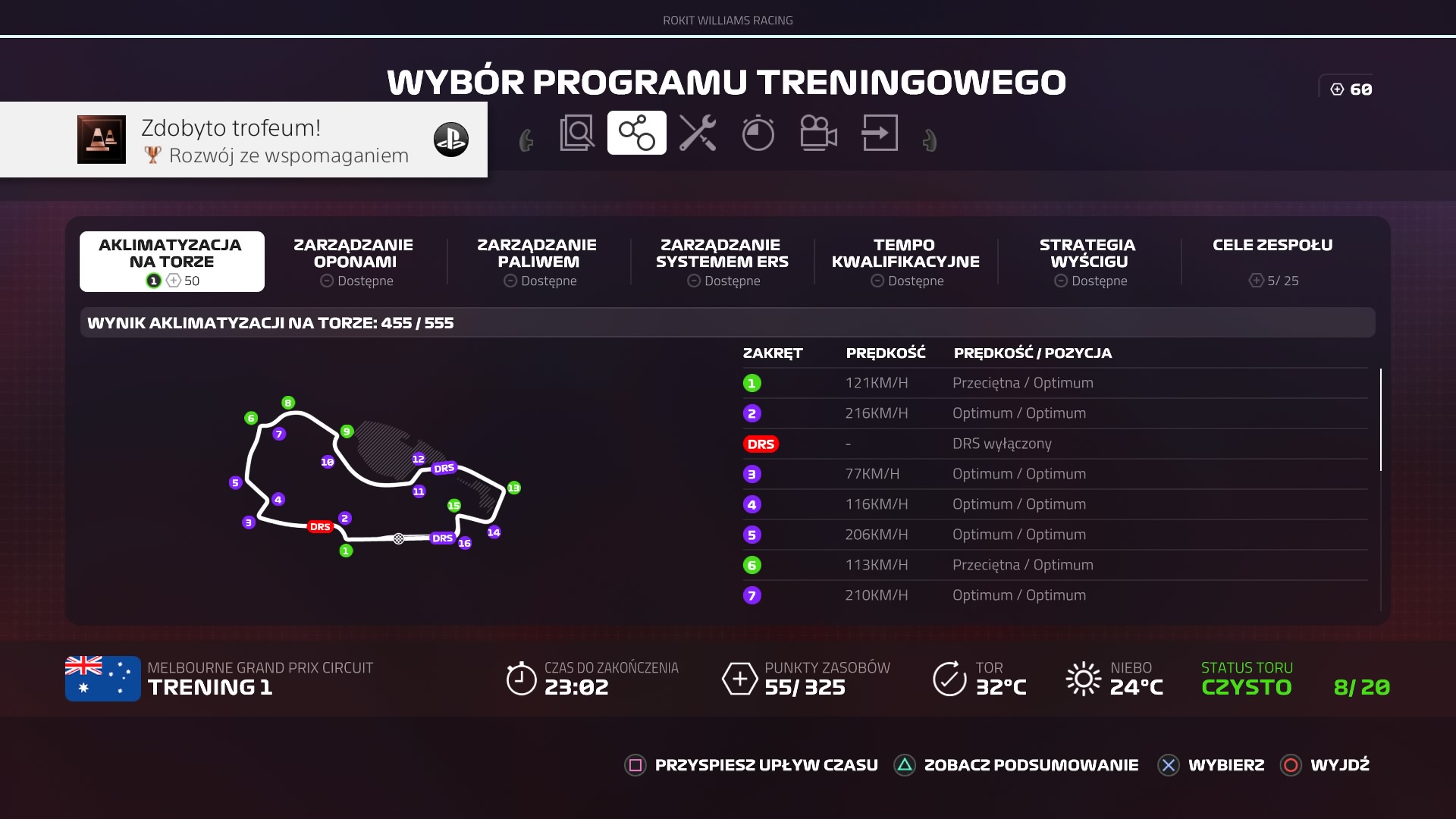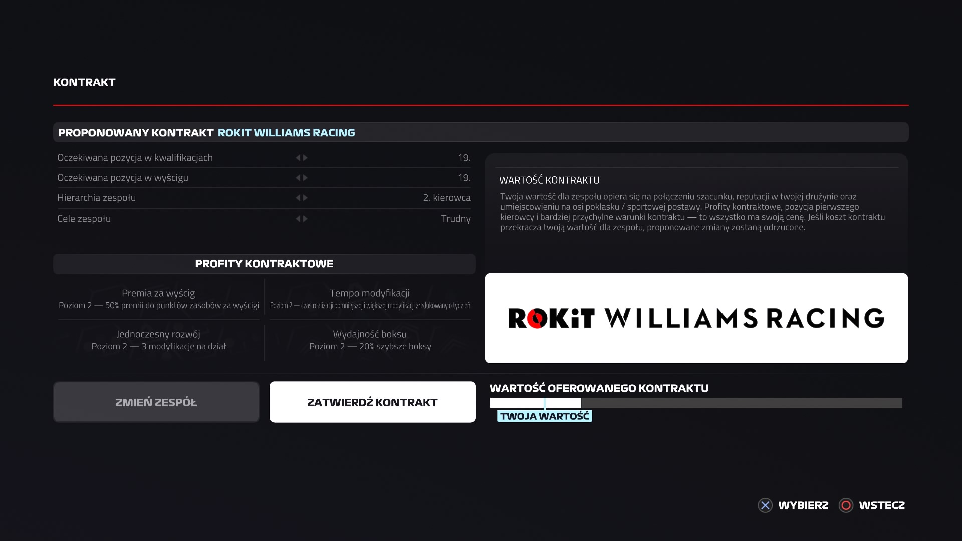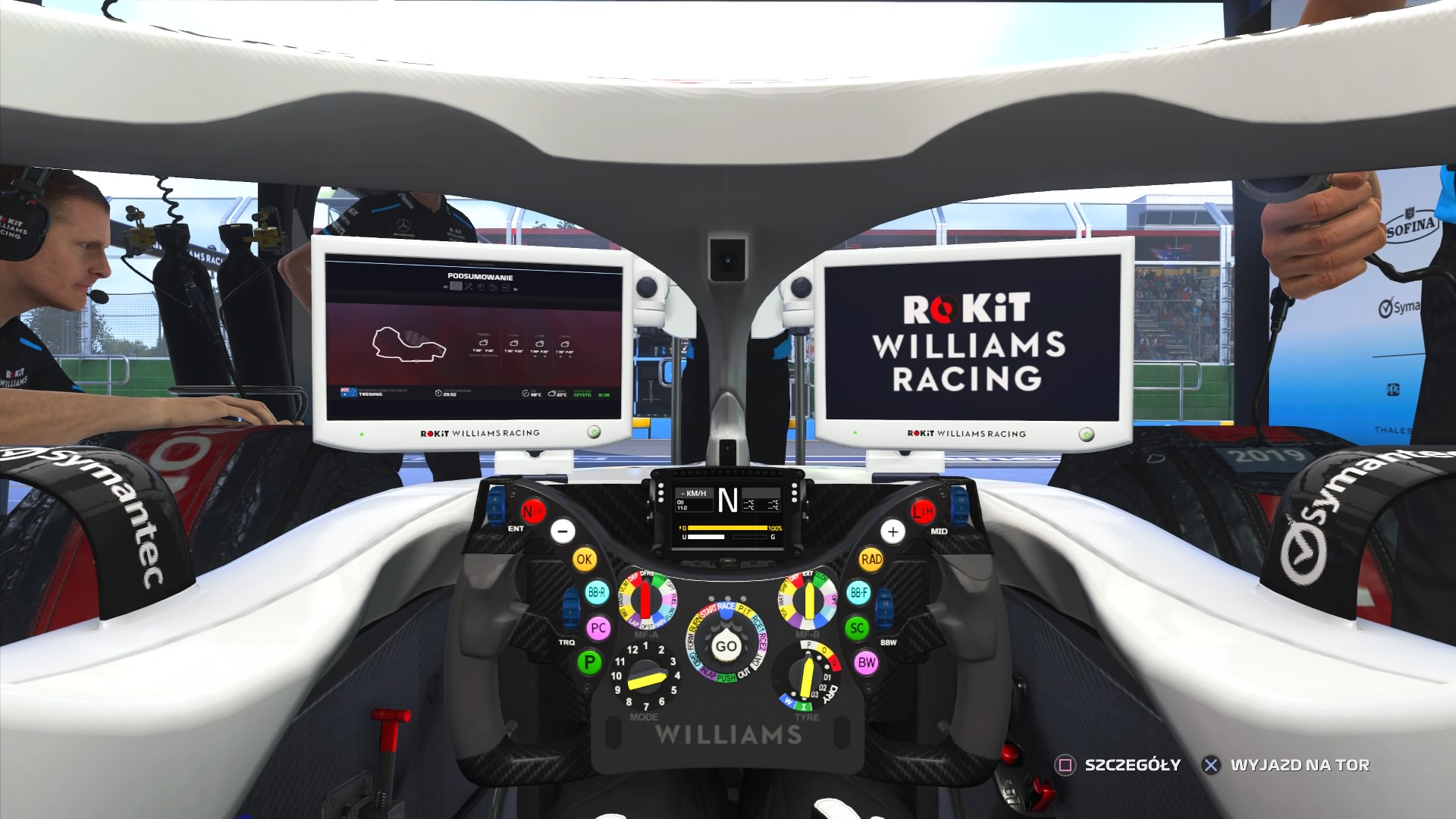 Kariera w F1 2019 nie różni się niczym od tej w edycji 2018. W zależności od wybranego zespołu staramy się sprostać celom przedstawionym nam przez właścicieli zespołu oraz w bezpośredniej rywalizacji staramy się być lepszym od partnera z zespołu. Będąc fanem i kibicem Roberta Kubicy, nie mogłem sobie odmówić podpisania w pierwszej kolejności kontraktu z Williamsem – chociaż zdawałem sobie sprawę z jakim konsekwencjami się to wiąże. Bolidy brytyjskiego zespołu są najwolniejsze w stawce, a ich prowadzenie do łatwych nie należy. Pojazd Williamsa jest znacznie wolniejszy na prostych oraz ma słabe przyśpieszenie, a jego aerodynamika jest słabo rozwinięta, przez co w zakrętach np. lewo-prawo-lewo łatwo się obrócić. Do tego części szybko się zużywają, ale tutaj z pomocą przychodzi dobrze znany dział “Badań i Rozwoju”. Za zdobyte punkty z celów do wykonania, które mamy podczas treningów możemy w nim opracować lepsze części lub sprawić, że posiadane będą bardziej wytrzymałe. Niestety inżynierowie Williamsa nie są najlepszymi specami i często podczas opracowywania nowych elementów cześć z nich od razu trafiała do kosza, bo nie spełniała wymaganych norm i cały proces rozwoju trzeba było powtarzać. Williams wyraźnie odstaje od reszty stawki F1 i grając na kierownicy na średnim poziomie trudności, byłem w stanie załapać się do pierwszej dziesiątki w kwalifikacjach, a raz nawet byłem trzeci. Ale na nic się to zdaje, gdy na starcie wyścigu nasz bolid wolno się rozpędza i jest wyprzedzany od razu przez kilku kierowców. Podobnie sytuacja ma się na dłuższych prostych, na których praktycznie każdy bolid jest w stanie nas wyprzedzić.