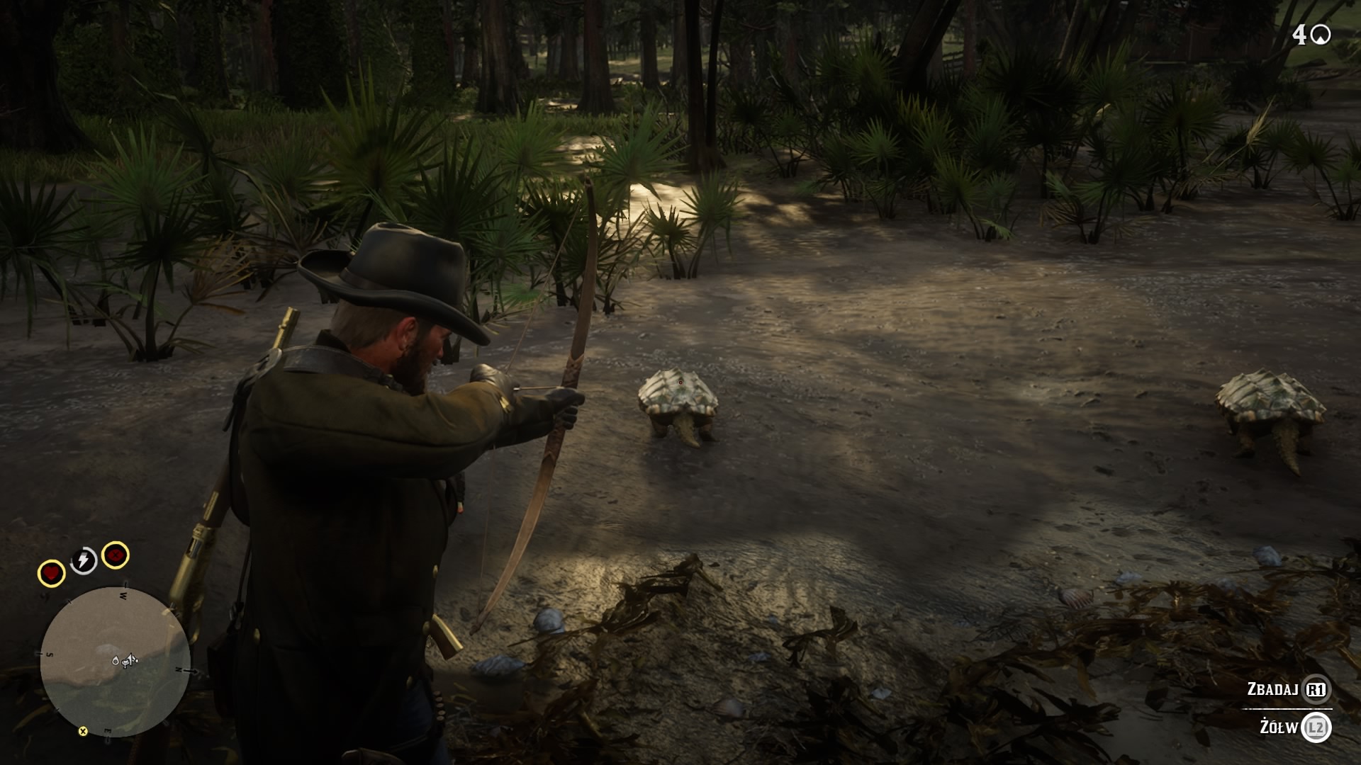 Pozostańmy jeszcze chwilę przy tych wskaźnikach. Nasz stan jest opisywany przez trzy parametry: zdrowie, wytrzymałość i Zabójczą Precyzję. Pierwszy z nich spada oczywiście w miarę odnoszonych obrażeń – czy to od przyjmowanych kul, czy od upadków z większych wysokości. Wytrzymałość zmniejsza się głównie podczas biegania, a Zabójcza Precyzja (spowolniony upływ czasu) przy celowaniu po naciśnięciu prawej gałki analogowej (natomiast napełnia się w miarę pozbywania się przeciwników w zwykły sposób). Dwoma z tych wskaźników opisany jest też koń – charakteryzują go zdrowie i wytrzymałość. Im szybciej będziemy biegać, tym szybciej będzie spadała wytrzymałość naszego wierzchowca, aż ostatecznie padnie pod nami. Możemy go też zajeździć na śmierć. Wtedy, o ile nie mamy przy sobie preparatu ocucającego ani zapasowego konia, musimy szukać nowego towarzysza podróży. Trzeba jednak mieć na uwadze, że żaden nowy koń nie będzie od początku tak dobry, jak wychowany już przez nas rumak. Im większa nasza więź z koniem, tym lepiej będzie sobie radził na szlaku. Z początku będzie się ociągał, wykonując nasze polecenia. Jeśli jednak poświęcimy mu trochę czasu, pogładzimy go, będziemy go czyścic, dbać o niego i karmić smakołykami (dodatkowo wpływającymi na wspomniane wskaźniki), możemy mieć pewność, że jego więź z nami wzrośnie. To wpłynie na prędkość, z jaką będzie się poruszał, jego zwrotność i odległość, z jakiej będzie słyszał nasz gwizd (którego używamy do przywołania do siebie wierzchowca). Poza tym będziemy mogli wykonywać bardziej zaawansowane ruchy, jak choćby chodzenie bokiem lub stawanie dęba. Dlatego zdecydowanie warto dbał, by nasz kompan nie padł.