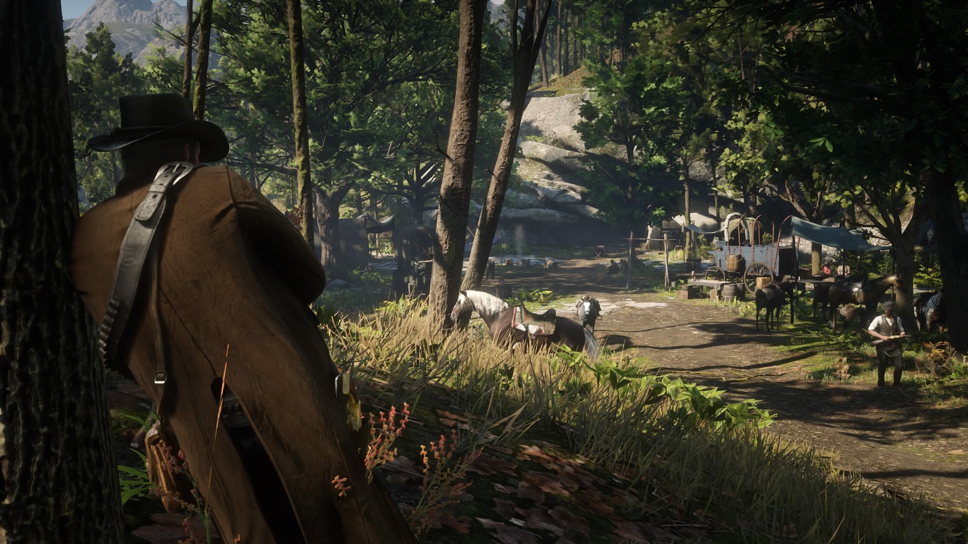 Tak samo jak oprawa audio-wizualna. Widoki w Red Dead Redemption II zapierają dech w piersiach. Nie jestem w stanie zliczyć, ile razy zatrzymałem się tylko po to, żeby podziwiać wspaniały zachód słońca albo żeby po prostu obserwować, co robią postaci, gdy zostawia się je samym sobą. Nierzadko widziałem Arthura opartego o drzewo i spoglądającego przed siebie, czekającego na to, co przyniesie przyszłość albo opierającego się o kamień po wczytaniu gry. Gdy jednak się mu przyjrzałem, okazało się, że bohater śpi. Innym razem szedłem po głazie i w rogu ekranu zobaczyłem napis „Usiądź”. Przytrzymałem trójkąt, Morgan usiadł i cóż. Siedział. Bez żadnego powodu, tylko dlatego, że mógł. Ta gra jest przepełniona podobnymi smaczkami – nie robiącymi właściwie nic, a jedynie zwiększającymi realizm świata.