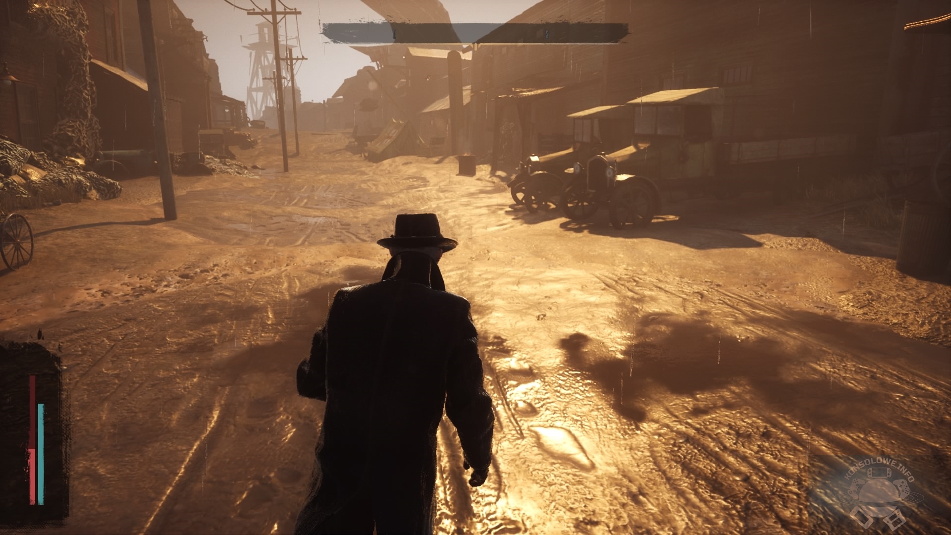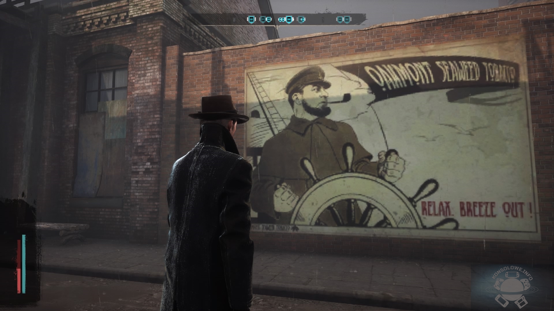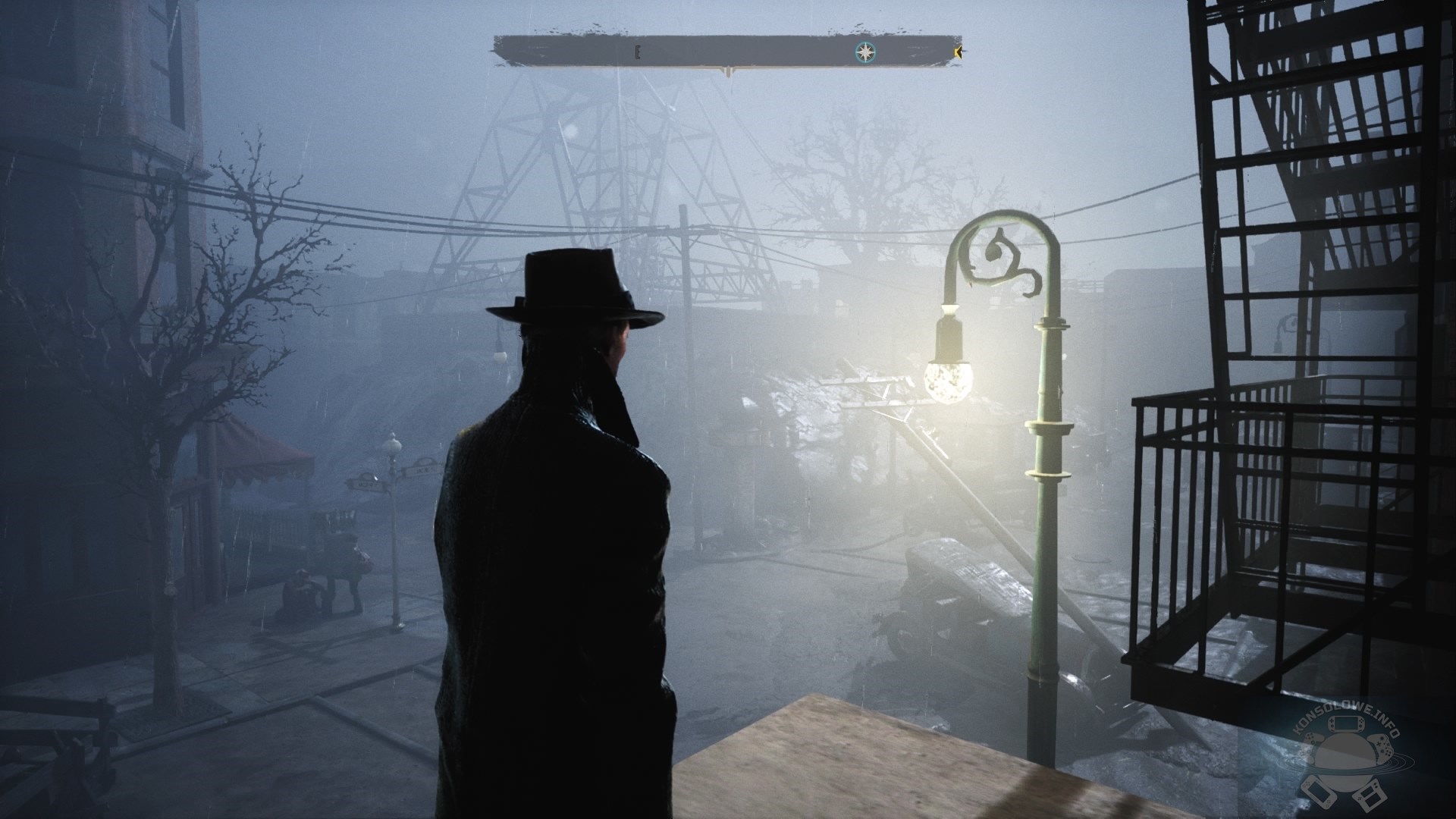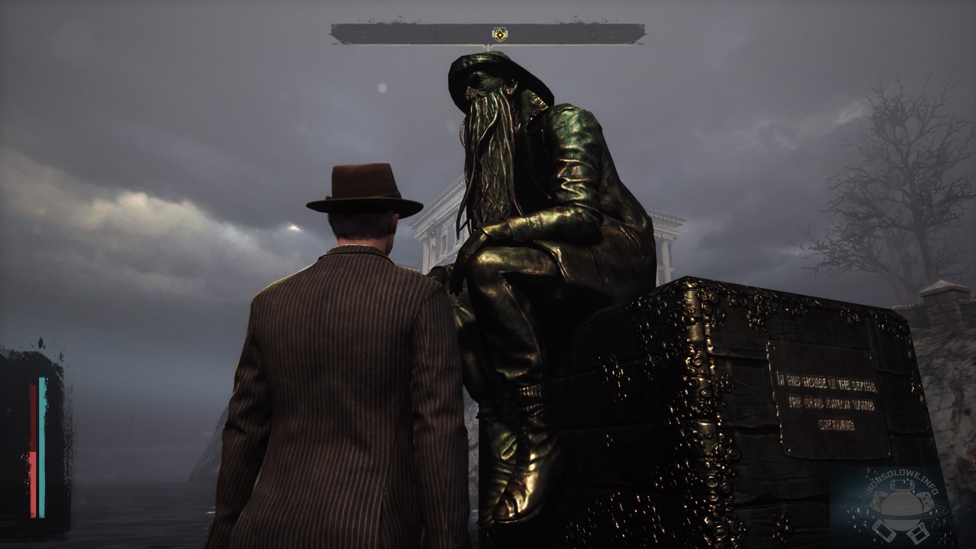Pierwszym, co mnie uderzyło była dyskusyjna jakość oprawy graficznej. O ile sam model głównego bohatera jeszcze daje radę (mało tego, zmoczony wygląda naprawdę dobrze i przekonywająco), a oświetlenie nieraz potrafi zachwycić, o tyle nie mogę tego samego napisać w odniesieniu do wyglądu bohaterów niezależnych i otoczenia. Tekstury nierzadko są rozmazane albo w niskiej rozdzielczości, nie brakuje też wyskakujących tuż przed nami z powietrza pieszych. The Sinking City zdecydowanie nie jest produkcją, w którą gra się ze względu na jej wygląd. Poziom grafiki zatrzymał się początku tego tysiąclecia. Skojarzenia z wieloma latami zacofania nasuwają się także przez problemy natury technicznej. Recenzowana gra wypełniona jest postaciami przenikającymi przez siebie lub stojącymi na niewidzialnych progach. Muszę też zaznaczyć pewne błędy tłumaczeniowe. Pomijając nieraz niewłaściwą interpunkcję, tytuł cierpi na dość dziwaczne polskie wersje zdań. Hitem było dla mnie przetłumaczenie “right side of the track” na “prawą stronę torów”.