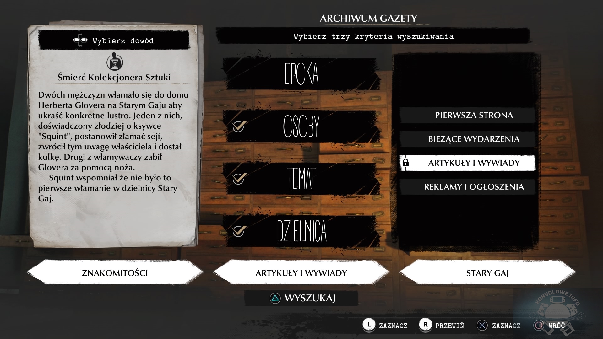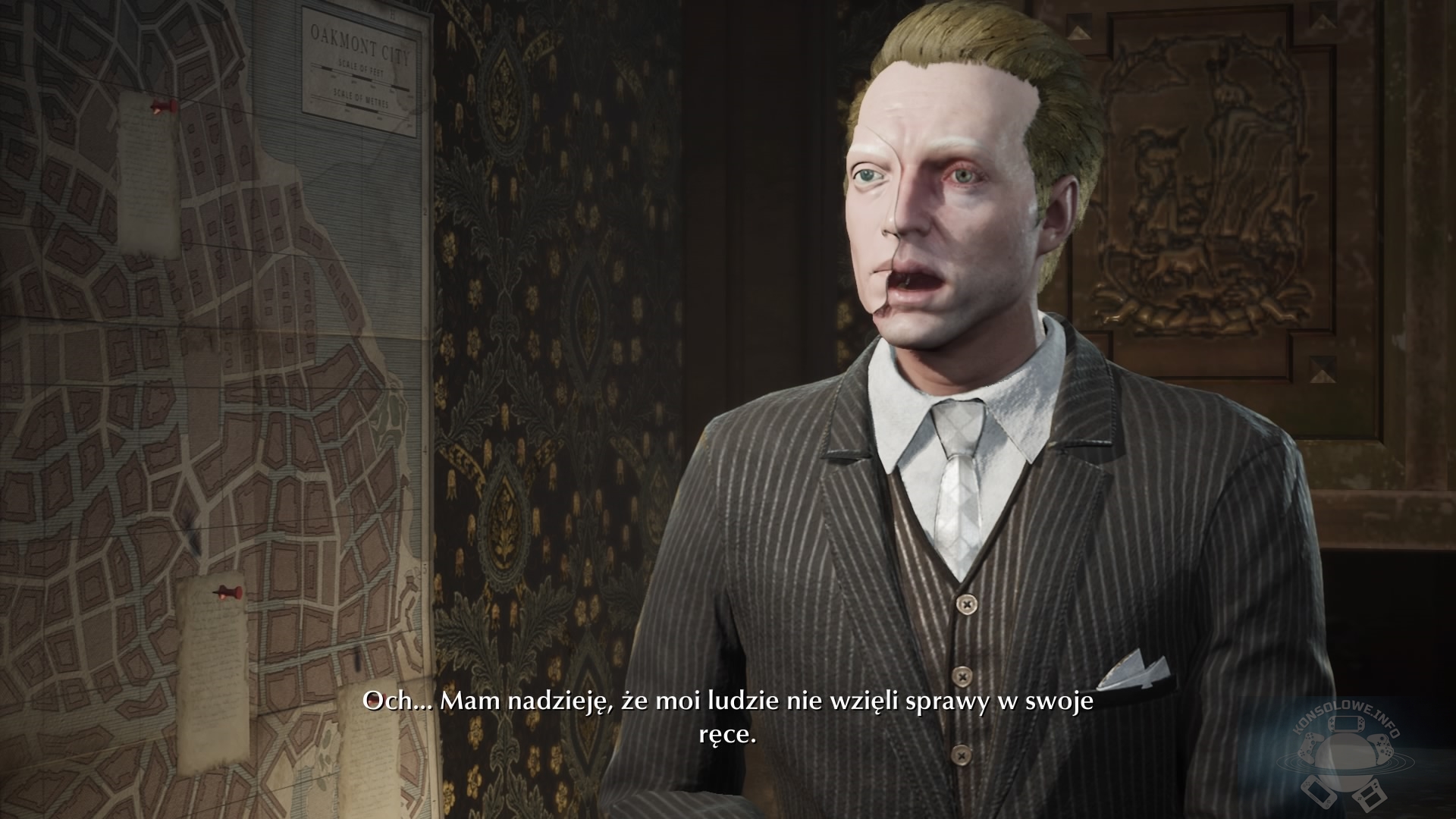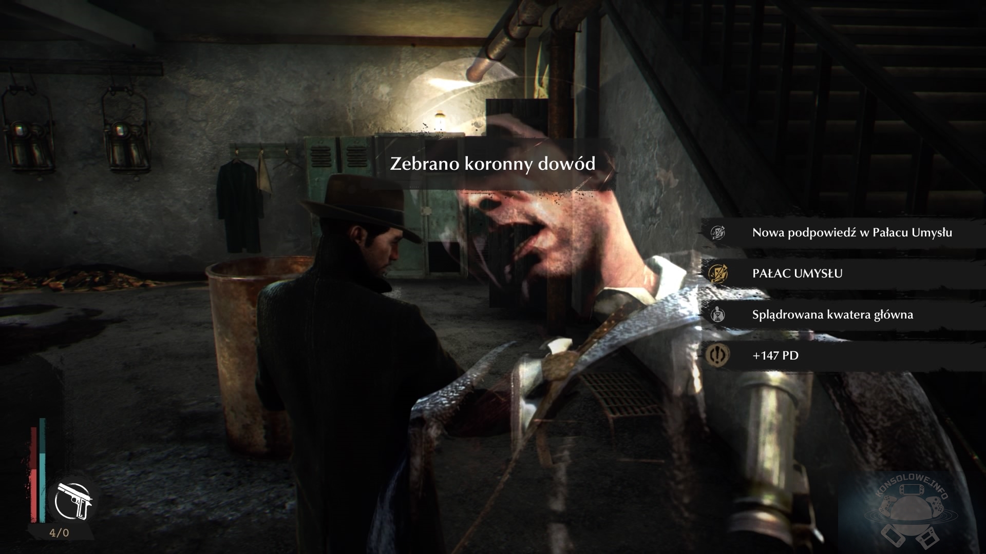 Nasz detektyw, przez wypadek, w którym brał udział, zyskał dostęp również do paranormalnej umiejętności, umożliwiającej inne spojrzenie na otaczający nas świat – Oka Umysłu. Jeśli znajdziemy na terenie misji konkretny przedmiot, możemy skupić się na jego niebieskiej poświacie za pomocą odpowiedniego trybu. Dowiemy się w ten sposób, co działo się niedawno z danym obiektem. Niekiedy natkniemy się też na tajemnicze zawieszone w powietrzu symbole, po skupieniu się na których otworzymy przejście dalej – na ogół zniknie mur zagradzający dalszą drogę, rzadziej posągi w Oakmont zmienią wygląd, przypominając bardziej Wielkiego Śniącego. Jeśli odnajdziemy wszystkie potrzebne dowody i poszlaki, nieopodal pojawi się niebieska strefa. Po wejściu do niej naszym oczom ukaże się kilka niebieskich punktów, stanowiących kluczowe momenty wydarzeń z przeszłości. Naszym zadaniem będzie ułożenie ich w stosownej kolejności, aby otrzymać logiczny ciąg zdarzeń. Nie jest to nic skomplikowanego i nie powinno być większych problemów z dotarciem do pełnego obrazu przeszłości, ale mimo tego lubiłem łączyć te kropki w jedną większą całość. W The Sinking City nie brakuje też przeprowadzania rozmów ze świadkami, co nie powinno dziwić. Są one jednak tak drętwe, że najczęściej po prostu przeczytałem kwestię dialogową zanim nasz rozmówca ją wypowiedział i nacisnąłem X, aby przejść do kolejnej linii. Zdecydowanie aktorzy podkładający głosy bohaterom nie popisali się i miałem wrażenie, że jedynie czytali oni swoje kwestie bez najmniejszej nawet próby odegrania postaci. Nasz detektyw nierzadko będzie odwiedzał archiwa miejskie różnego typu (policyjne, szpitalne, czy na przykład archiwum ratusza). W nich będzie mógł na podstawie 3 kryteriów wyszukać informacje wyjaśniające dalszy cel zadania. Początkowo dobrze się bawiłem, przeszukując te archiwa, ale im dłużej grałem, tym częściej musiałem je przeszukiwać i ostatecznie zaczęły mnie one nużyć. Co za dużo, to niezdrowo.