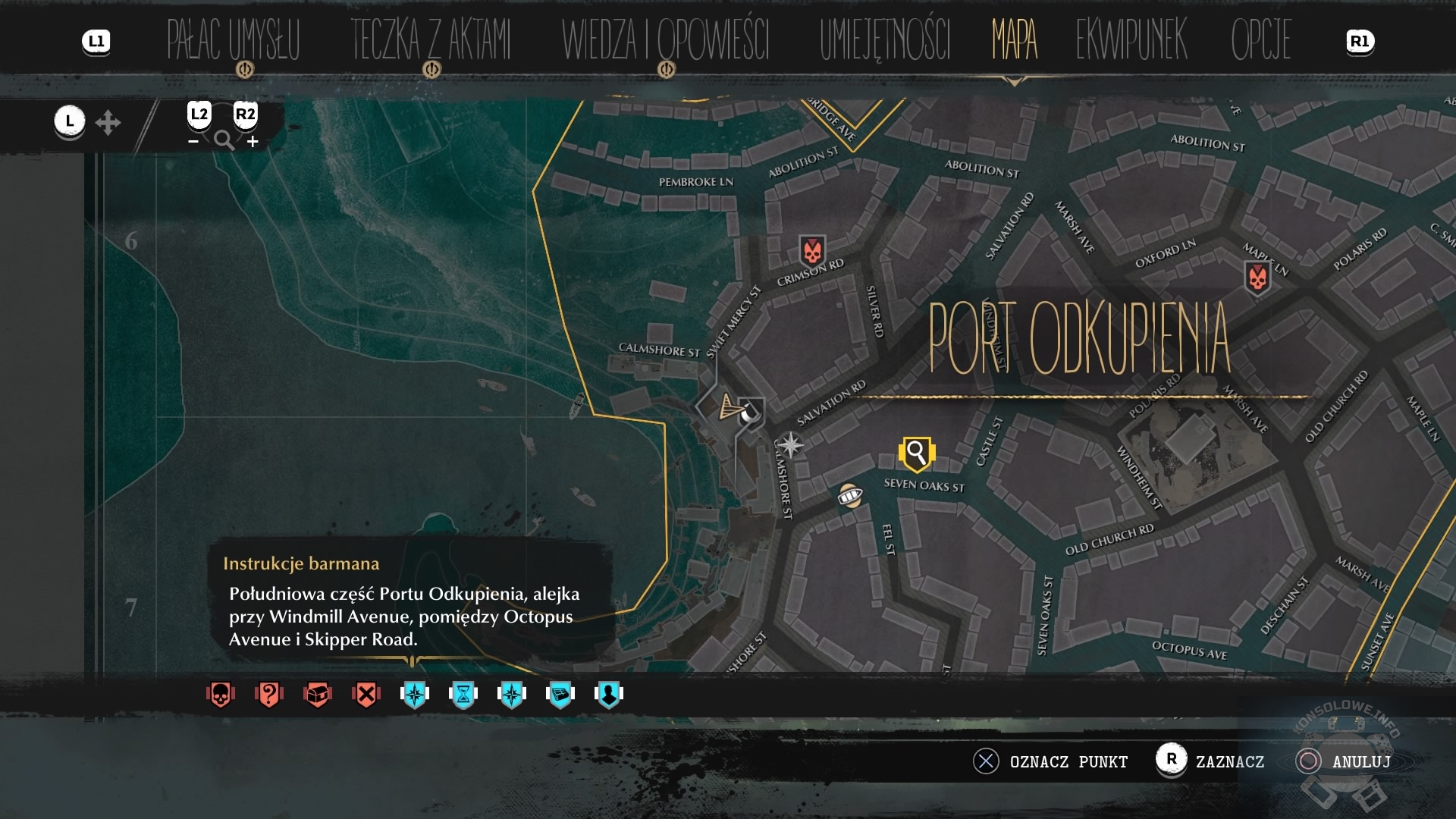 Z drugiej strony bardzo spodobało mi się to, że gra nie prowadzi nas za rękę. Nie wyjaśnia mechanik wprost. Aby się czegoś dowiedzieć, musimy albo przeczytać tekst w menu samouczka, albo po prostu empirycznie coś sprawdzić. Niezłe jest też oznaczenie lokacji, do której mamy się udać. W menu spraw możemy wybrać zadania, które chcemy przypiąć na mapę (aby widzieć ich symbole na kompasie). Co ciekawe, w opisie misji nie widzimy konkretnego miejsca, a jedynie przybliżoną lokację (na przykład „skrzyżowanie University Street i St. Michael’s Road albo „alejka D, między ulicami E i F”). Odkrywanie orientacyjnego miejsca docelowego i oznaczenie go na mapie – planie miasta – jest oczywiście proste, ale spodobało mi się. Pasuje do profesji bohatera i zwiększa wiarygodność przedstawionego świata.