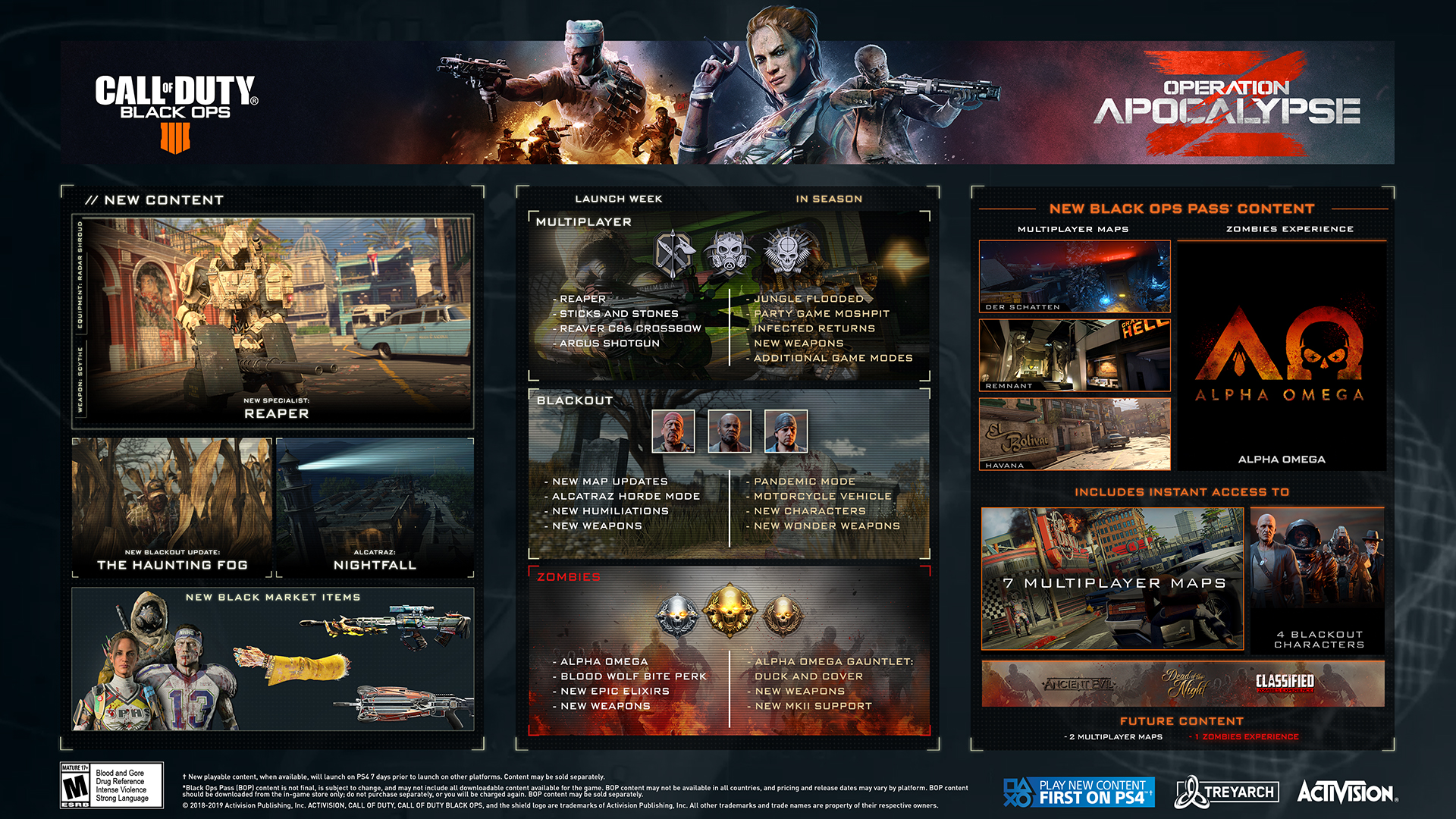 - Nowy sprzęt na czarnym rynku – Zaopatrzenie Czarnego Rynku zostało uzupełnione o nowe kamuflaże broni, stroje, gesty i akcesoria, wszystkie w stylistyce Operacji Apocalypse Z. Wchodzą w to nowe bronie, takie jak kusza Reaver C86 Special Secondary, Daemon 3XB Mastercraft, Argus Shotgun z Black Ops III, MOG 12 MKll oraz Vendetta MKll, które gracze mogą zdobyć i opanować.