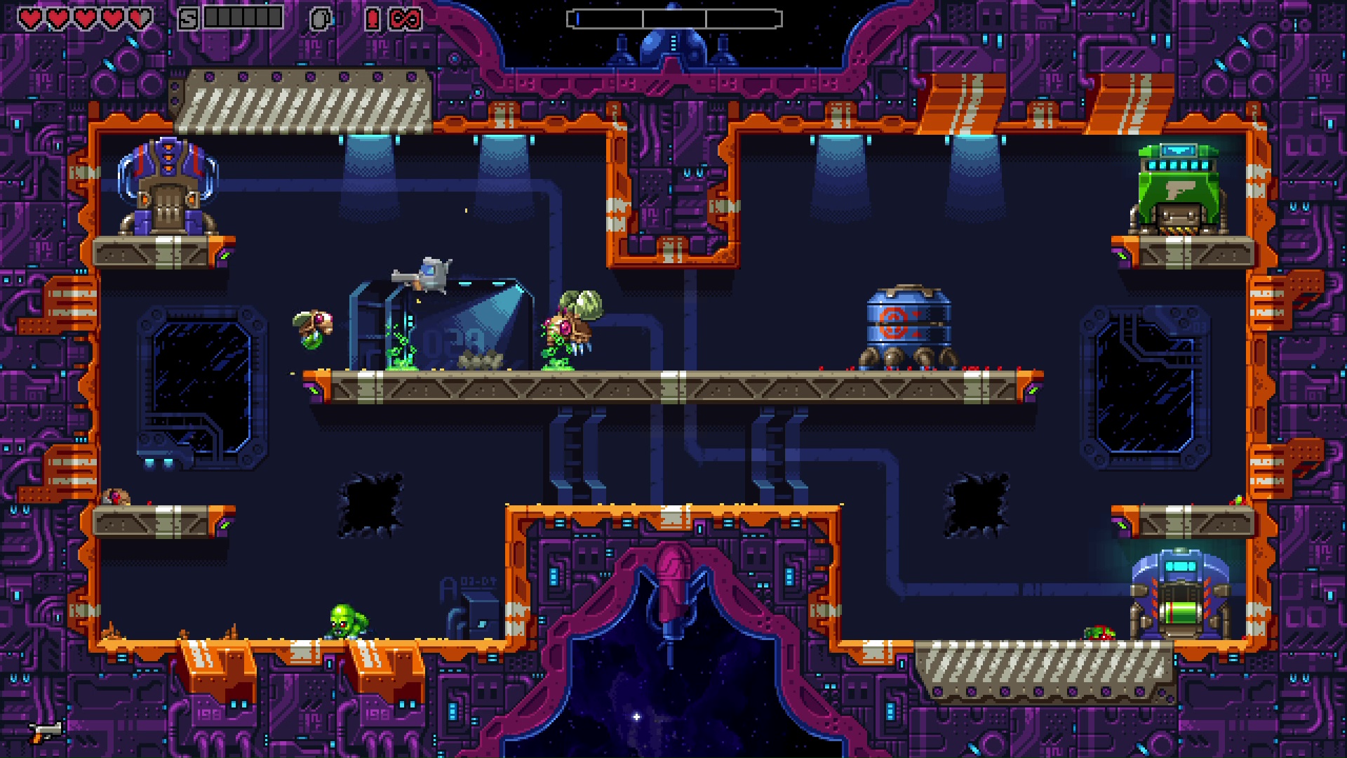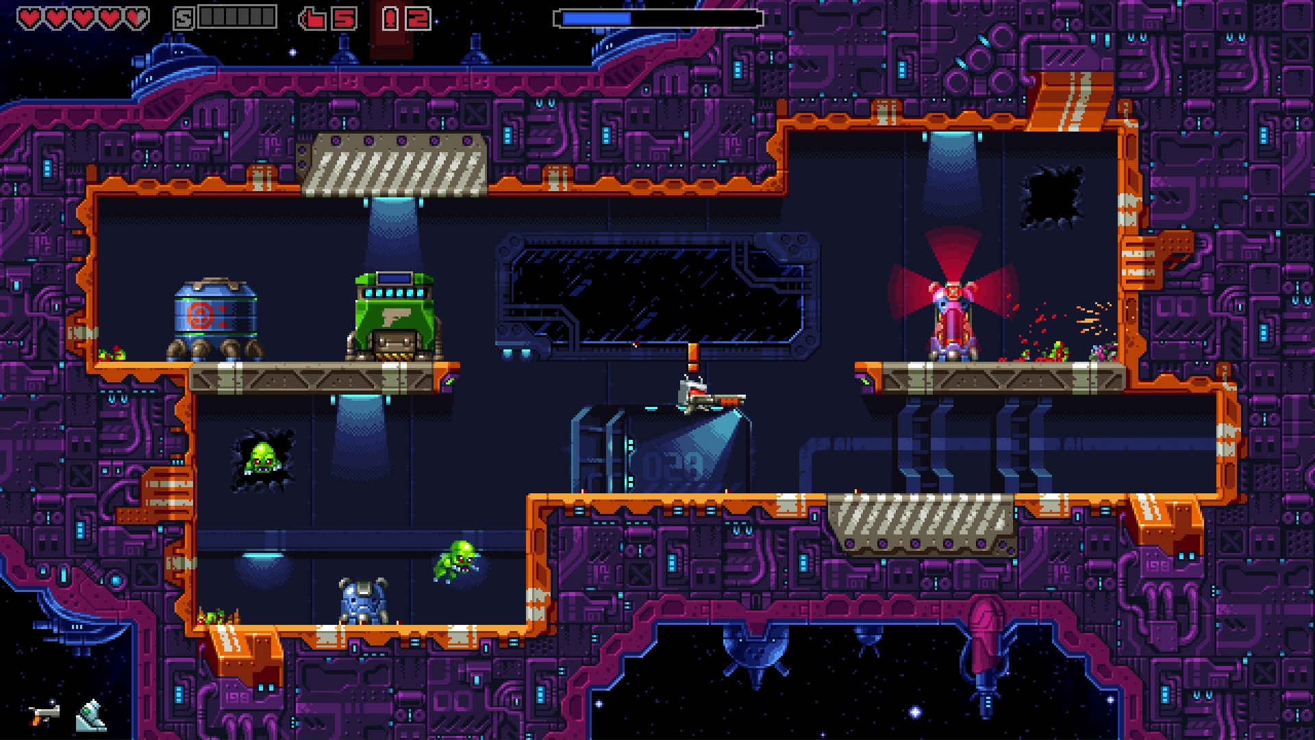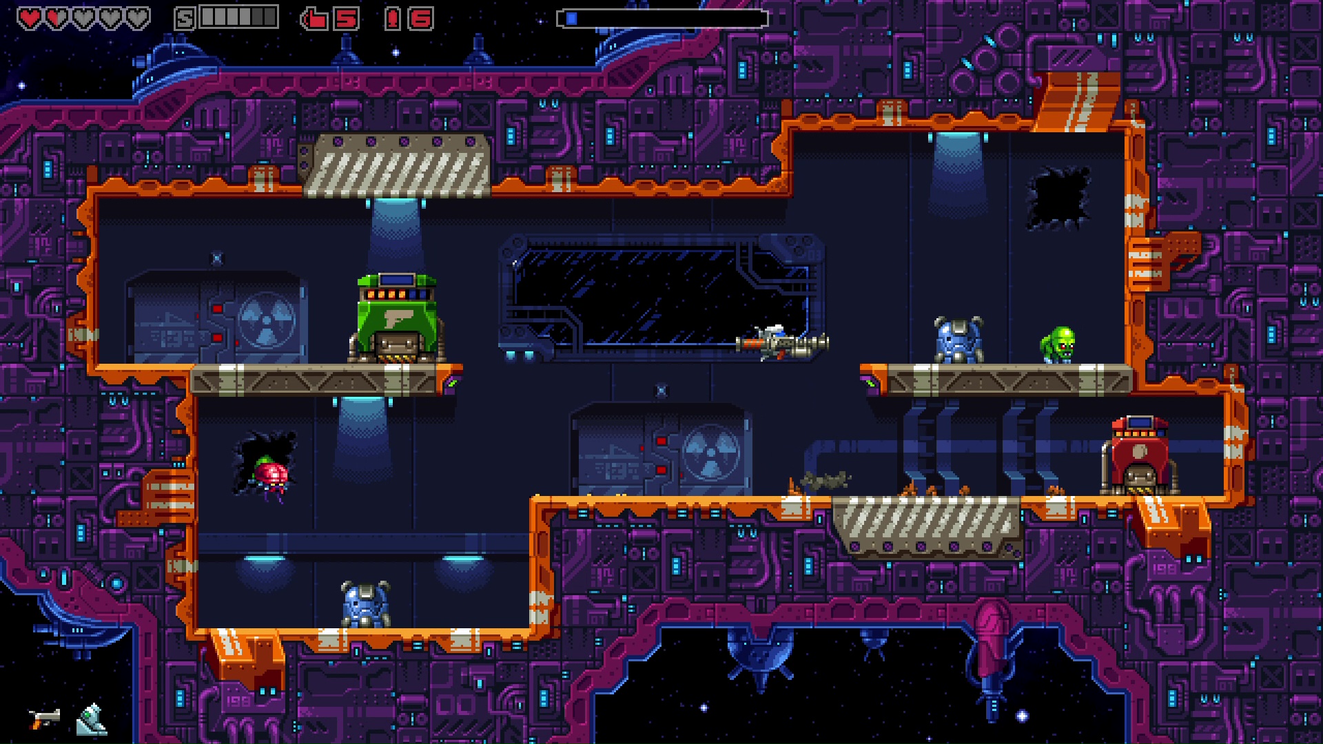 Rozpoczynając rozgrywkę kierowany przez nas robot nie jest wyposażony w jakąkolwiek pukawkę. Pierwszą broń zdobywamy podchodząc do generatora, tworzącego co kilkanaście sekund nową. Nie mamy żadnego wpływu na to, co otrzymamy. Możemy dostać zarówno karabin maszynowy, minigun, snajperkę, strzelbę, drążek pogo, czy wiele innych. Każdy rodzaj uzbrojenia posiada limitowaną ilość amunicji, po wyczerpaniu której musimy czekać, aż generator wytworzy coś nowego. W podobny sposób otrzymujemy m.in. bomby. Zwykle walkę zaczynamy przeciwko podstawowym, prostym do unieszkodliwienia przeciwnikom. Nie możemy jednak zwlekać z walką. Z czasem wrogowie ewoluują w silniejsze formy. Etap kończy się parę sekund po zestrzeleniu ostatniego kosmity. Co czwarty etap zawiera walkę z bossem, wymagającym zużycia znacznie większej ilości amunicji.