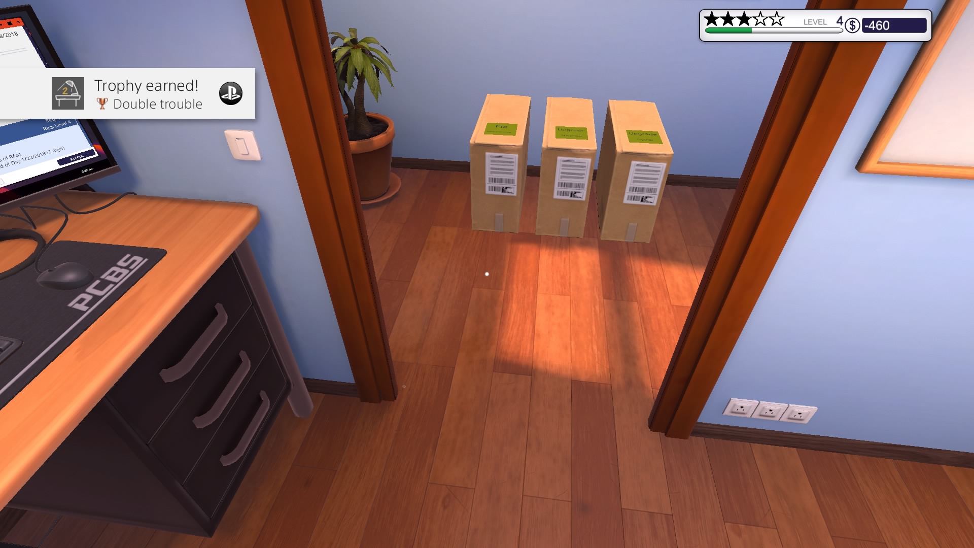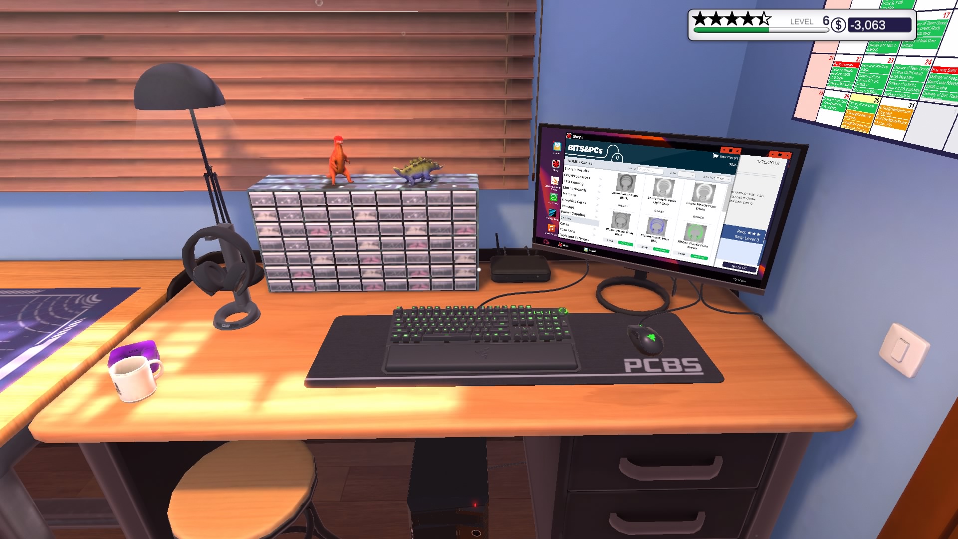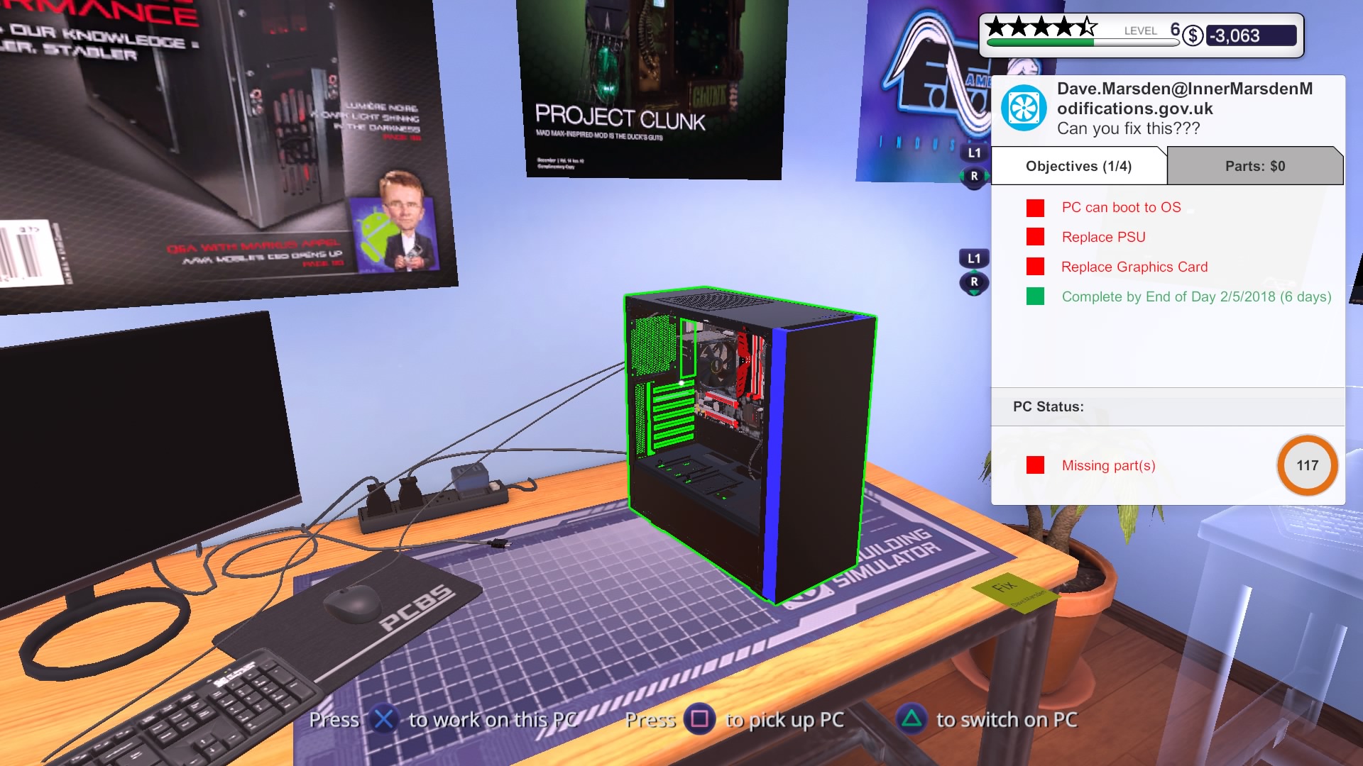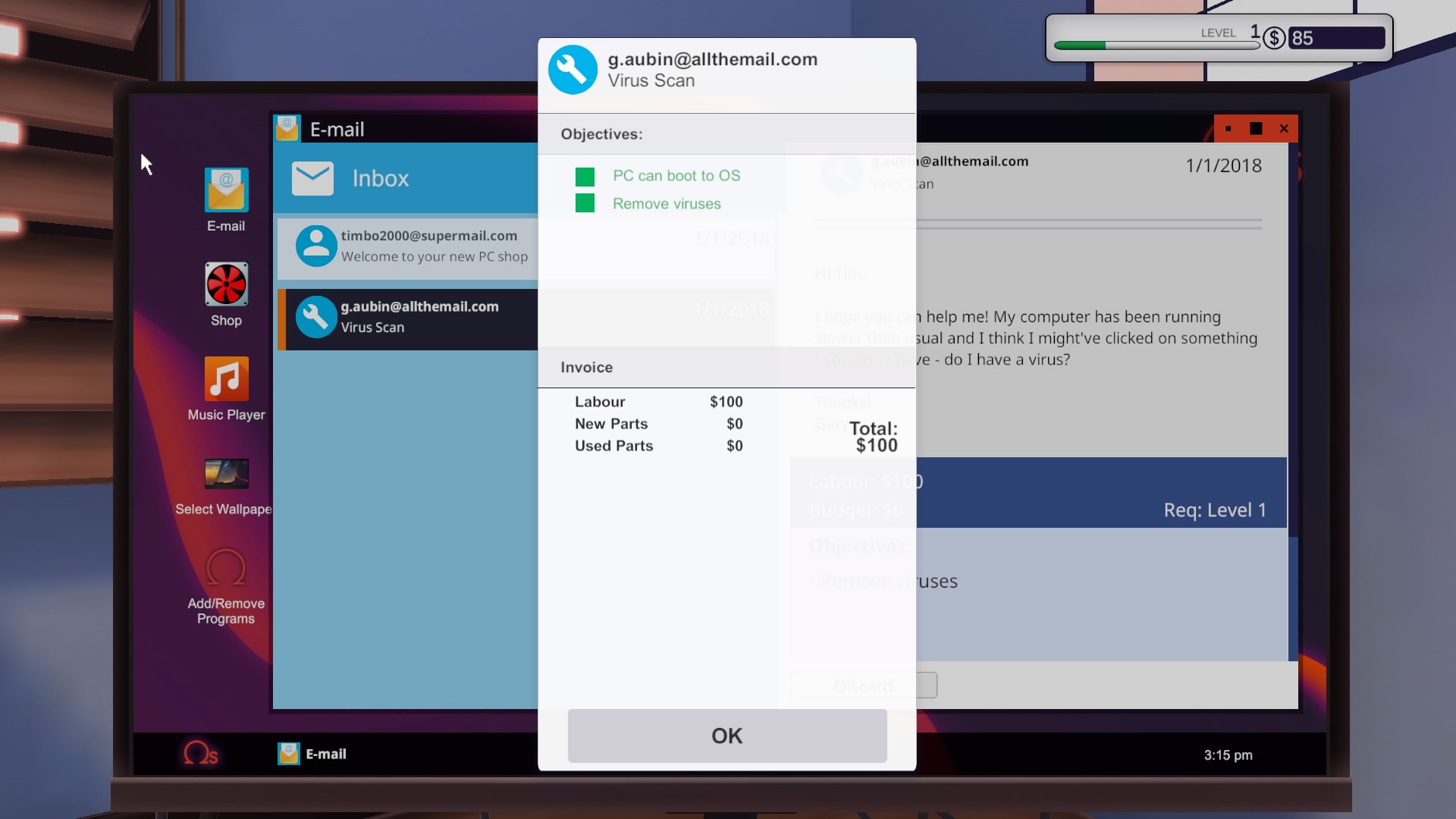 Grę zaczynamy od wejścia do naszego zakładu. Odziedziczyliśmy go po wujku. Nie jestem do końca pewien czy dokładnie wujku, ale nie ma to żadnego znaczenia dla “fabuły”. Obok naszego biurka i komputera znajdziemy w punkt odbioru paczek i jedno stanowisko robocze z myszką, klawiaturą i monitorem. Na samym komputerze mamy do dyspozycji sklep z częściami, email i klika programów diagnostycznych.