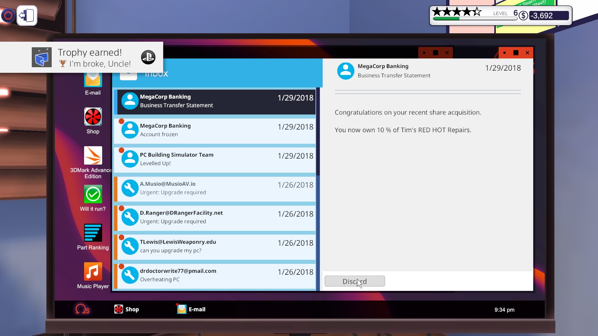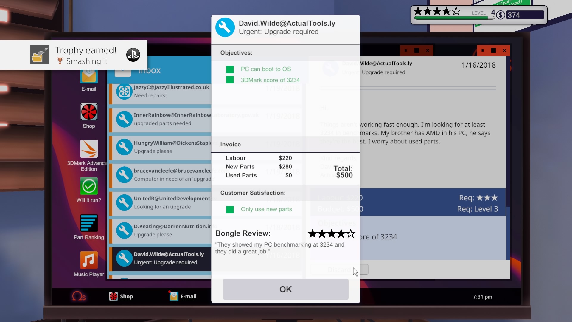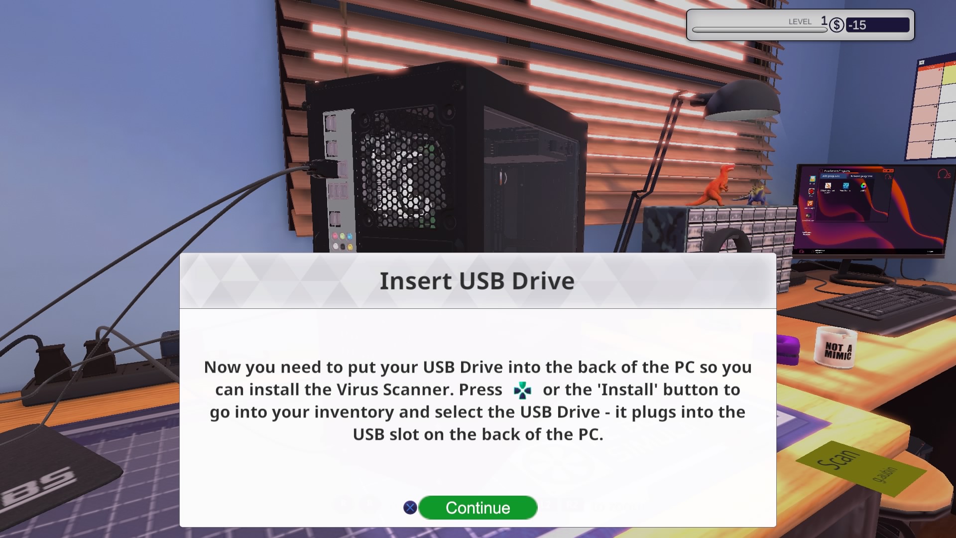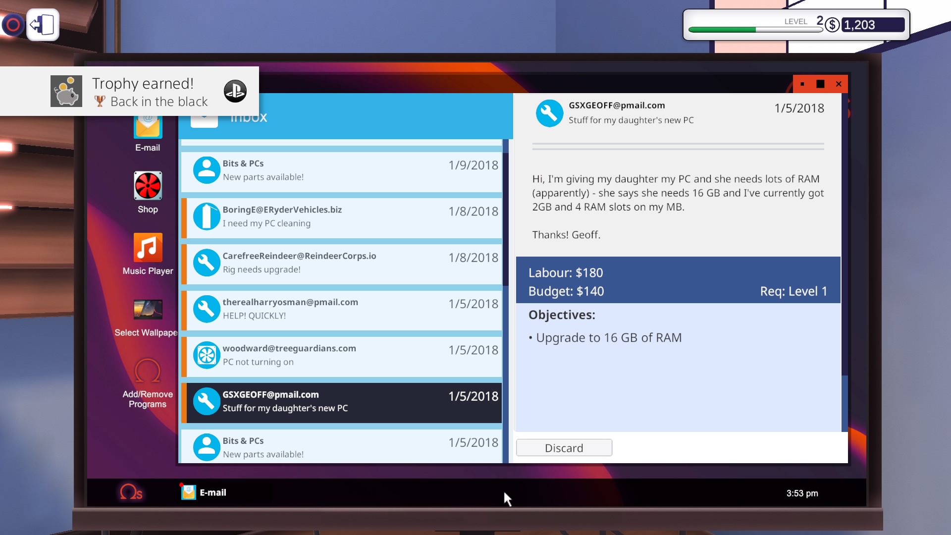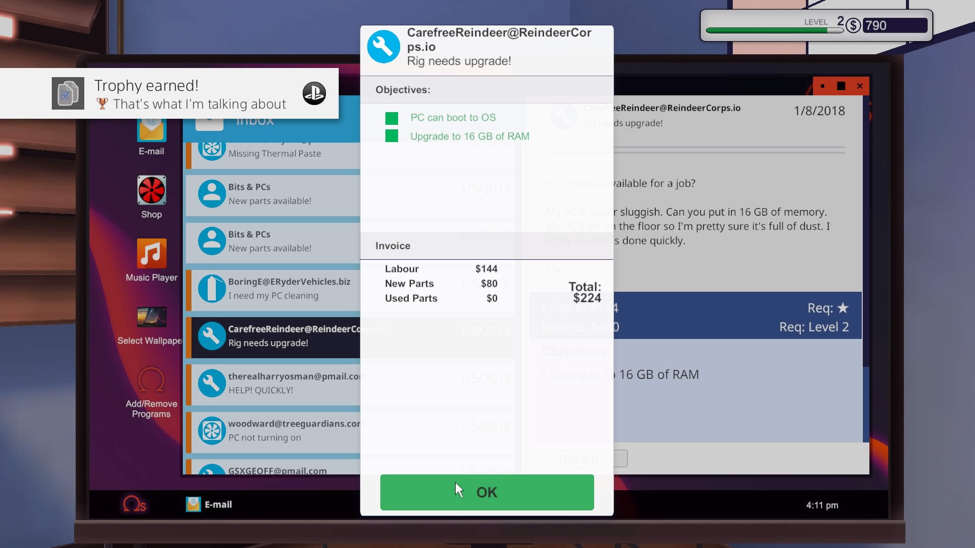 Grę zaczynamy od wejścia do naszego zakładu. Odziedziczyliśmy go po wujku. Nie jestem do końca pewien czy dokładnie wujku, ale nie ma to żadnego znaczenia dla “fabuły”. Obok naszego biurka i komputera znajdziemy w punkt odbioru paczek i jedno stanowisko robocze z myszką, klawiaturą i monitorem. Na samym komputerze mamy do dyspozycji sklep z częściami, email i klika programów diagnostycznych.