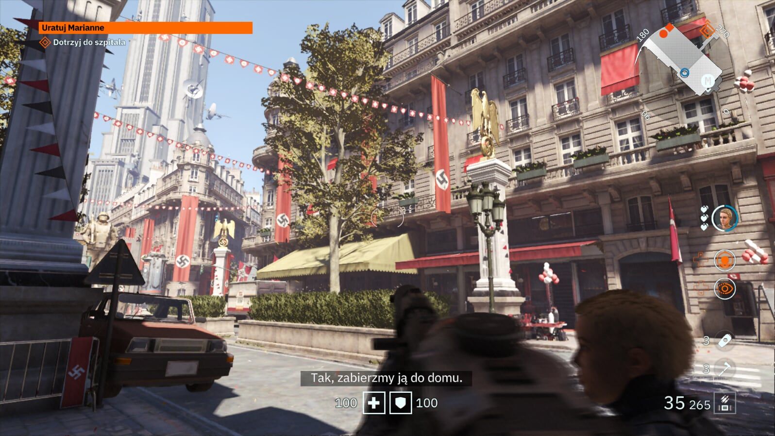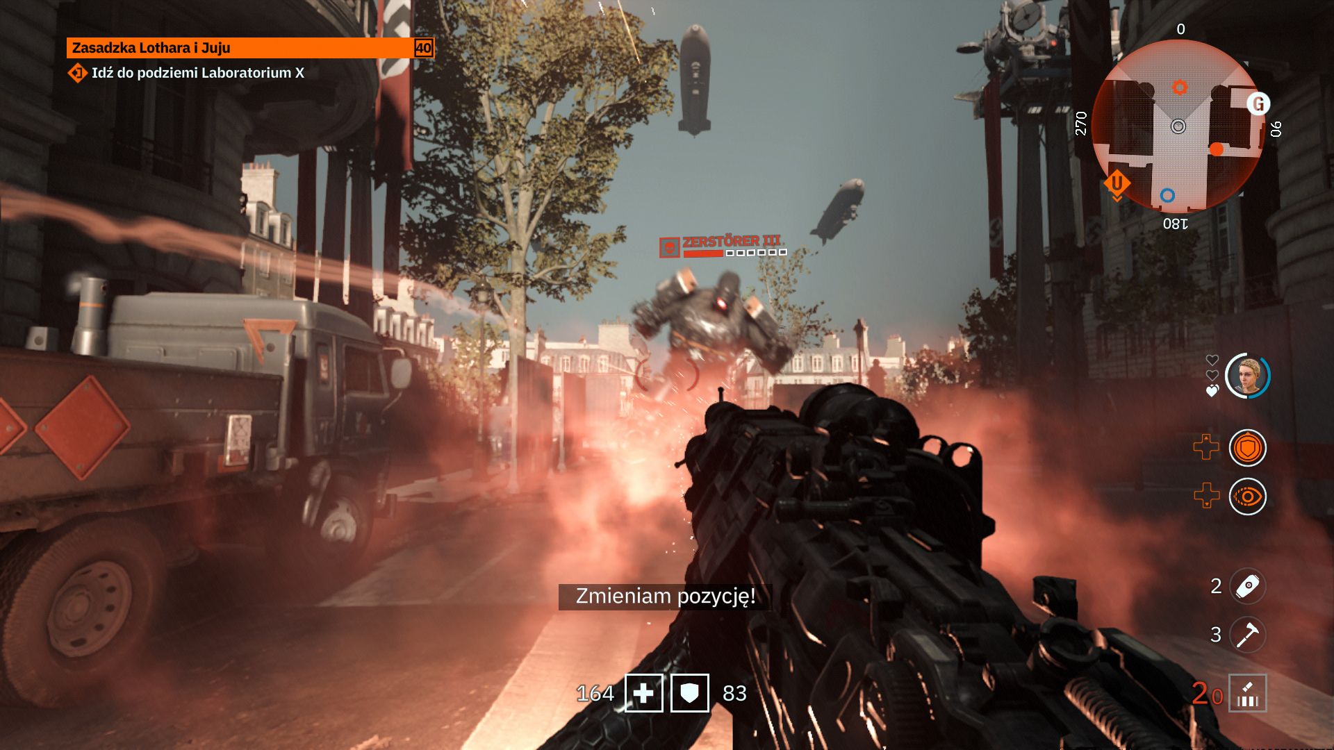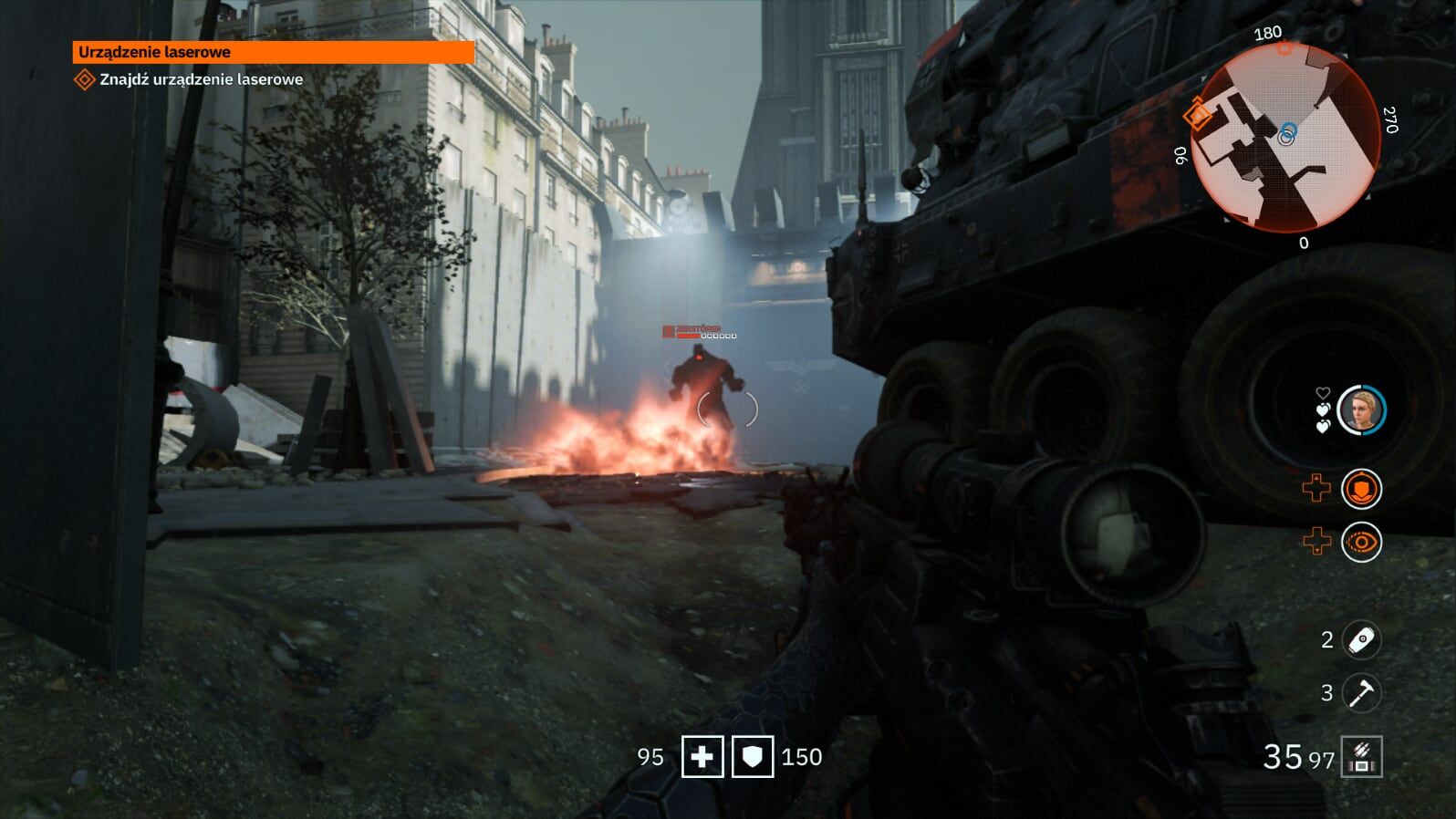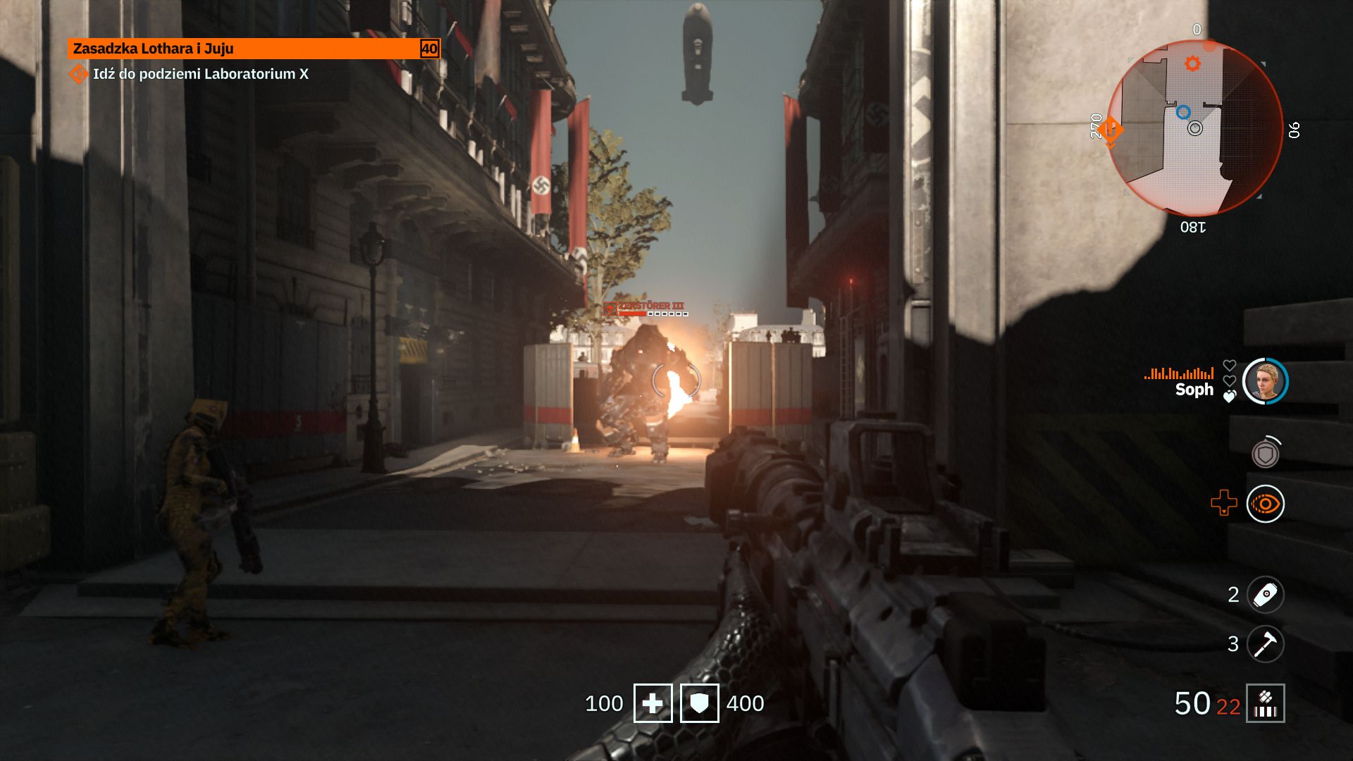 Fabuły w Youngblood tak naprawdę nie ma, a jak już coś chcecie z tej gry wyciągnąć, to musicie uważnie oglądać scenki przerywnikowe. Głównym zadaniem bliźniaczek jest sforsowanie trzech najpilniej strzeżonych dzielnic Paryża, które zostały nazwane Braćmi. Aby było śmieszniej, każdej z tych trzech dzielnic pilnuje ten sam duży nazistowski mech. Takiego lenistwa nie widziałem jeszcze w żadnej grze. Po wyeliminowaniu Braci zostajemy zaproszeni do walki z głównym przeciwnikiem, który jest niczym mały irytujący komar w grubym pancerzu, strzelający w nas laserami i rakietami. Gdzie te wielkie rozpadające się roboty z poprzednich odsłon Wolfensteina?