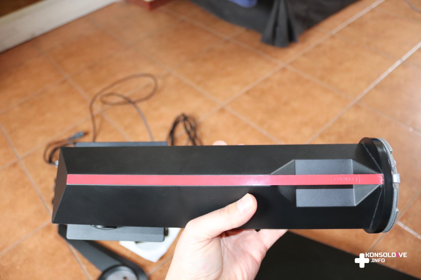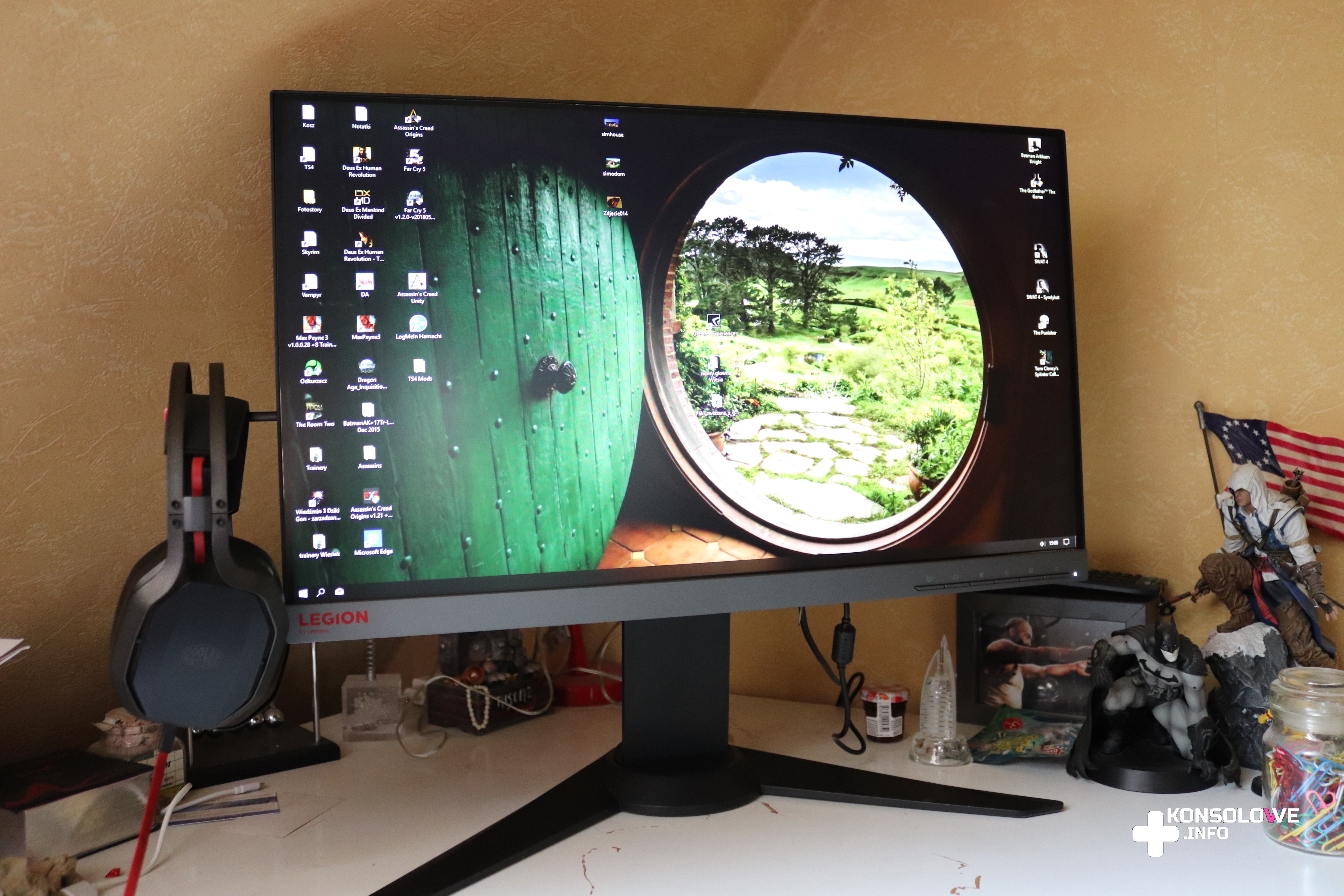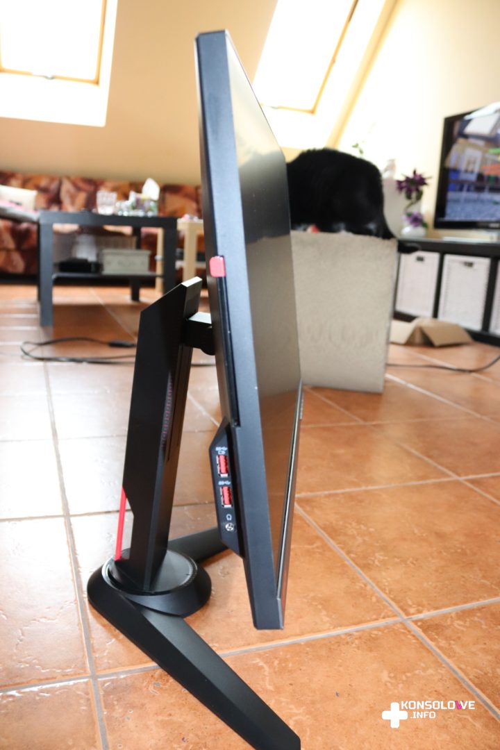 Nie mogę natomiast nie pochwalić łatwości regulacji nachylenia i wysokości monitora. Podczas testów z Lenovo Legion korzystałem na zmianę z moją żoną – będącą ode mnie o kilkadziesiąt centymetrów niższą. Nie było żadnego problemu z ustawieniem odpowiedniej dla nas wysokości – wystarczy złapać monitor jedną ręką i przesuwać go w górę lub dół, a prowadnica sprawnie utrzymuje monitor w dowolnej wysokości. Nie było też kłopotu z ustawieniem kąta nachylenia – tak poziomego, jak i pionowego. Muszę też wspomnieć o wbudowanym w monitor hubie USB – jeśli podłączymy go do komputera za pomocą odpowiedniego (dołączonego) kabla, dostaniemy dodatkowe 3 porty USB obsługiwane przez komputer. 2 porty znajdują się z lewej strony ekranu, zaraz obok gniazda słuchawkowego, a jeden umiejscowiony jest na tyle monitora, obok gniazda HDMI i niedaleko gniazda na Kensington Lock. Z pewnością występowanie tego ostatniego docenione zostanie chociażby w firmach, czy na imprezach masowych.