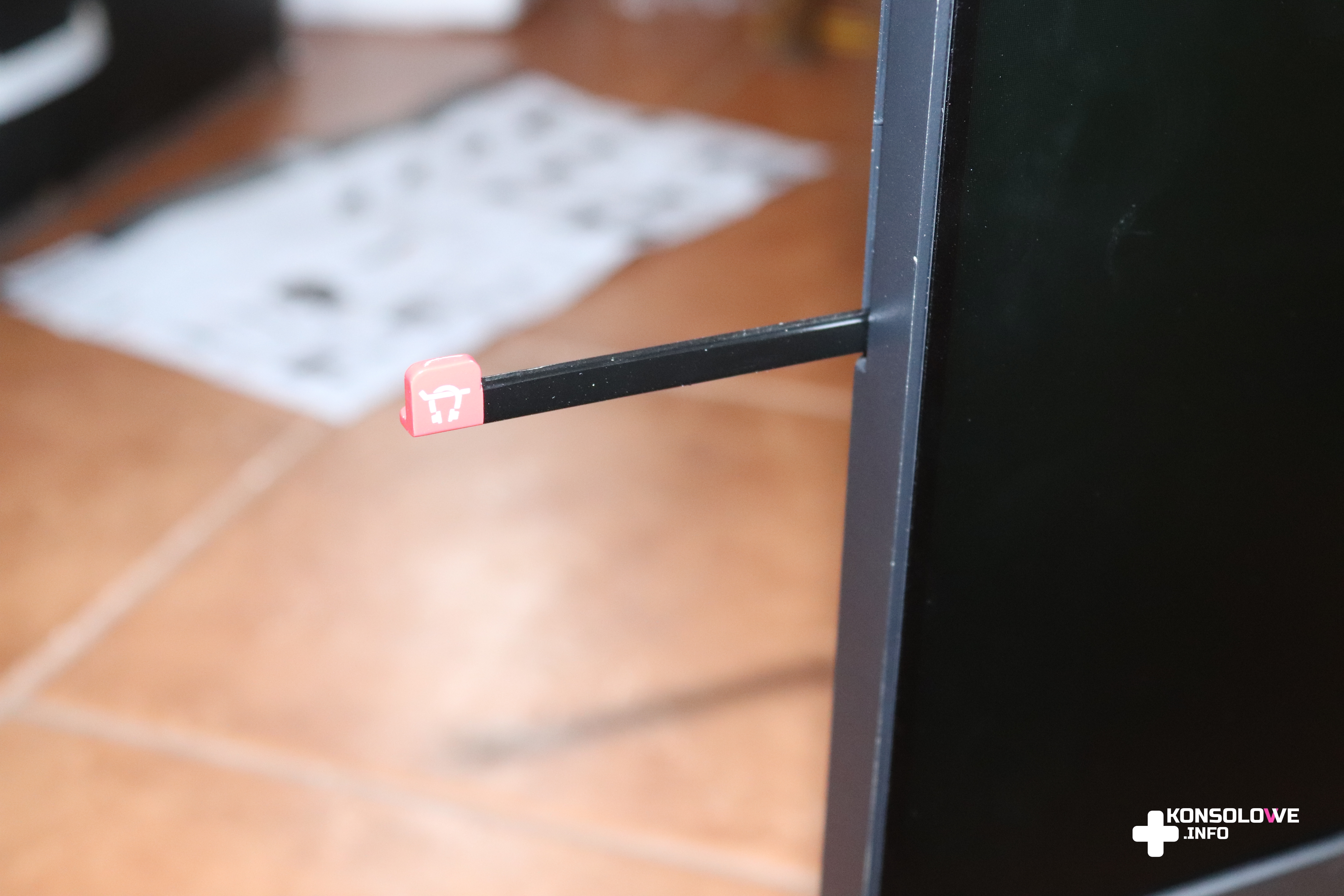 Pozostając przy obudowie, muszę wspomnieć o wysuwanym z lewego boku swojego rodzaju „wieszakiem” na słuchawki. O ile sam pomysł jest dobry, o tyle mam wątpliwości co do wytrzymałości tego elementu. Jest on zrobiony z plastiku, więc obawiałem się, że wyłamie się, jeśli powiesi się na nim ważące nieco słuchawki gamingowe. Lenovo mogłoby zastosować mocniejszy materiał (na przykład metal), a z przyjemnością wieszałbym na nim moje słuchawki. W obecnej formie wolałem odkładać je na biurku, aby nie ryzykować uszkodzeniem rączki. Trzeba też wiedzieć, że słuchawki są niezbędne – Lenovo Legion Y25F nie posiada wbudowanych głośników.
