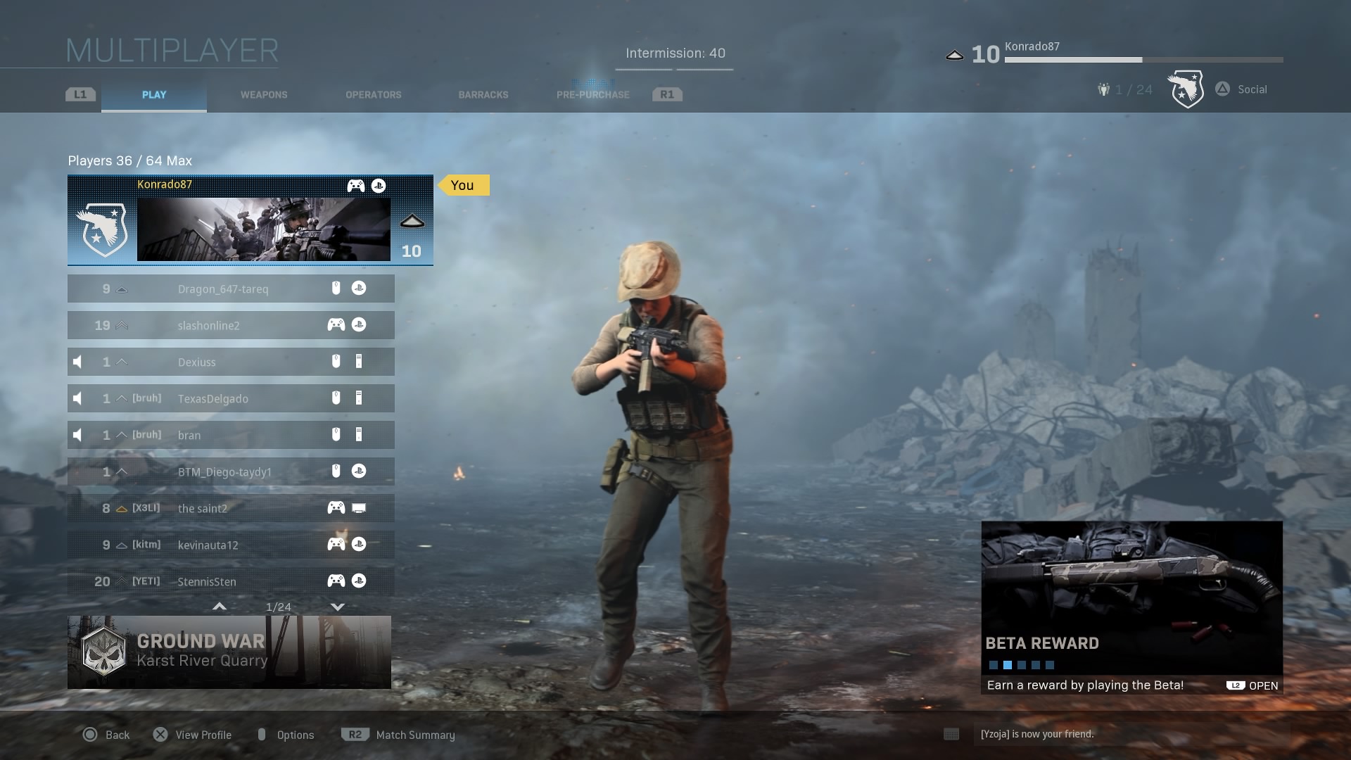 Przełomową nowością w trakcie beta testów było uruchomienie funkcji cross-play, która pozwala graczom PC, PS4 i Xbox One grać na jednym serwerze. Sprawdziłem i opcja ta działa bardzo dobrze. Grając np. na PS4, możemy w każdej chwili do lobby zaprosić znajomego, który gra na Xbox One lub PC, jednak musimy znać jego Activision ID, a najlepiej mieć taką osobę w znajomych na koncie Activision. Mając włączoną w opcjach wyszukiwania szybkiej gry opcję cross-play, godzimy się na grę z graczami na PC i Xbox One na jednym serwerze. Nie ma niestety opcji, aby wyszukiwało nam tylko graczy z Xboxa One. Oby w pełnej wersji dodano taką możliwość. Wielka szkoda, że w końcowej tabeli nie pokazano, kto na jakiej platformie grał.