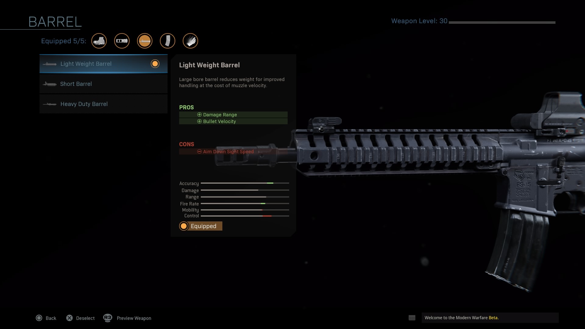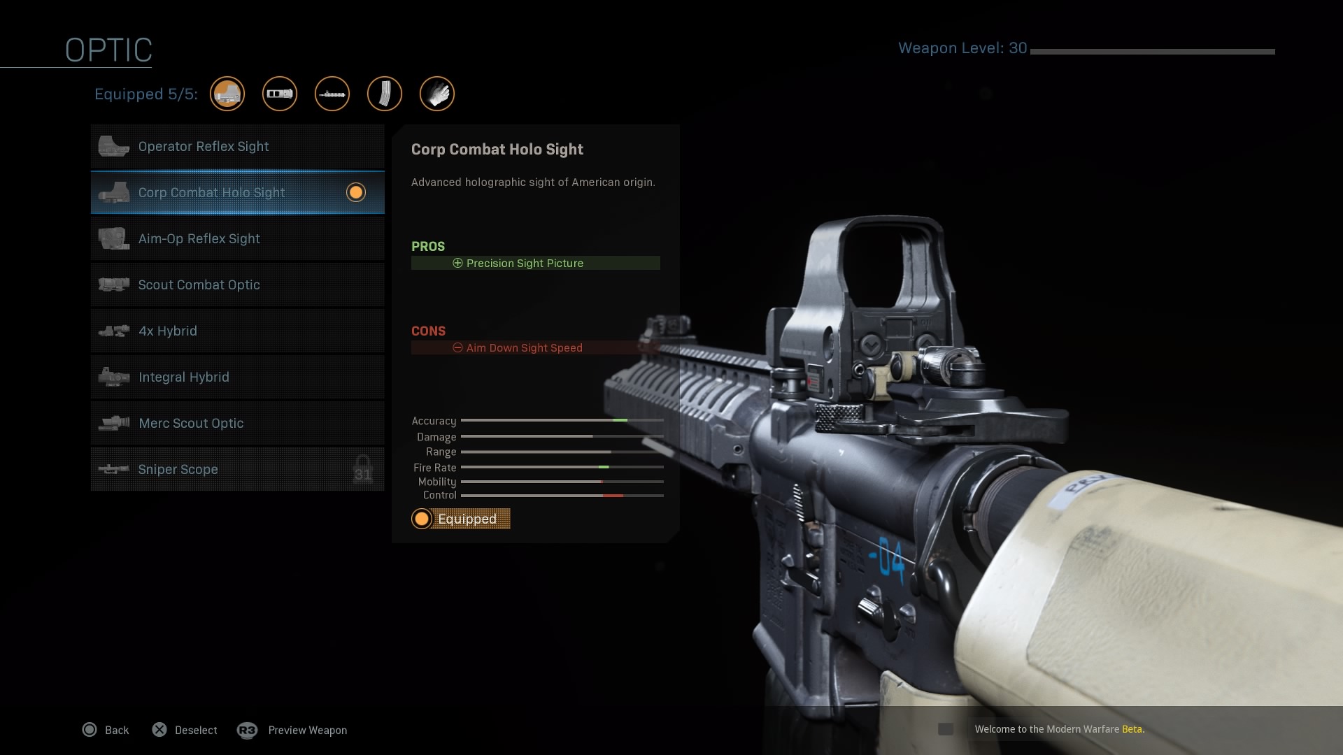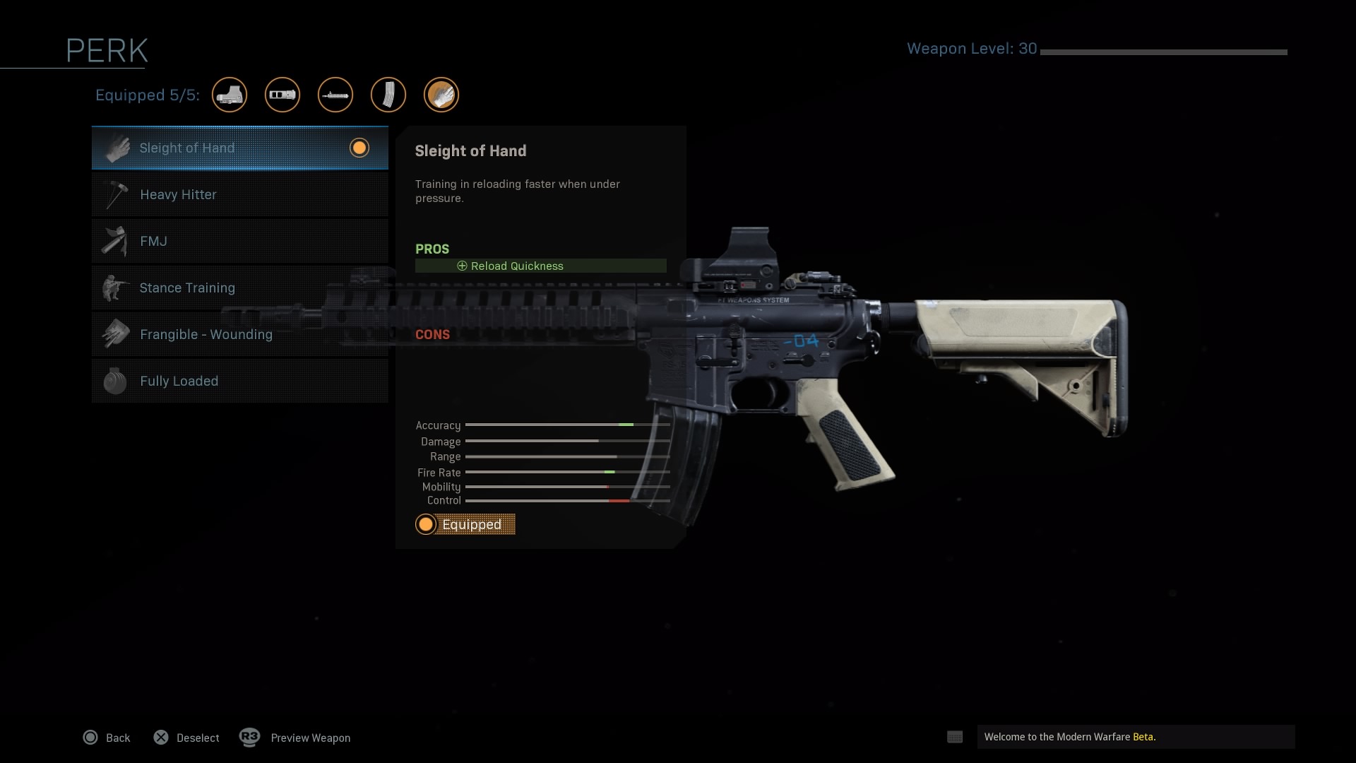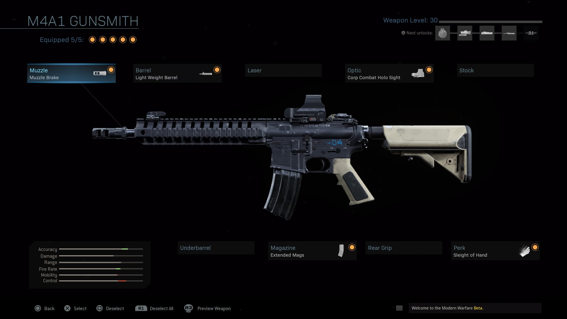 Słów kilka o Gunsmith, czyli popularnym miejscu, w którym możemy modyfikować nasze karabiny i pistolety. Broń, której używamy na polu bitwy zdobywa poziomu. Im więcej graczy zabijamy, tym szybciej awansujemy oraz zyskujemy kolejne dodatki do odblokowania. Przez ostatni weekend najlepiej strzelało mi się z karabinu szturmowego M4A1, którym wbiłem 30 poziom. Co mi się bardzo podobało, to to, że przez cały progres levelowania otrzymywałem nowe sloty do modyfikowania oraz nowe dodatki, które mogę zamontować. Większość z nich jest ukryta i dopiero gdy zbliżamy się do nowego poziomu, to możemy zobaczyć, co zostanie nam odblokowane. Wszystko, co wyżej objęte jest tajemnicą. Mój M4A1 z czasem dorobił się już 9 gniazd modyfikacji, jednak sama gra ogranicza nas tylko do pięciu, które możemy wykorzystać. Kapitalnym urozmaiceniem Gunshmita jest to, że dodatki na karabinach można zmieniać w trakcie bitwy. W każdej chwili możemy zmienić celownik, kolbę, czy perki na broni.