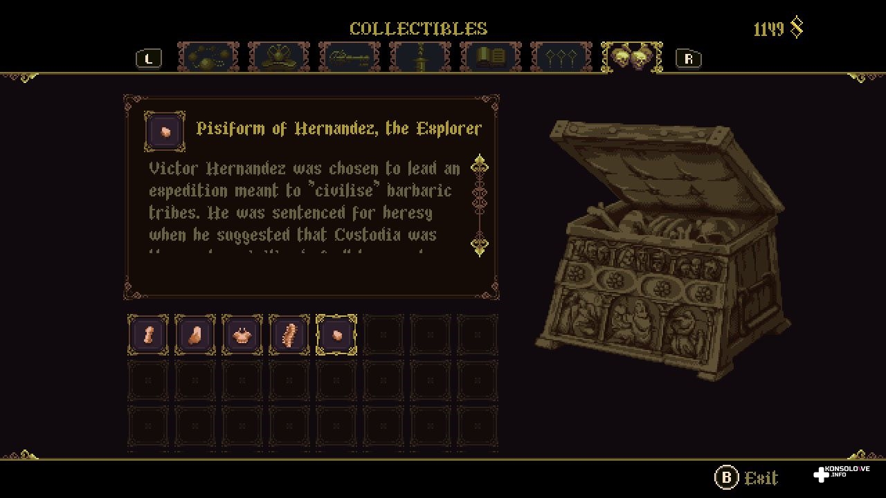 Blasphemous zawiera również mnóstwo elementów do odkrycia. Część łupów poszerza naszą wiedzę na temat otaczającego nas świata, jednak o wiele ciekawsza jest praktyczna część znajdziek. Niektóre z nich zwiększają bowiem nasze zdolności bojowe – powiększają nasz maksymalny poziom zdrowia lub zapewniają różnorakie profity. Zbierając różańce albo inne relikwie i ekwipując je możemy dłużej chodzić w toksycznych oparach, zwiększyć zadawane przez Mea Culpa obrażenia albo po prostu wymienić znaleziska u kupców. Sekretów jest cała masa w Blasphemous i na pewno każdy znajdzie takie przedmioty, które będą pasowały do jego stylu przechodzenia gry.