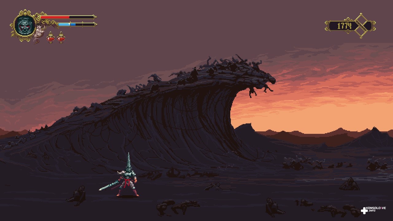 Szkoda jednocześnie, że nie pokuszono się o lepsze udźwiękowienie Blasphemous. Bardzo rzadko słychać muzykę podczas grania w hiszpańskie dzieło, a szkoda. Dobra muzyka mogłaby bardzo pozytywnie wpłynąć na klimat. Reszta dźwięków jest zaledwie poprawna i chociaż nie ma się tu do czego konkretnie przyczepić, to jednocześnie żaden dźwięk nie zapadł mi w pamięci. W produkcji występuje także powracanie do poprzednio odwiedzanych lokacji, co nie każdemu musi się spodobać. Zdziwiłem się za to, że bardzo przypadł mi do gustu styl wizualny produkcji. Pixel-art jest świetnie zastosowany, co widać zwłaszcza w przerywnikach filmowych. Nigdy nie byłem fanem „pikselozy”, a Blasphemous udowodniło, że można stworzyć bardzo ładną grę pozbawioną fotorealistycznej grafiki.