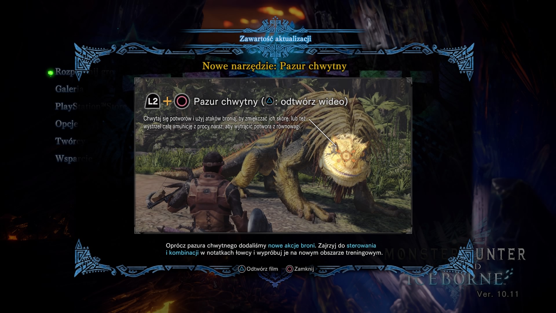 W starciu z potworami otrzymaliśmy nowy gadżet – pazur chwytny, który – jak sama nazwa wskazuje – służy do chwytania potworów, aby zadać im obrażenia, które zmiękczą ich skórę. Oczywiście trzeba wyczuć dobry moment. Najlepiej wskoczyć na zmęczonego już potwora, dzięki czemu prędko nas nie zrzuci i unikniemy obrażeń.