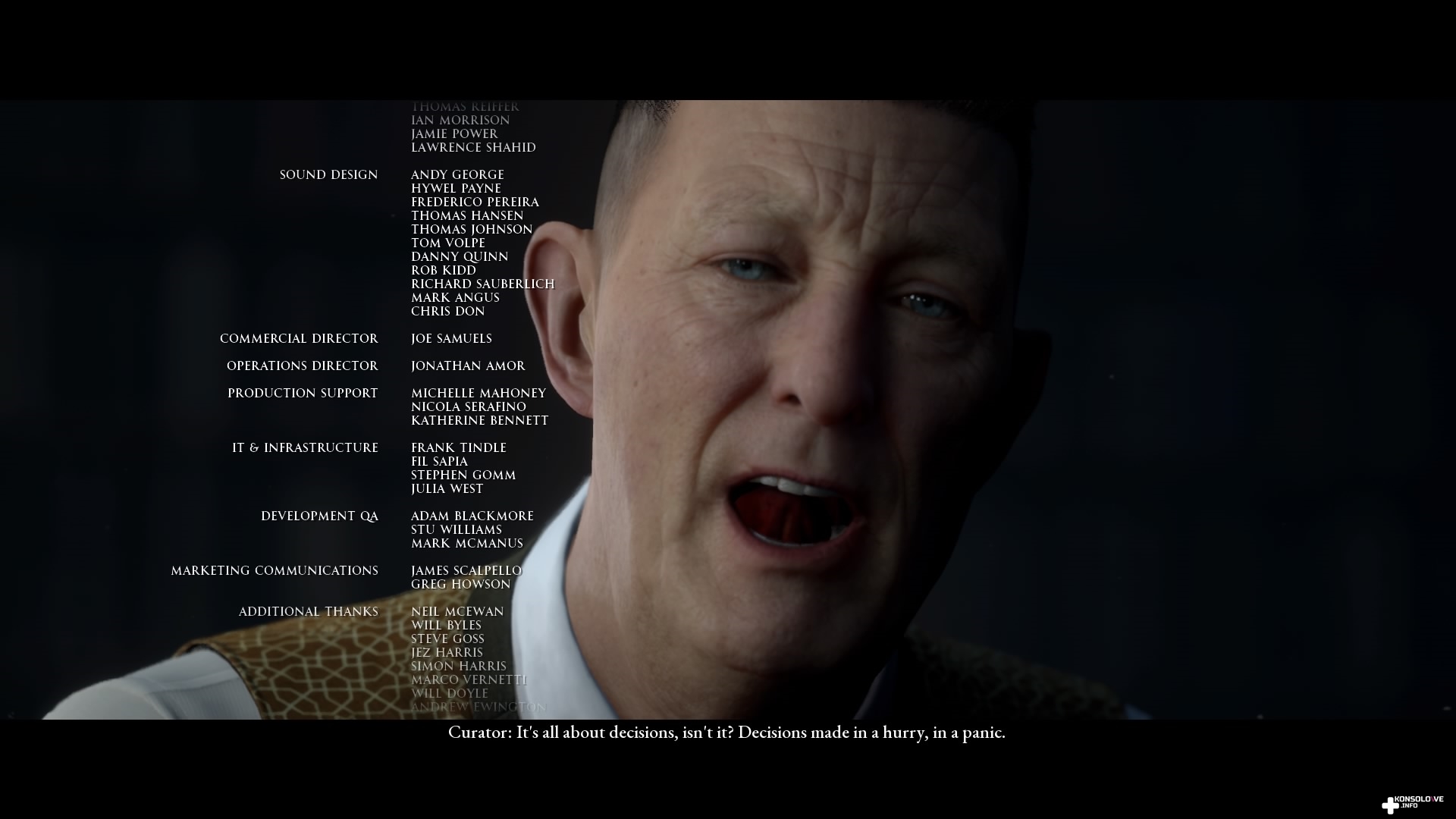 Mocnym plusem Man of Medan jest też postać określana jako The Curator. Mężczyzna ten każdorazowo burzy czwartą ścianę i wychodzi mu to naprawdę dobrze. Przyznam, ze nie spodziewałem się, że aż tak polubię Kuratora. Jest nieraz uszczypliwy, ale jednocześnie ciągle trzyma fason i jego przytyki potrafiły nierzadko wywołać uśmiech na mojej twarzy. Aktor, który wcielił się w Kuratora – Pip Torrens – zdecydowanie stanął na wysokości zadania, stając się jednym z najjaśniejszych punktów recenzowanej produkcji.