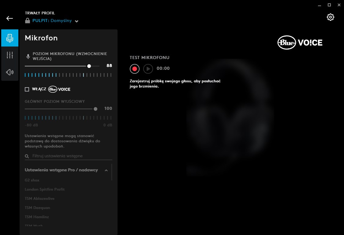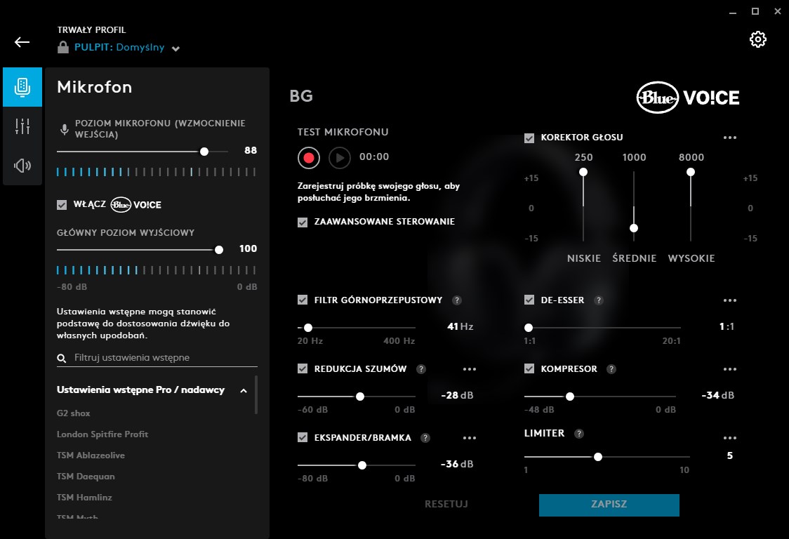 Technologia Blue VO!CE obejmuje korektor z regulacją, która umożliwia dostosowanie trzech częstotliwości pod względem: sygnału wyjściowego, częstotliwości docelowej i współczynnika Q, który określa ilość sąsiednich częstotliwości, na które ma wpływ częstotliwość docelowa. W nowej aplikacji G HUB znajdziemy – oprócz ustawień od profesjonalnych graczy – także takie przygotowane przez producenta mikrofonu. Ma to być wstęp do poznania technologii Blue VO!CE, tak, aby gracz znalazł swoją najlepszą konfigurację.