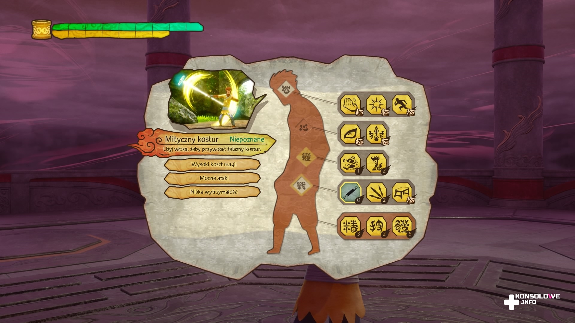 Jakby tego było mało, są jeszcze ataki magiczne. Wraz z postępem w fabule uzyskamy dostęp do specjalnych zagrań, wykorzystujących pasek energii magicznej. Wśród dostępnych ataków znajdziemy między innymi Żelazną igłę (Dasheng wyrywa sobie włos z głowy, po czym zamienia go w szereg igieł, którymi ciska w przeciwnika), Taniec fenghuanga (zapalający obszar dookoła nas), czy Nogi Qilina, dzięki którym wykonujemy druzgocącą sekwencję ciosów. Ataków jest oczywiście więcej i każdy z nich jest przydatny w określonej sytuacji. Możemy też przywołać ławę, którą następnie będziemy blokować ciosy i wyprowadzać swoje, a pod koniec gry zyskamy możliwość wykorzystywania (znalezionych, ale i przywołanych) kosturów. Monkey King: Hero is Back pozwala poczuć moc Małpiego Króla i oddaje do naszej dyspozycji tyle ruchów, że nie nudzą się one, ale i nie wydają się być wrzucone na siłę, byleby tylko były.