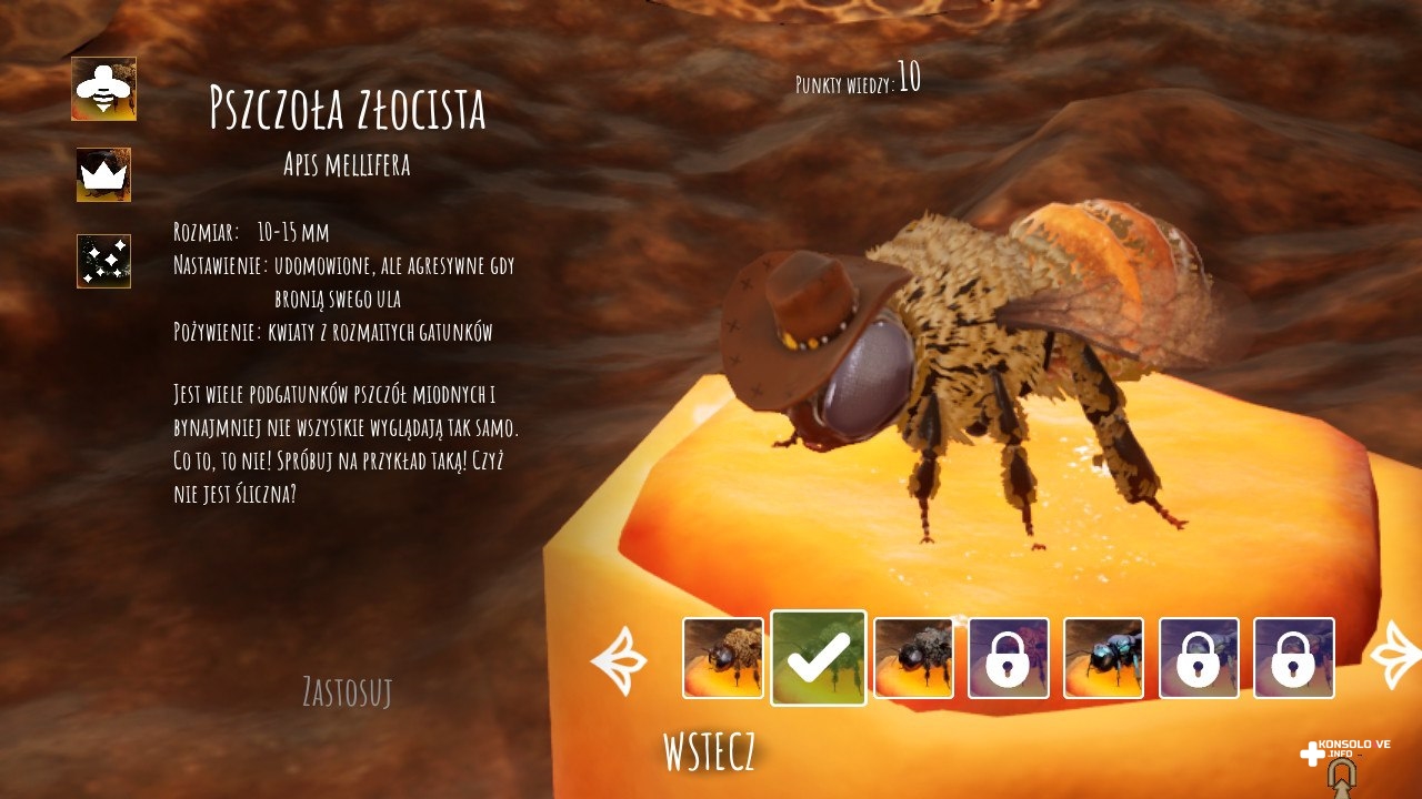 Bee Simulator to trudna w ocenie produkcja. Z jednej strony mamy dość ambitny projekt niewielkiego niezależnego studia, w którym łatwo można odnaleźć sporo zalet. Ekrany ładowania dostarczają informacji na temat zwyczajów pszczół, dzięki czemu można się o nich sporo dowiedzieć. Aspekt edukacyjny bez najmniejszych wątpliwości jest zaletą tytułu. Warto też wspomnieć o polskiej wersji językowej. Wydawca, CDP, stanął na wysokości zadania i nie znalazłem błędów językowych. A było co opisywać, bowiem w produkcji znajdziemy glosariusz, opisujący wiele roślin i rodzajów pszczół. Miłośnicy personalizowania wyglądu postaci również znajda coś dla siebie – za gromadzone pyłki możemy kupować nowe skórki, ślady ciągnące się za nami podczas latania, czy nakrycia głowy.