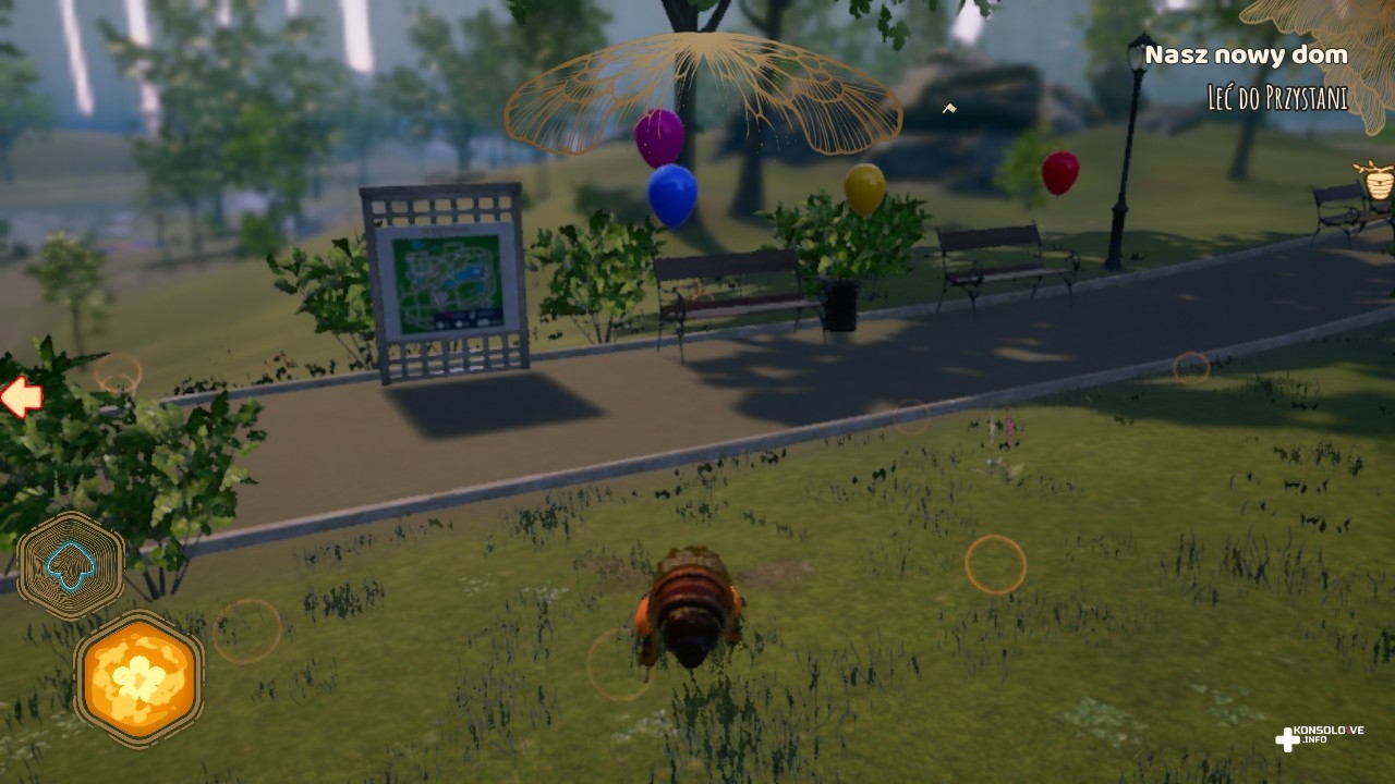 Brzmi to może trochę jak pszczele GTA, ale to tylko złudzenie. Co prawda w Bee Simulator występują misje poboczne, ale mimo tego nie da się oprzeć wrażeniu, że to główne zadania są najważniejszym, co przygotował polski producent. Jako B. B. będziemy zbierać pyłek, ale i walczyć, brać udział w wyścigach, czy też… tańczyć. Zbieranie pyłku jest i latanie są podstawowymi czynnościami w grze. Latanie jest zorganizowane poprawnie. Naciskając ZL obniżamy lot, natomiast wciśnięcie ZR powoli nam wzbić się wyżej. Prawa gałka analogowa służy do rozglądania się, a lewa do lecenia w kierunku, w którym ją wychylimy. W menu gry możemy dostosować czułość analoga, a także odwrócić osie poziomą i pionową, tak więc możliwości dopasowania sterowania pod swoje preferencje są w moim odczuciu wystarczające. Szkoda mi tylko braku wsparcia dla sterowania ruchowego. Wychylanie konsoli, czy samych kontrolerów joy-con w odpowiednie kierunki mogłoby korzystnie wpłynąć na doznania płynące z rozgrywki. Pozostając jeszcze przy sterowaniu, muszę pochwalić producenta za zaimplementowanie obsługi ekranu dotykowego konsoli – wybieranie opcji w menu ustawień, dotykając ich jest bardzo wygodne i w odczuwalnym stopniu zwiększa wygodę obsługi.