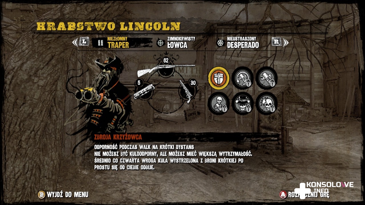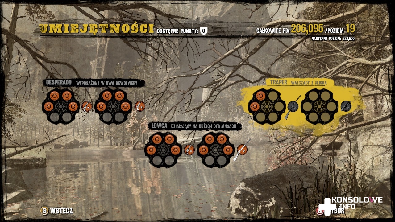Naszego bohatera zdecydowanie warto rozwijać. Pierwszą umiejętnością, jaką kupiłem było – należące do „drzewka” desperado – korzystanie z dwóch rewolwerów jednocześnie. Oprócz tego mamy tez „drzewka” łowcy i trapera. Ten pierwszy specjalizuje się w dystansowych atakach z wykorzystaniem różnego rodzaju karabinów, natomiast traper preferuje zabójcze z bliska strzelby. Co istotne, nie ma tu niepotrzebnych umiejętności. Każda wydaje się przydatna, więc niekiedy trzeba będzie się zastanowić, czy lepiej najpierw zainwestować w desperado, czy trapera.