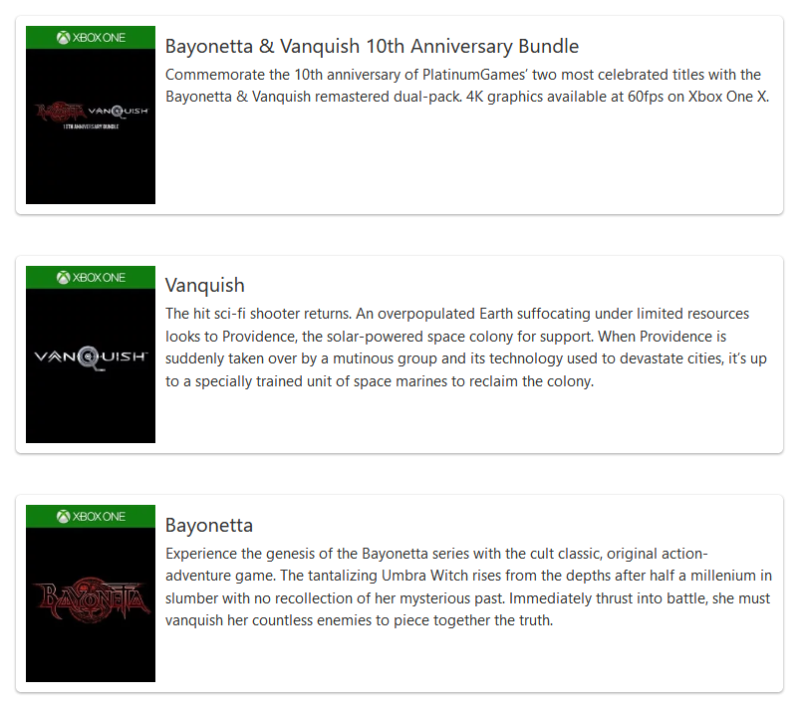 Oto świetna informacja dla fanów studia PlatinumGames Inc.! W Microsoft Store pojawiły się zakładki z grami Vanquish i Bayonetta. Tytuły będzie można kupić osobno, albo w pakiecie “Bayonetta & Vanquish 10th Anniversary Bundle”.