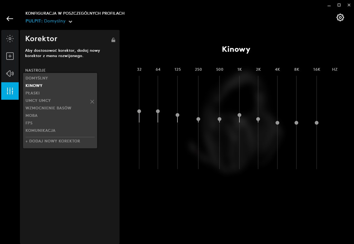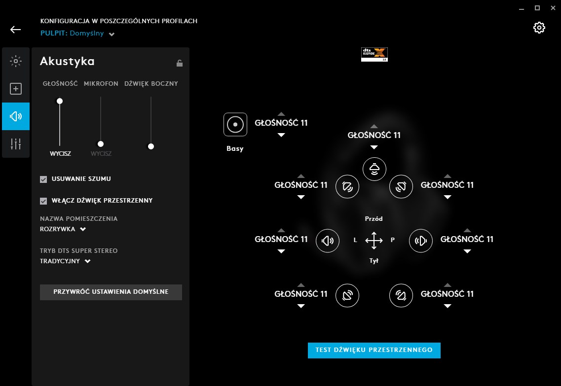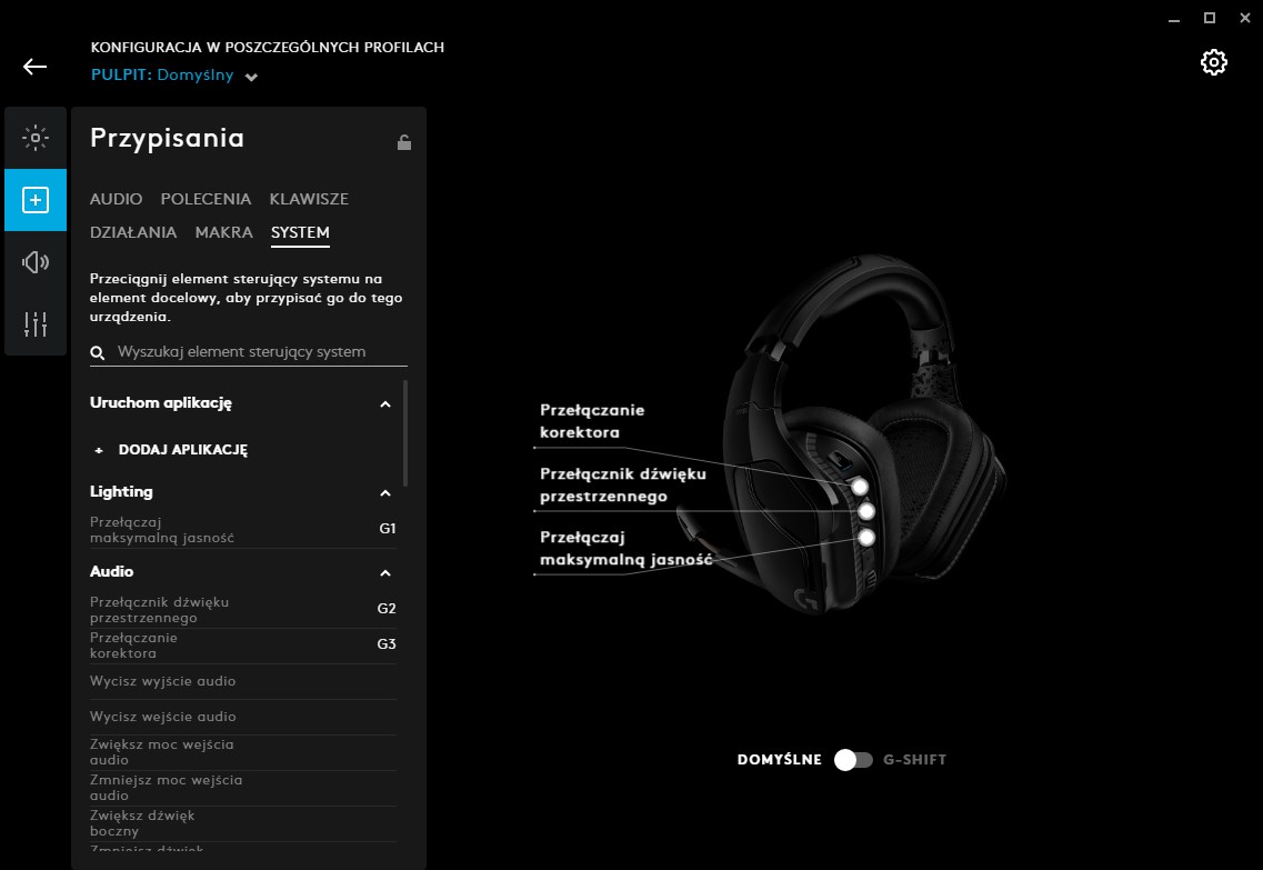 Podobnie jak w przypadku Logitech G Pro X, całe centrum dowodzenia zestawie G935 znajduje się na PC w aplikacji Logitech G HUB. To w niej sprawdzimy dokładnie stan naładowania baterii i ustawimy rożne efekty podświetlania dla technologii Lightsync. Możemy tutaj także przygotować ustawienia dla trzech luźnych przycisków G1 do G3. Domyślnie G1 przełącza korektor dźwięku, G2 przełącza dźwięk przestrzenny, a G3 kontroluje jasność lub wyłącza podświetlanie. W czwartej zakładce mamy ustawienia od akustyki. To tutaj włączamy i wyłączamy dźwięk przestrzenny oraz regulujemy głośność dla każdego z wirtualnych kanałów dźwięku.