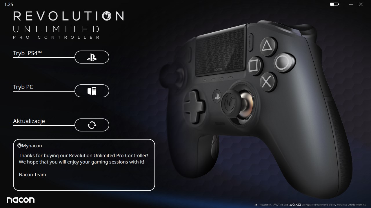 Kontroler Nacon Revolution Unlimited Pro oferuje trzy tryby pracy, które wybieramy ustawiając trzy-poziomowy przełącznik umieszczony pod spodem kontrolera w konkretnej pozycji. Wybranie ustawienia “PC” daje nam dostęp do używania kontrolera z komputerami wyposażonymi w system Windows. Kluczowe dla konsolowych graczy są pozycje 1 i 2. Na “jedynce” Nacon Revolution Unlimited Pro działa jak normalny DualShock 4, który nie ma co prawda głośniczka i lightbara, ale za to posiada wbudowany czujnik ruchu, więc gry wymagające wychlania kontrolera, jak chociażby ostatni hit Hideo Kojimy – Death Stranding działają bez problemu. To duża zaleta, którą nie mogą się pochwalić inne pro kontrolery. W okresie świątecznym całe Death Stranding przeszedłem, używając Nacon Revolution Unlimited Pro. Zajęło mi to 55 godzin i tutaj warto wspomnieć, że bateria wbudowana w kontroler wystarczy na około 7 godzin ciągłej rozgrywki z włączonymi wibracjami oraz podłączonymi słuchawkami. To bardzo dobry wynik. Oczywiście nie ma problemu, aby kontynuować zabawę, jednocześnie ładując kontroler kablem USB.