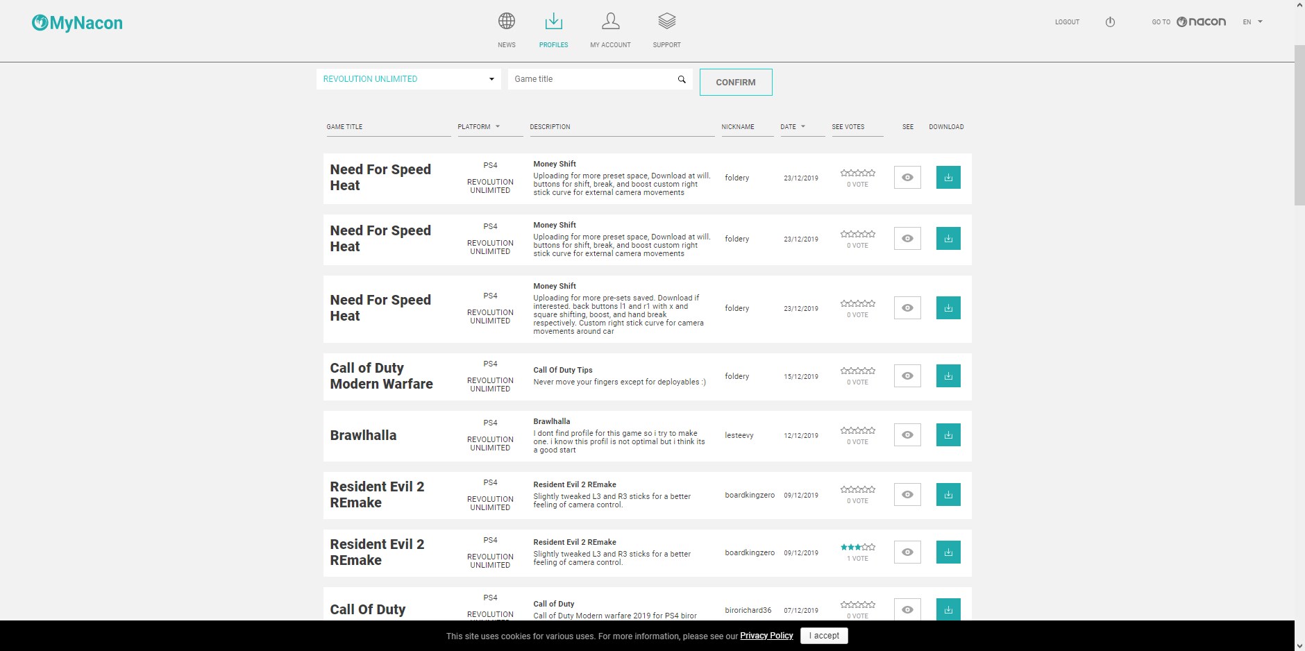 Wszystkie te zaawansowane ustawienia wprowadzamy oczywiście za pomocą aplikacji Revolution Unlimited Software na PC, która jest w polskiej wersji językowej. Oprócz budowania własnych profili możemy skorzystać z całkiem dużej bazy gotowych zestawów przygotowanych przez innych posiadaczy Nacon Revolution Unlimited Pro, którzy stworzyli całkiem fajne schematy do najpopularniejszych gier z 2019 roku, w tym: Sekiro, NFS: Heat, FIFA 20, Apex Legends, Call of Duty: Modern Warfare, Destiny 2 oraz wielu innych. O aktywności danego profilu informuje nas jedna z czterech prostokątnych diod, które znajdują się tuż pod panelem dotykowym. Profile natomiast zmieniamy za pomocą odpowiedniego przycisku na spodzie kontrolera.