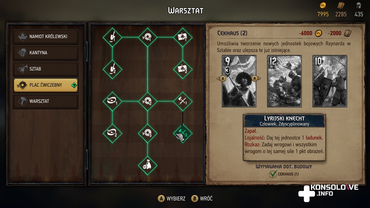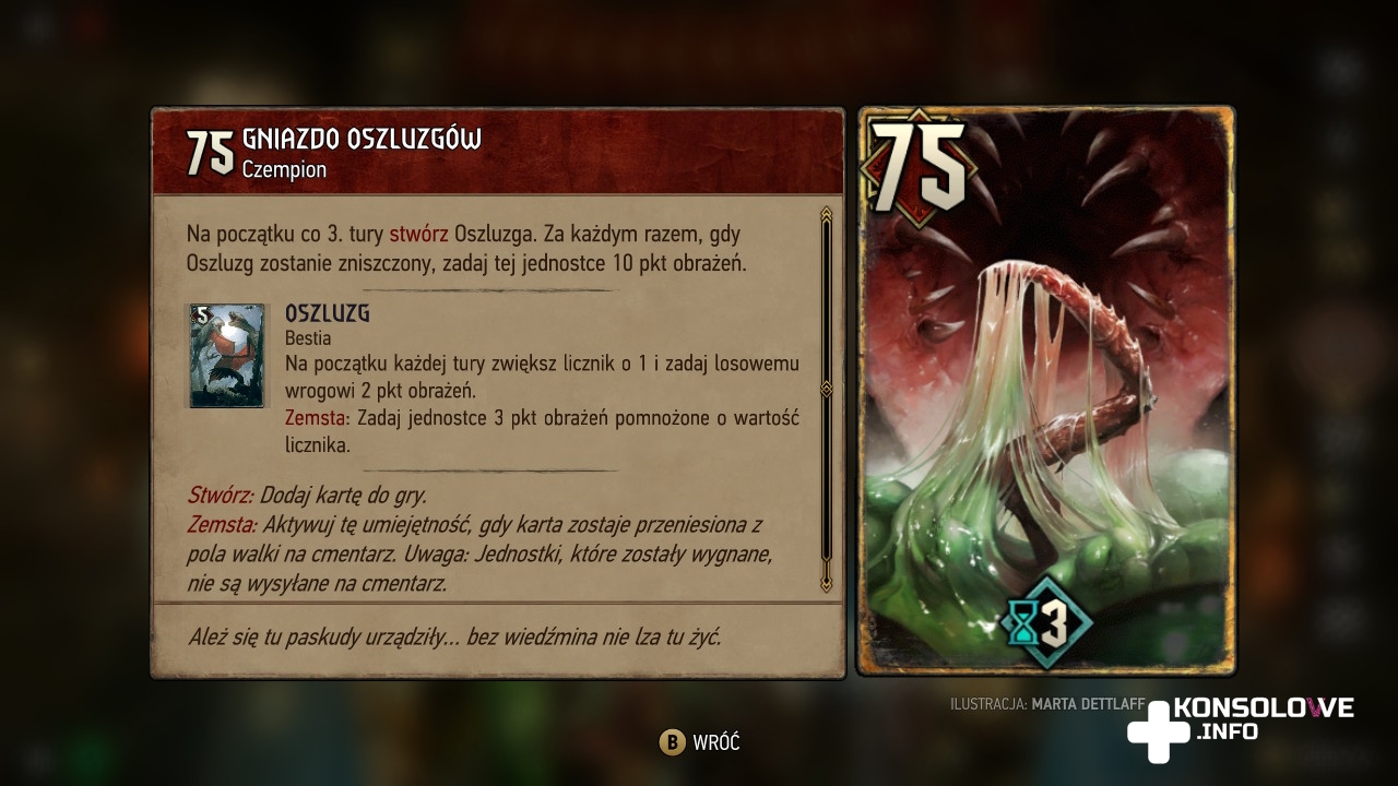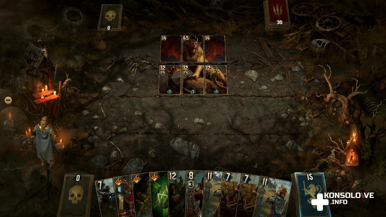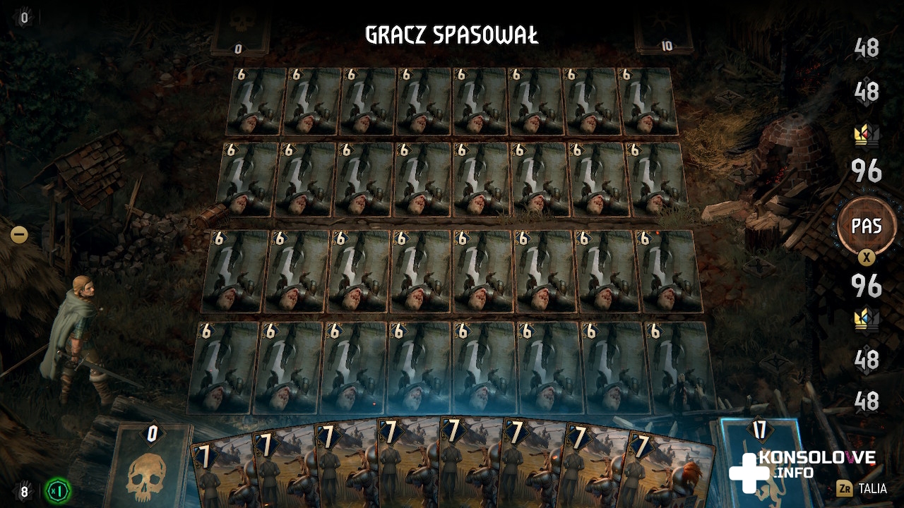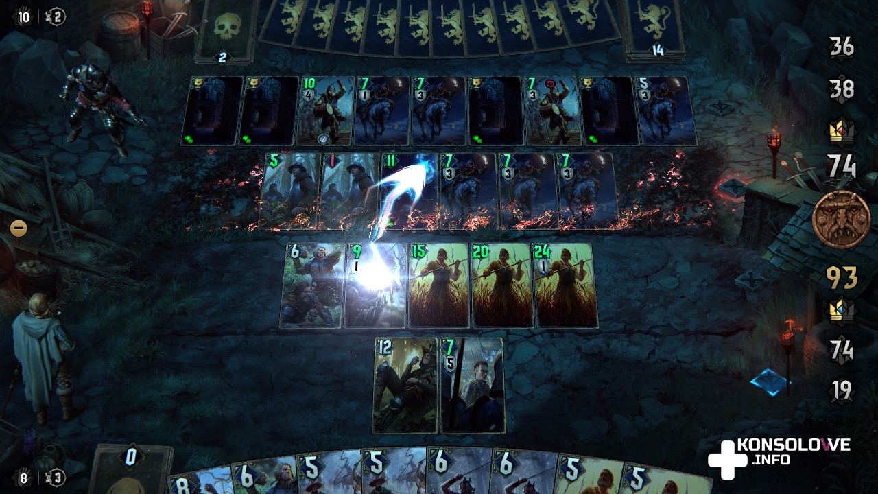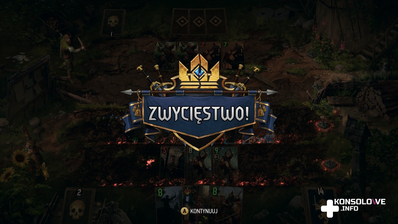 Celowo zaznaczyłem klasyczne reguły, bo nierzadko będziemy mieć do czynienia ze zmodyfikowanymi zasadami. Skrócenie rozgrywki do zaledwie jednej rundy, konieczność pozbycia się określonego przeciwnika, czy zadania wszystkim zadanej liczby obrażeń to tylko niektóre z celów, na które trzeba zwracać uwagę, walcząc w Wojnie Krwi: Wiedźmińskich Opowieściach. Mamy też starcia-zagadki, w których nie możemy dopuścić do śmierci określonej jednostki z naszej talii, musimy doprowadzić zepchnąć przeciwnika na tyły, czy ułożyć karty w określonej kolejności. Partie są bardzo wciągające, ale warto zwrócić uwagę na naszą talię i zostawić niektóre starcia do chwili, w której doczekamy się lepszego asortymentu kart. Niektóre walki są bardzo trudne. Jednak warto wspomnieć o zaimplementowaniu możliwości pominięcia dowolnego starcia. Opcja ta jest dostępna wyłącznie na najniższym poziomie trudności i po przegranej bitce pozwala ją pomijać, naciskając Y. To bardzo dobra opcja dla osób, którym zależy wyłącznie na eksploracja i poznawaniu historii.