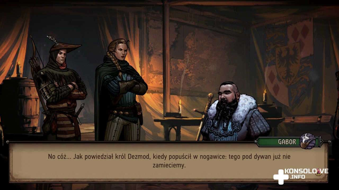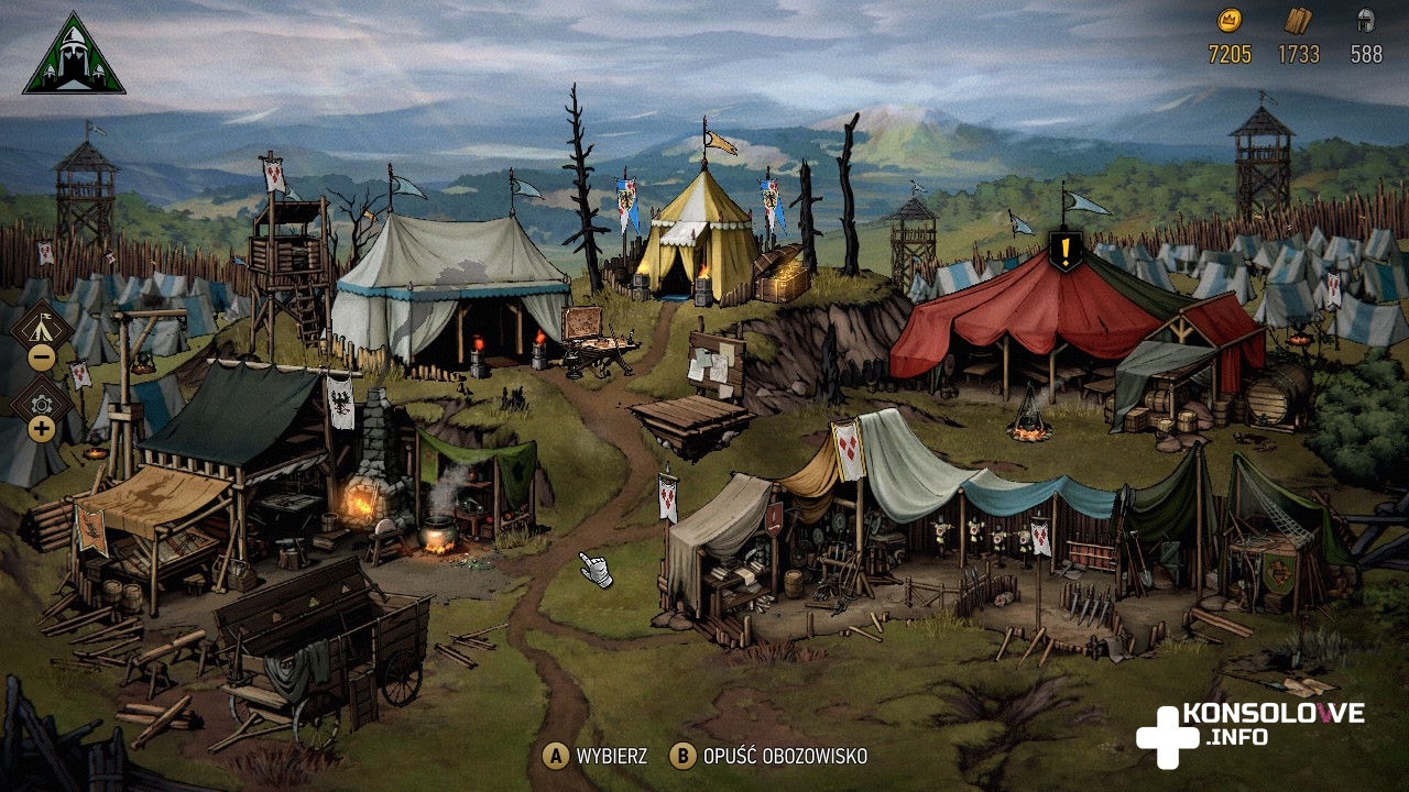 Wspomniałem wcześniej o obozie nie bez powodu. Naciskając minus na lewym joy-conie, przejdziemy do naszego obozu polowego. Możemy w nim na przykład porozmawiać z niektórymi z podróżujących z nami postaci. Da to nam dodatkowe informacje na temat ich historii, czy motywacji. Oprócz tego możemy rozwinąć umiejętności naszej królowej, sprawiając na przykład, że będzie się szybciej poruszała, czy zapewniając sobie premię finansową na koniec każdego starcia. Nie można też zapomnieć o możliwości tworzenia kart i wybierania układu naszej talii. Oprócz tego odblokujemy ulepszanie posiadanych kart i tworzenie lepszych ich wariantów, ale także opcję wysyłania zwiadowców (co pokaże na naszej mapie ciekawe miejsca), czy też kantor, w którym sprzedamy drewno i pozyskamy złoto bądź na odwrót. Rozwijanie obozu wciąga – tym bardziej, że im więcej ulepszeń zakupimy, tym więcej namiotów, kramów i stoisk w nim zauważymy.