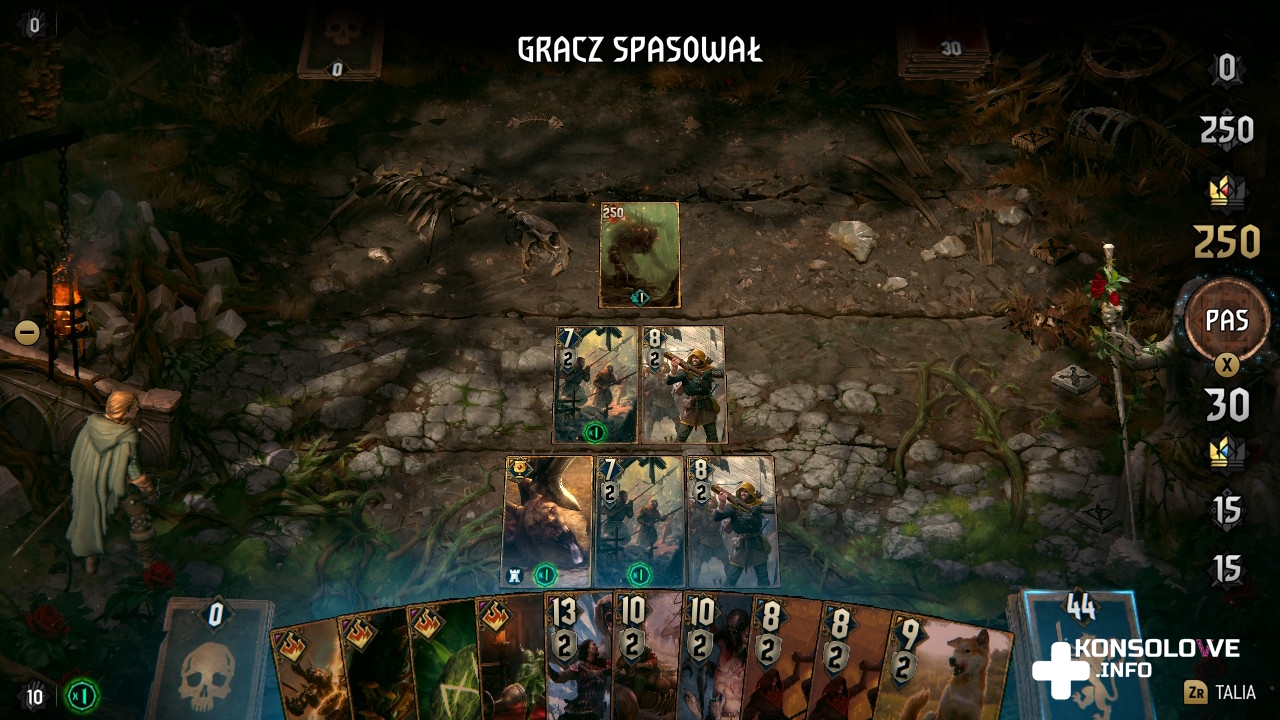 Wojna Krwi: Wiedźmińskie Opowieści bez wątpienia korzysta z poprzednich gier CD Projekt Red – Wiedźmina III: Dzikiego Gonu (moją recenzję wersji przeznaczonej na Switcha znajdziecie tutaj) oraz karcianego Gwinta. O ile jednak pełnoprawny Gwint był nastawiony na rozgrywkę wieloosobową, o tyle Wiedźmińskie Opowieści są przeznaczone tylko dla jednego gracza. Walki odbywają się na zasadzie partii wspomnianej gry karcianej. Ma ona proste, aczkolwiek wciągające zasady. Starcia odbywają się zawsze w układzie 1 na 1. Każda ze stron konfliktu ma kilka wierszy, w których może umieszczać swoje karty. Te opisane są przez 2 najważniejsze parametry: siłę ataku i obrony. Oczywiście im większa wartość obu tych parametrów, tym na ogół lepiej. Jest to jednak bardzo krzywdzące podejście, z którym nie wróżę sukcesów w wielu pojedynkach. Występuje sporo kart, które mimo niewielkiej liczby bronią się nakładanymi przez nie efektami. Na przykład możemy wykorzystać kartę, wykładającą wszystkie karty danego typu z talii, czy wzmacniająca siłę o 10 punktów. Warto też pamiętać, aby dbać o jak największą sumaryczną siłę – zawsze można zrezygnować z dalszego rozgrywania tury na rzecz spasowania. Wtedy zwycięstwo odnosi strona określana przez większą sumę. Do wygranej w klasycznej rozgrywce potrzebne są 2 z 3 zwycięstw.