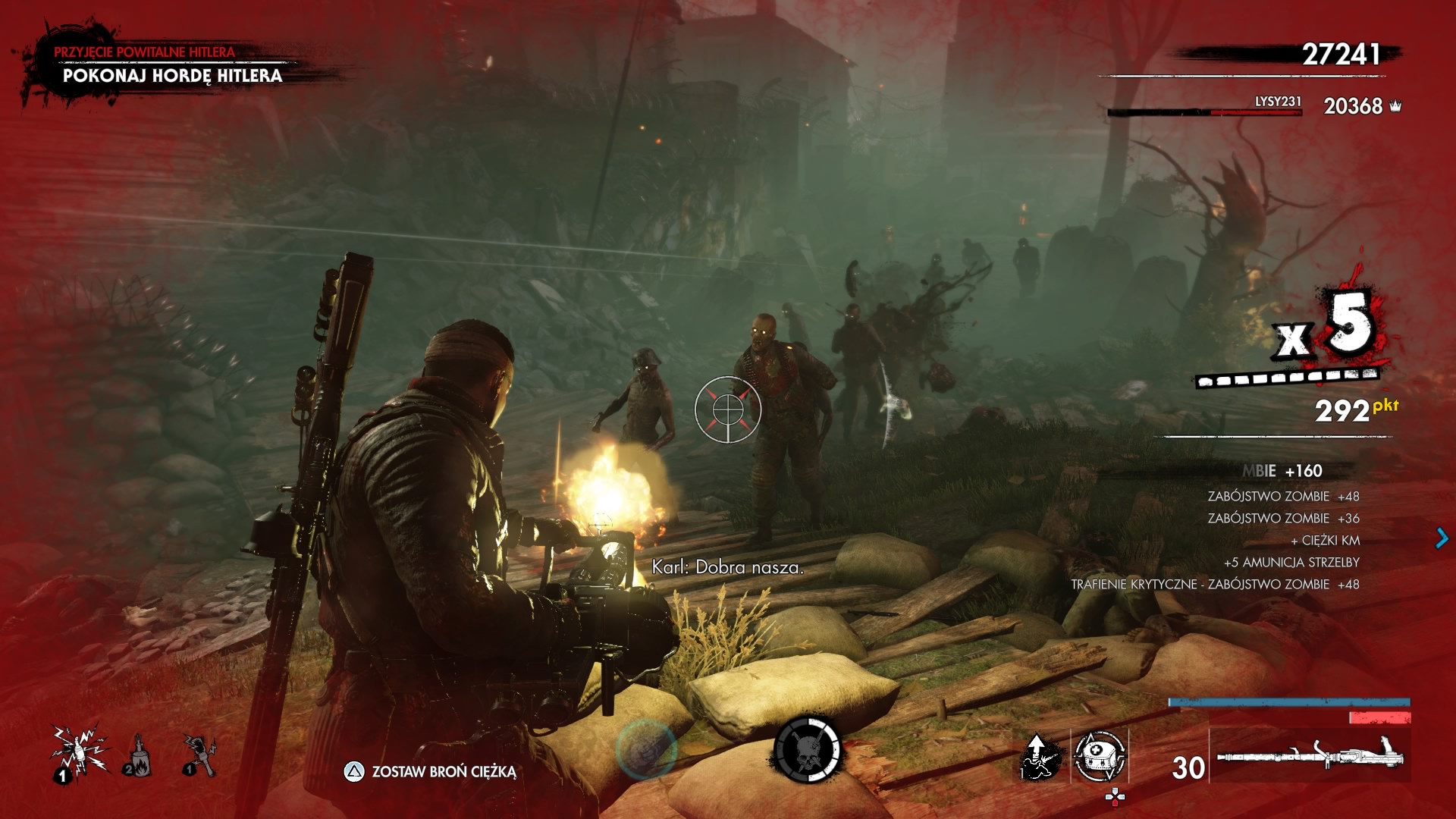 Z racji wszędobylskiego zdobywania punktów za styl, nie zabrakło prostego systemu rozwoju postaci oraz uzbrojenia. Ulepszenia dla naszego bohatera zdobywamy wraz z postępami w grze, wykonując specyficzne akcje, takie jak zabicie odpowiedniej liczby zombie granatem. System progresji naszych wojaków jest naturalny i kolejne perki możemy zdobywać po prostu grając. Nasz oręż natomiast wymaga specjalnych zestawów ulepszeń. Możemy je zdobyć w dwojaki sposób, albo przeszukując całą mapę w ich poszukiwaniu, bądź osiągając złote odznaczenie po każdym rozdziale. Osobiście uważam, że taki manewr jest ciekawy, ponieważ zachęca on gracza do jak najlepszej gry, oraz eksploracji lokacji, które niekiedy uderzają nas dobrze zrobionym horrorowym klimatem, kina klasy B.