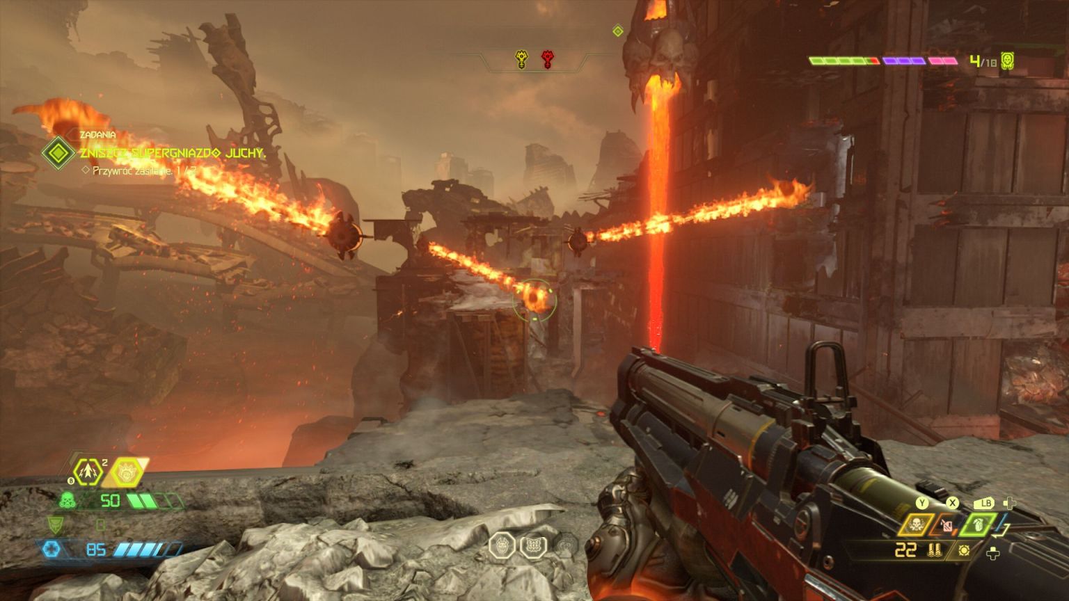 Pierwszą zmianą jest naturalnie silnik graficzny i sam wygląd gry. O ile w przypadku DOOM 64 mieliśmy co prawda do czynienia z poprawioną warstwą wizualną względem oryginału, o tyle nie można zaprzeczyć, że odstawał on od tego, do czego przyzwyczaiły nas „dzisiejsze” gry. DOOM Eternal wygląda świetnie i warto w niego zagrać choćby i dla samych doznań wizualnych. Więcej na temat grafiki w DOOM Eternal możecie przeczytać w recenzji Konrada.